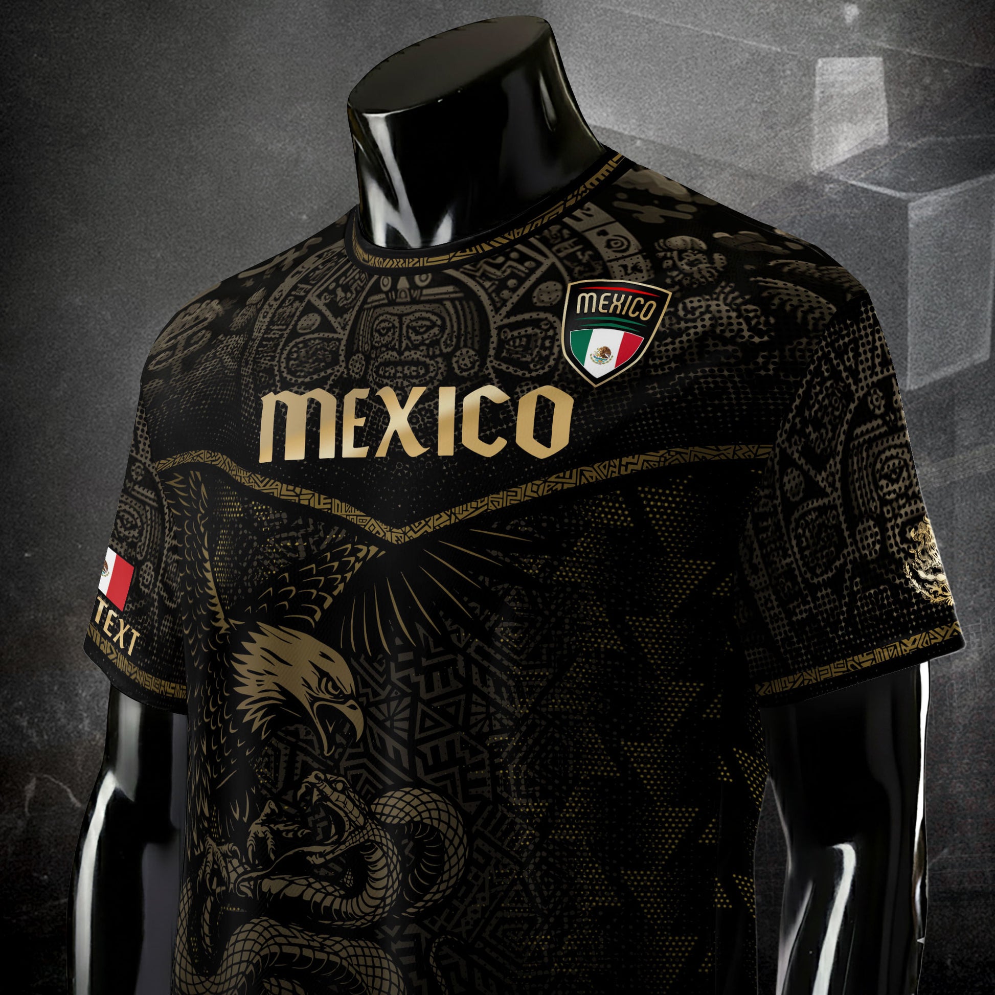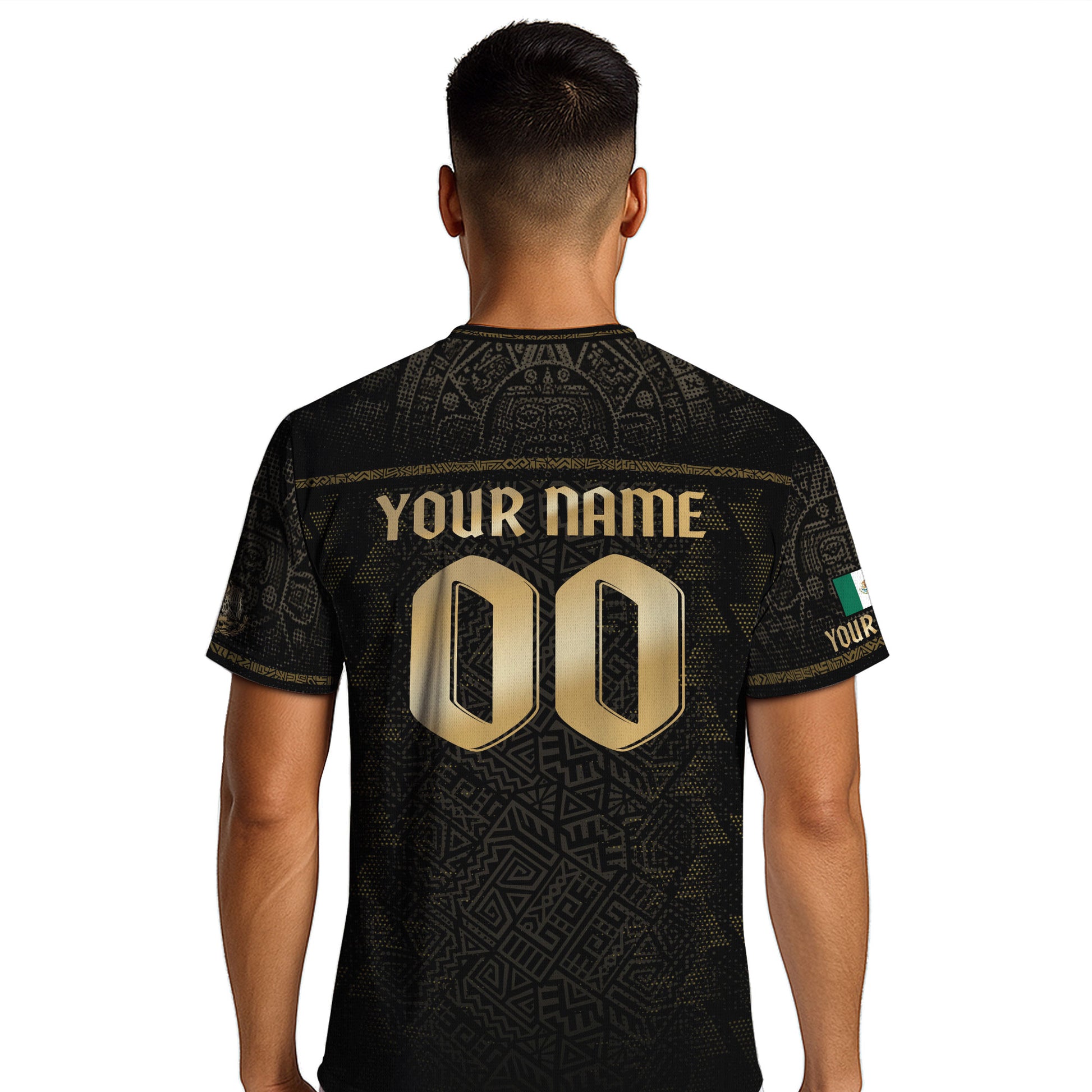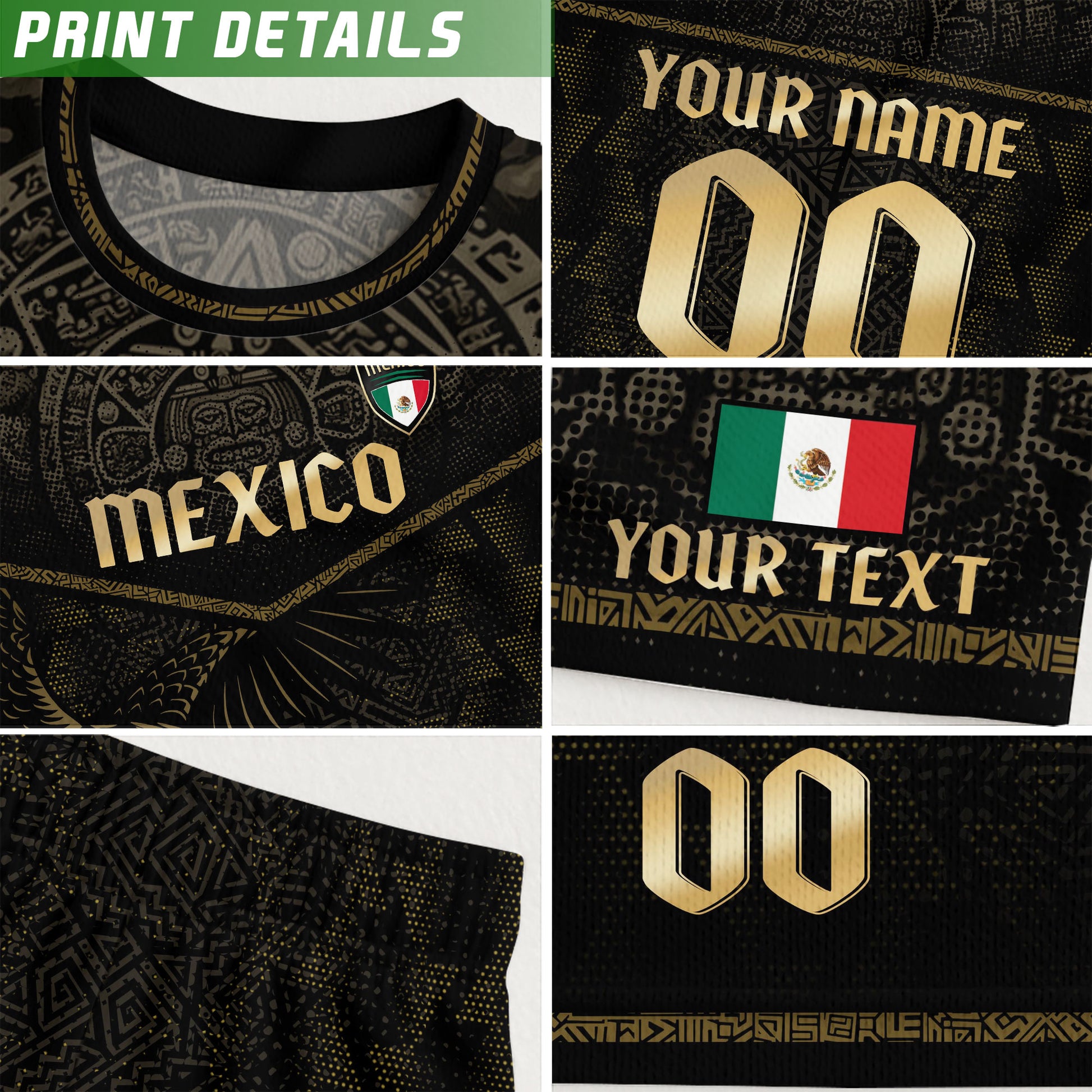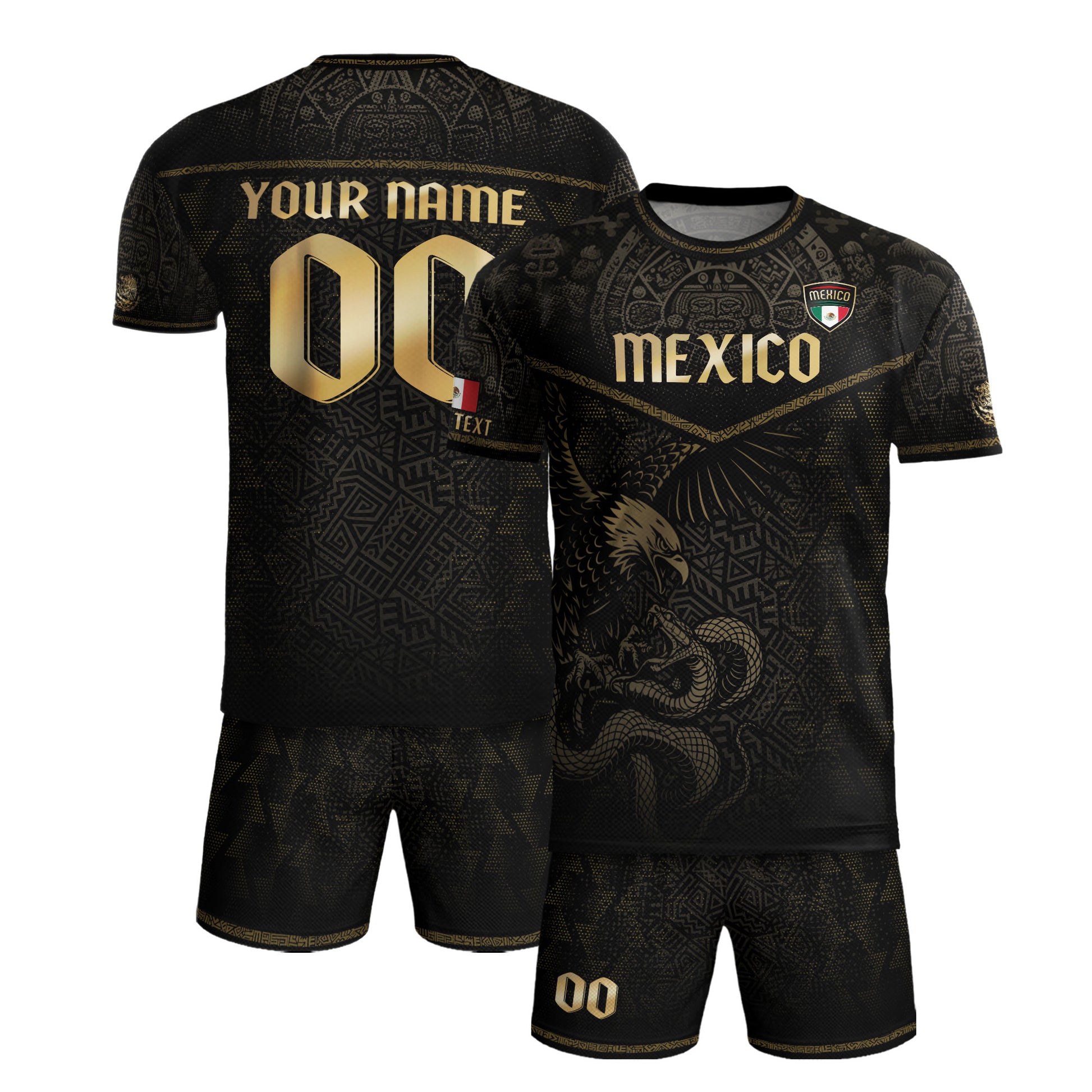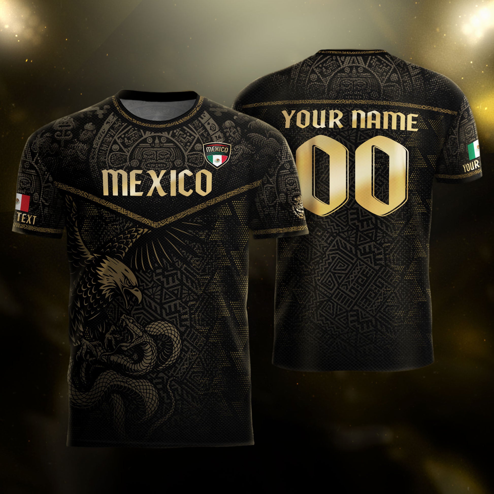 Custom Mexico Soccer Jersey in black gold aztec eagle serpent design. Add name and number. Celebrate Mexican strength, culture and aztec artistry.