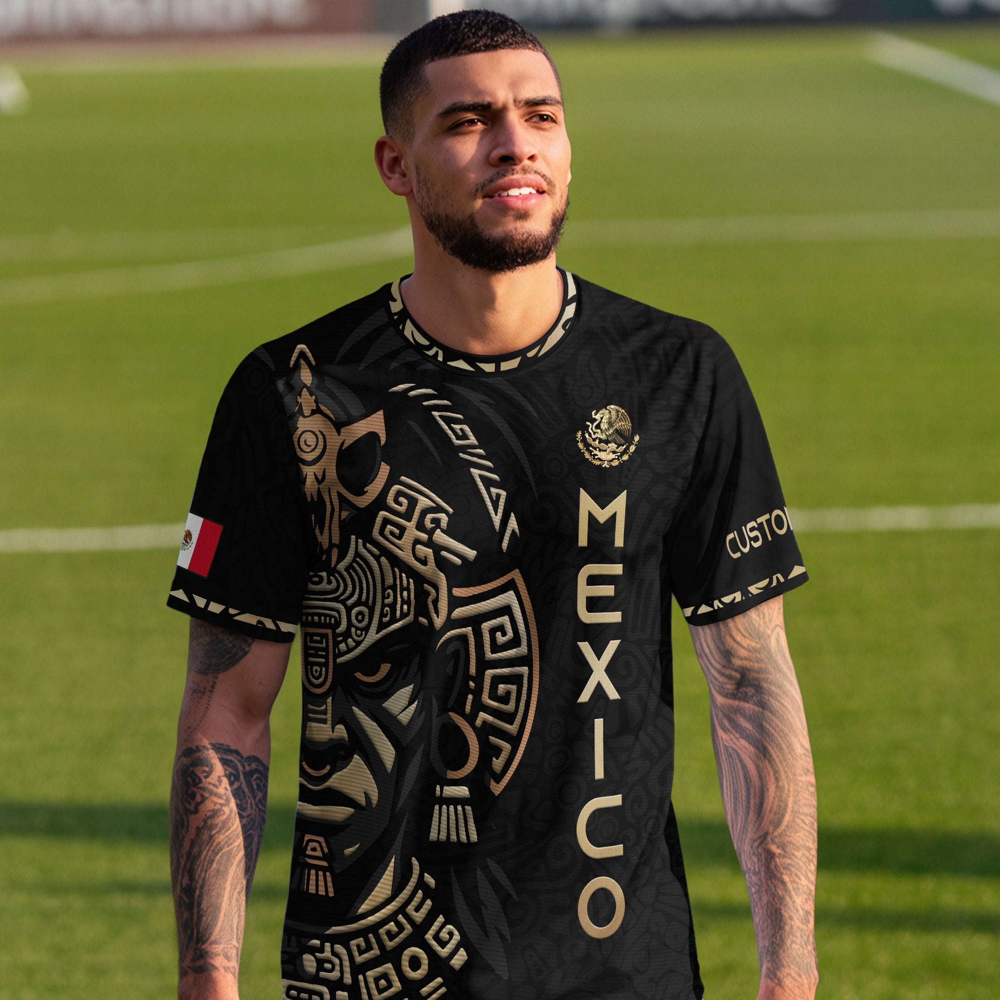 Custom adult Mexico soccer jersey featuring black and gold Aztec warrior face design. Personalized name and number add a unique heritage look.