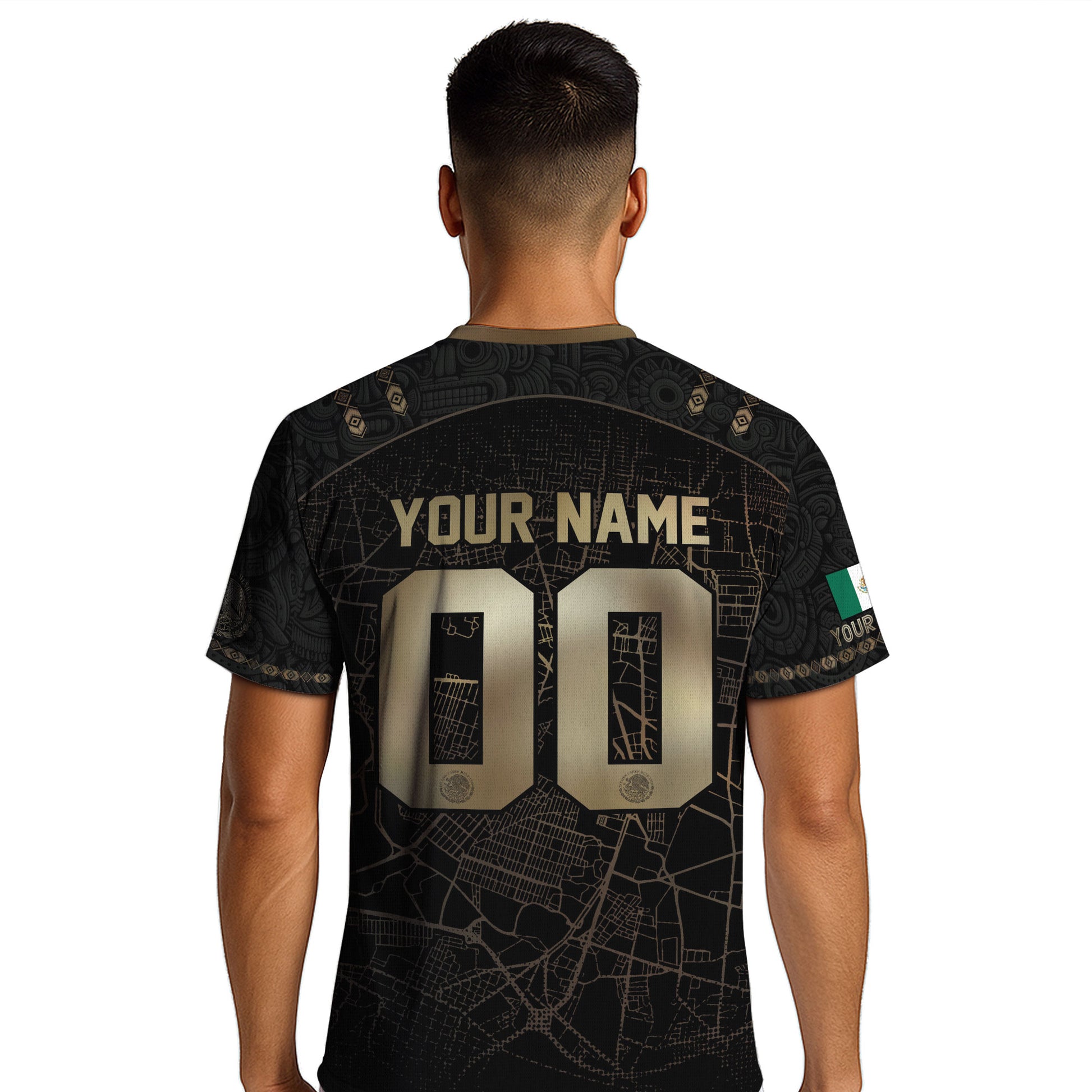 Custom Mexico Soccer Jersey in black gold heritage map aztec design. Add name and number. Inspired by Mexican roots and cultural heritage art.
