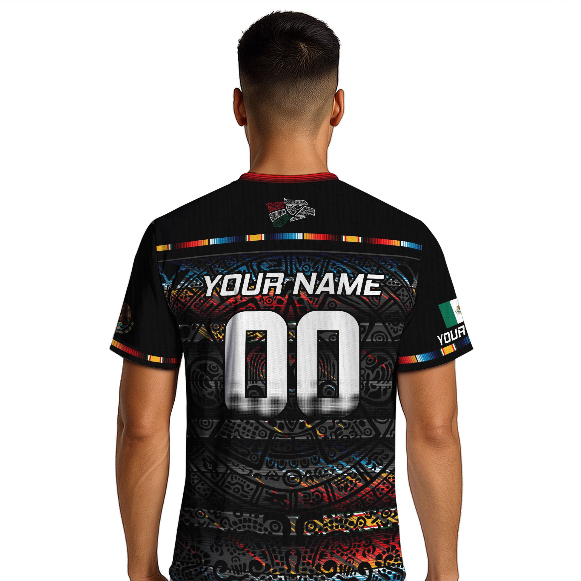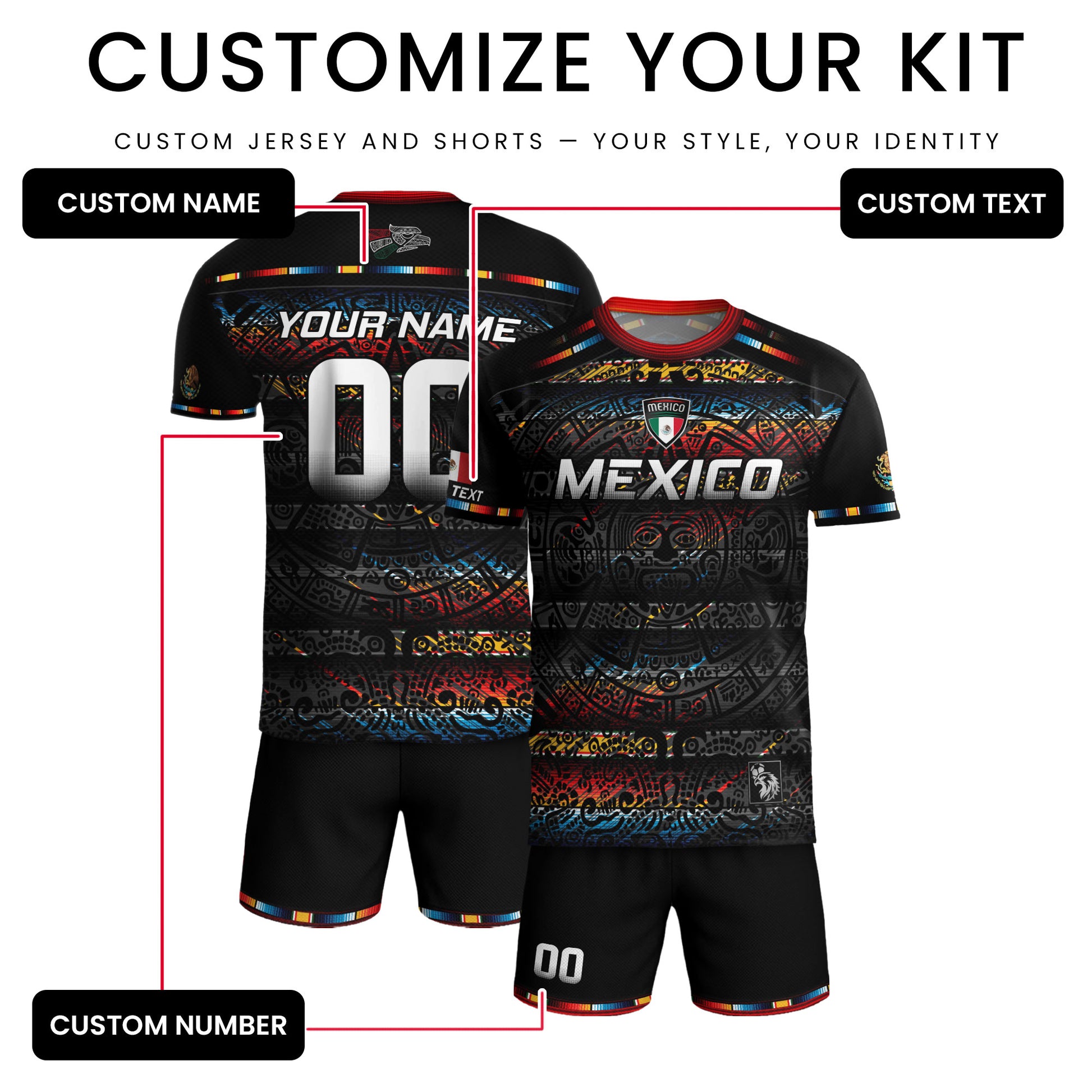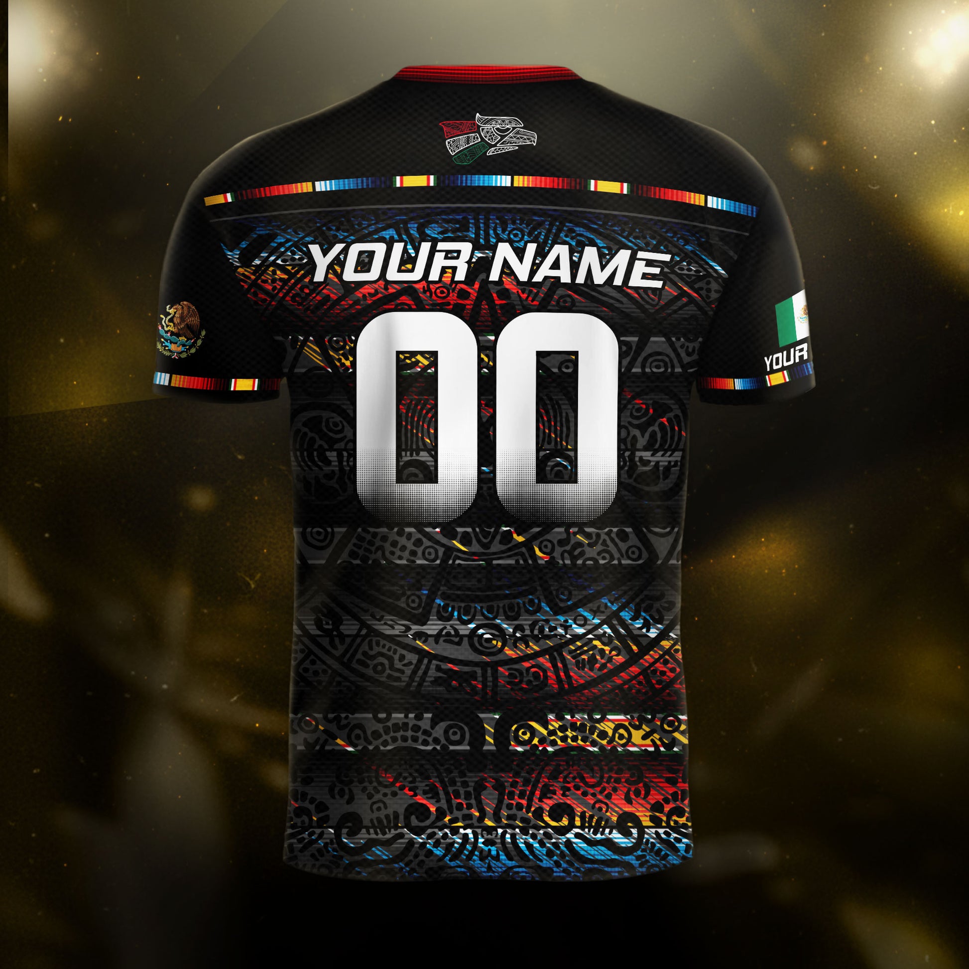 Custom Mexico Soccer Jersey in black multicolor modern aztec calendar design. Add name and number. Stylish custom shirt for mexican football fans.