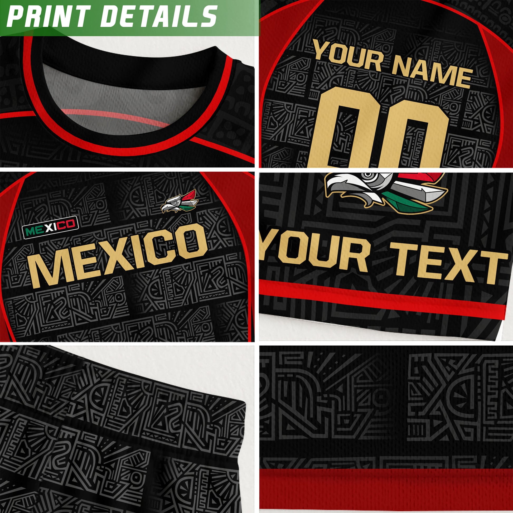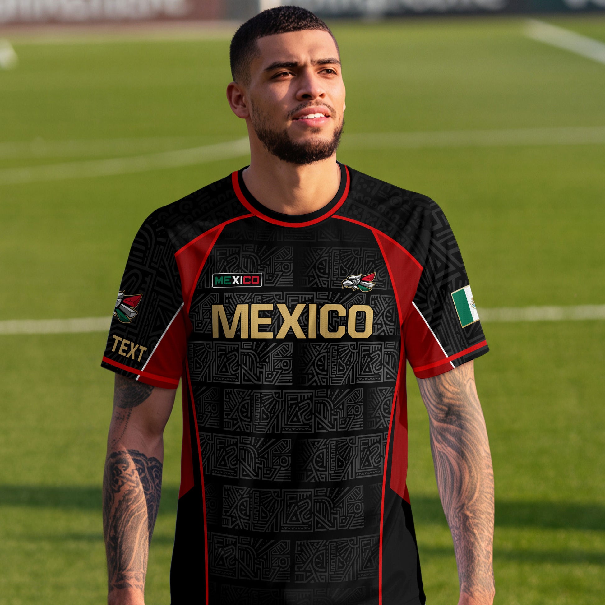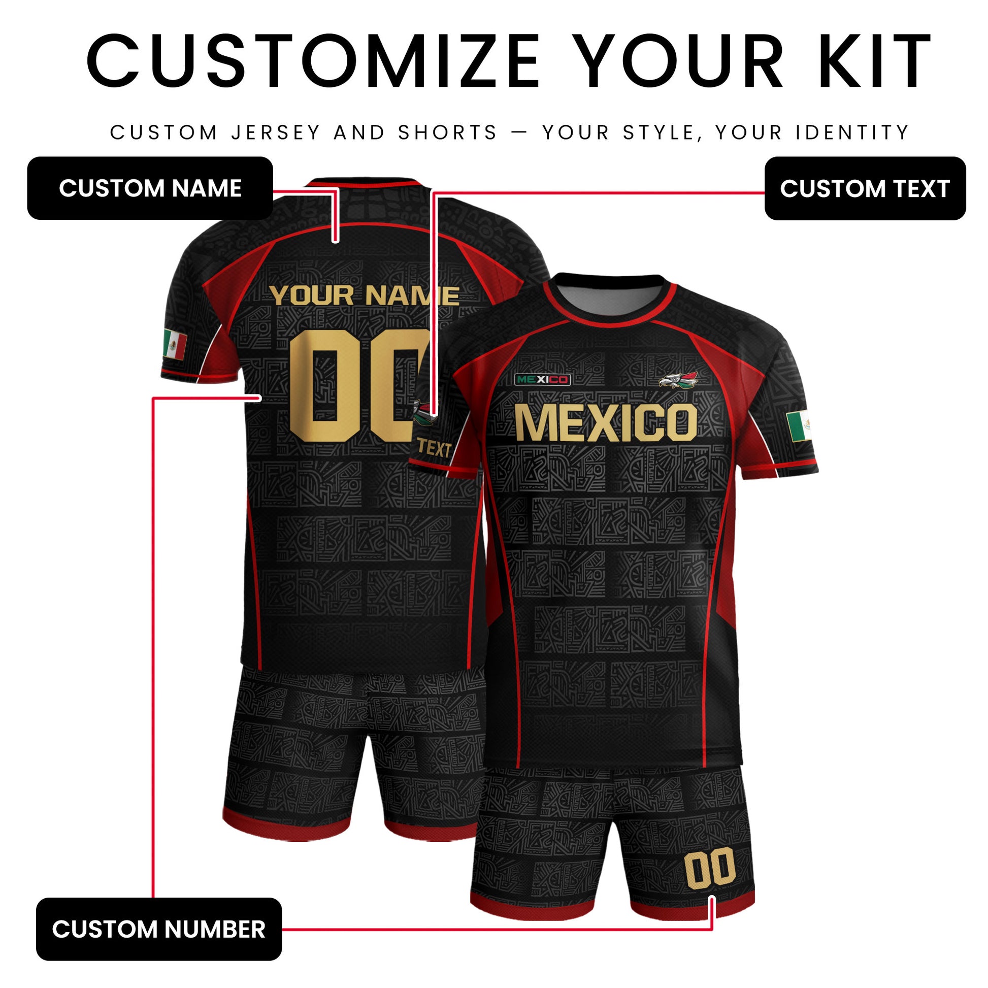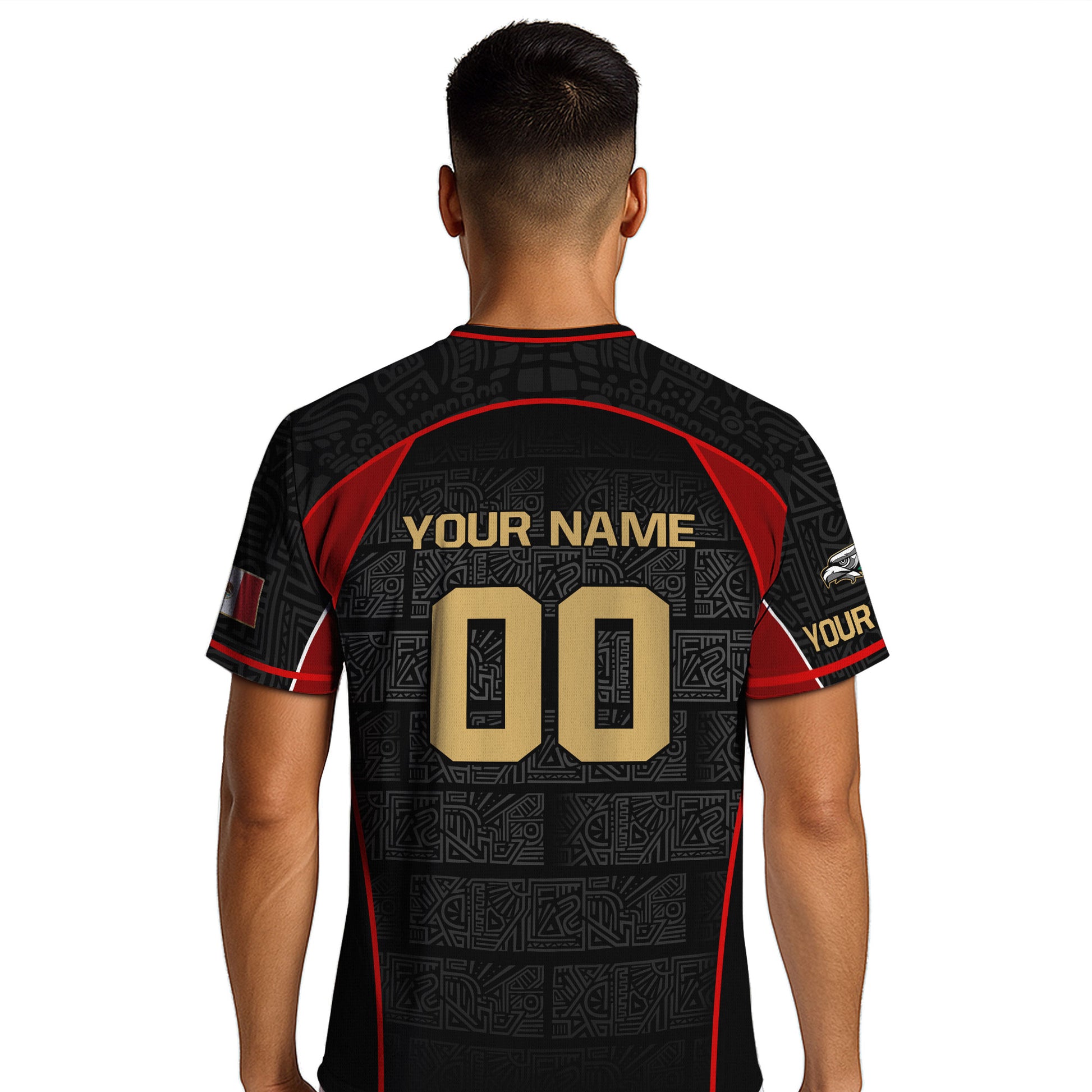 Custom adult Mexico soccer jersey in black red gold Aztec design. Premium lightweight shirt with personalized name and number option.