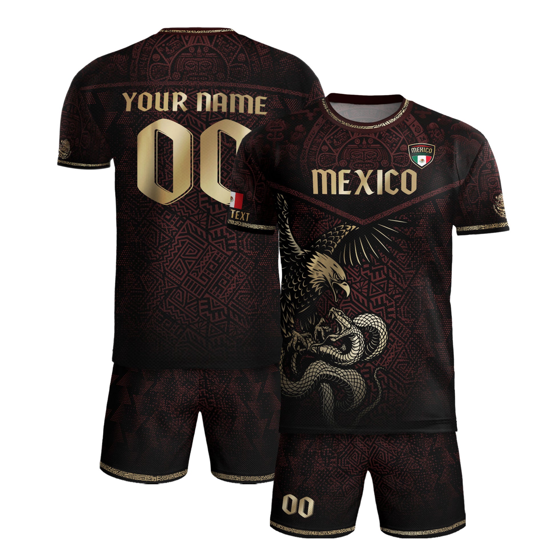 Custom Mexico Soccer Jersey in burgundy gold aztec eagle serpent design. Add name and number. Celebrate Mexican strength and cultural heritage.
