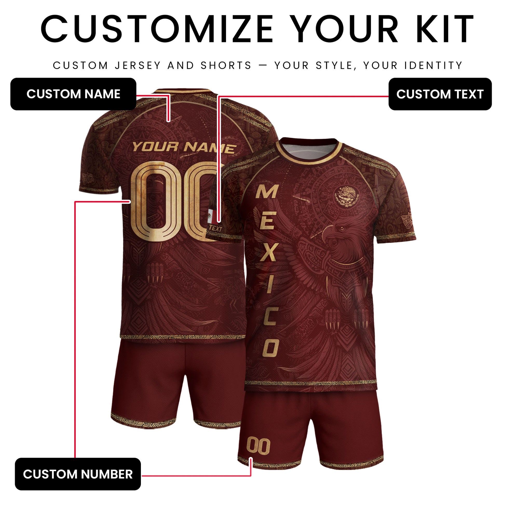 Custom Mexico Soccer Jersey in burgundy gold aztec heritage design. Add name and number. Celebrate Mexican roots and ancient cultural artistry.