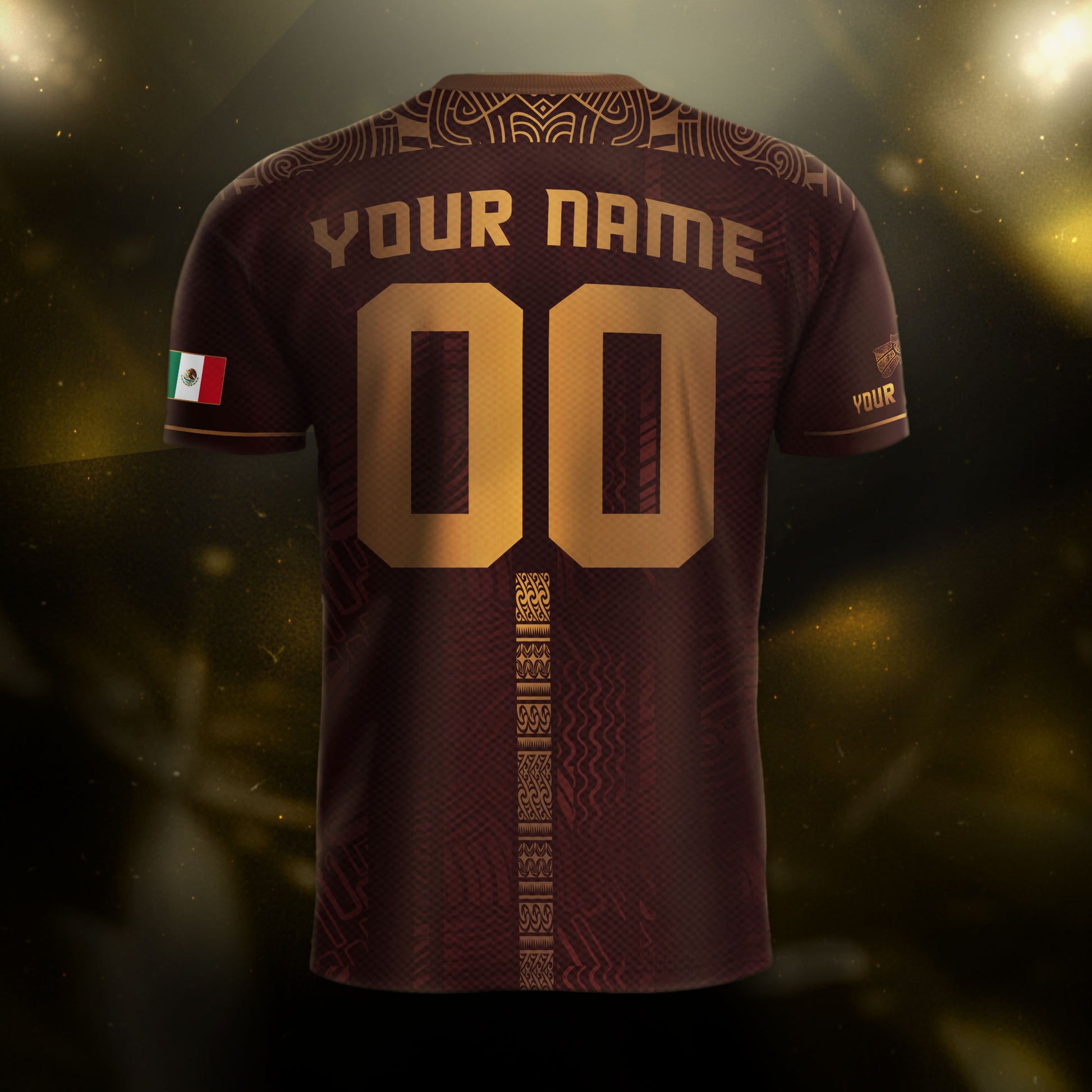 Custom Mexico soccer jersey with gold Aztec details on burgundy fabric. Breathable material, customizable name and number.