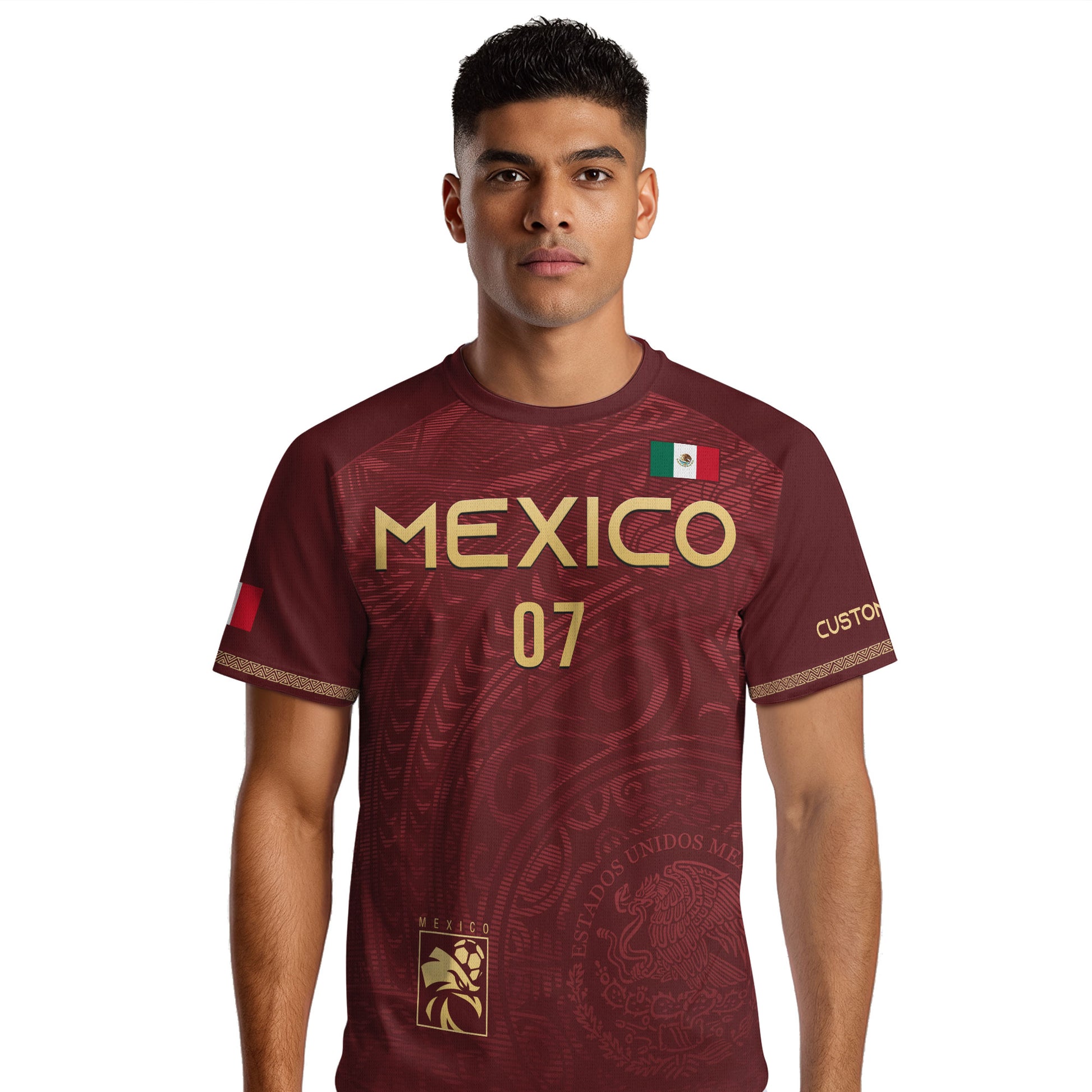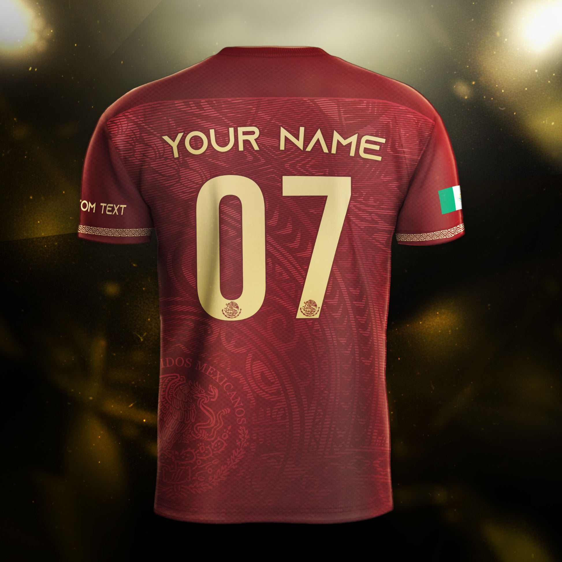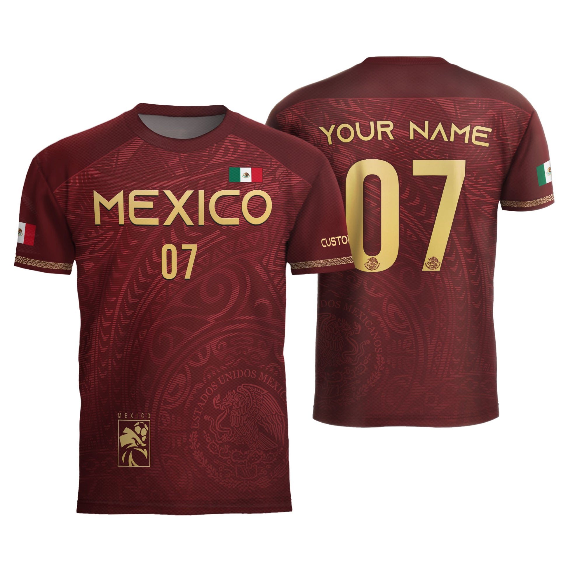 Custom adult Mexico soccer jersey in burgundy gold design. Features the national eagle motif and personalized name and number for a bold heritage look.
