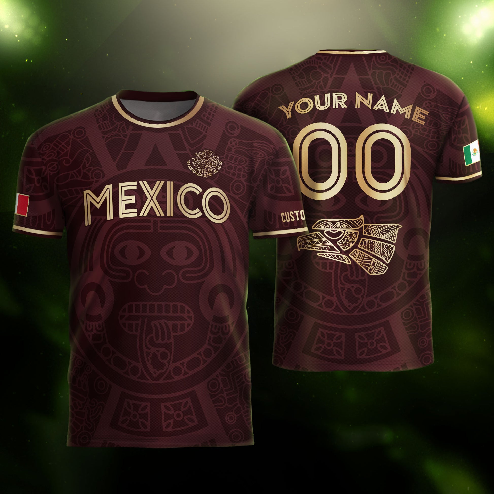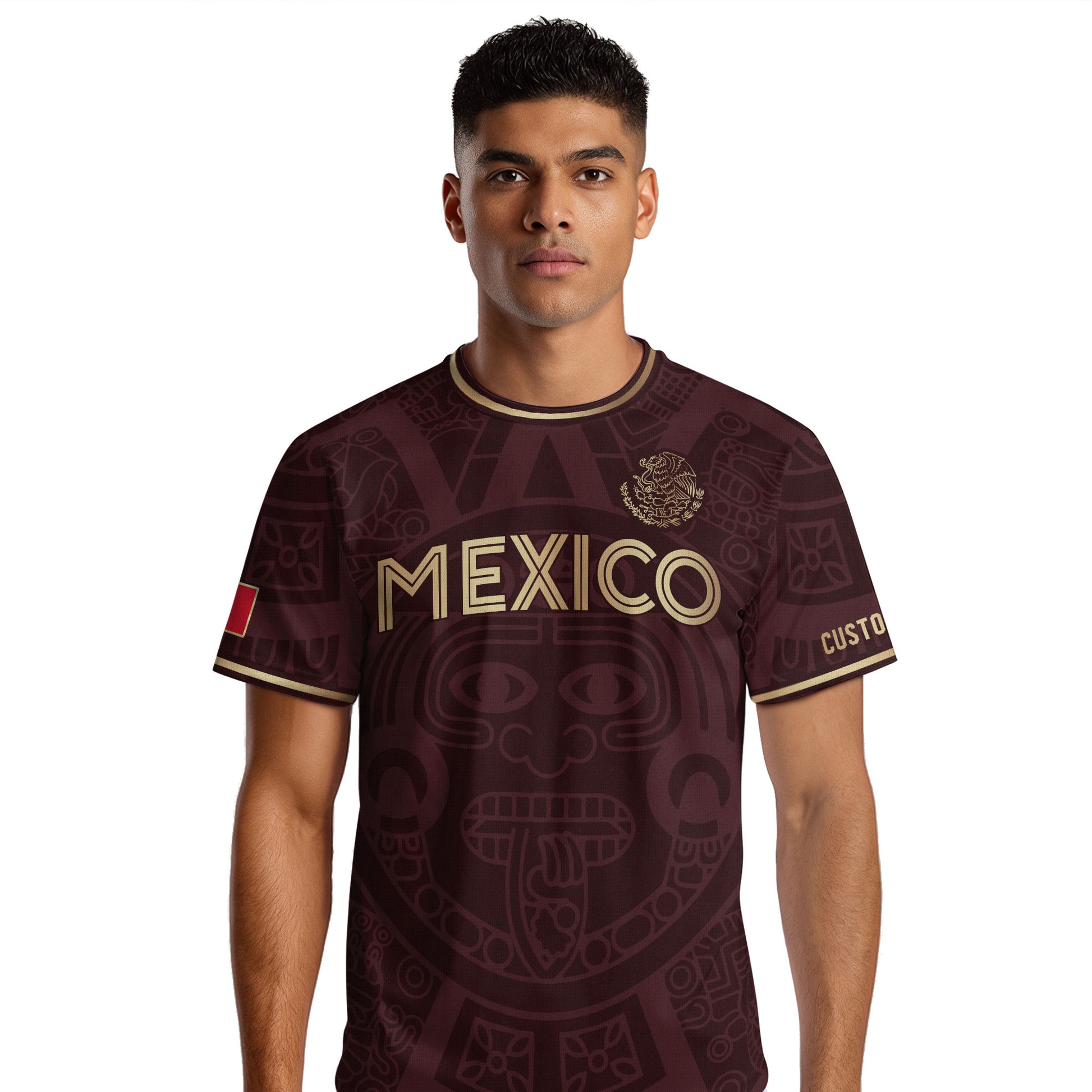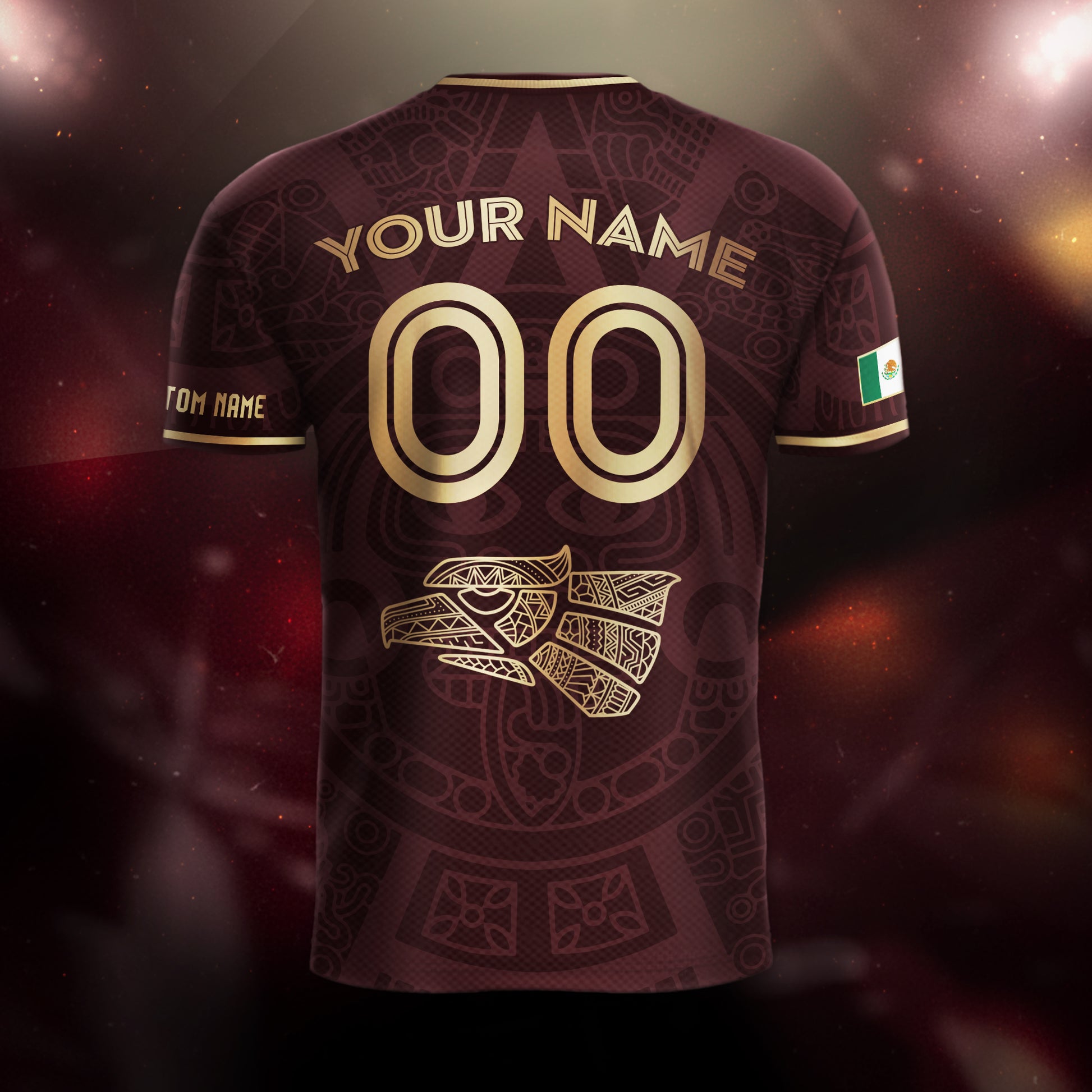 Custom Mexico Soccer Jersey in maroon gold Aztec calendar design. Personalize with name and number. Celebrate Mexican culture and heritage.
