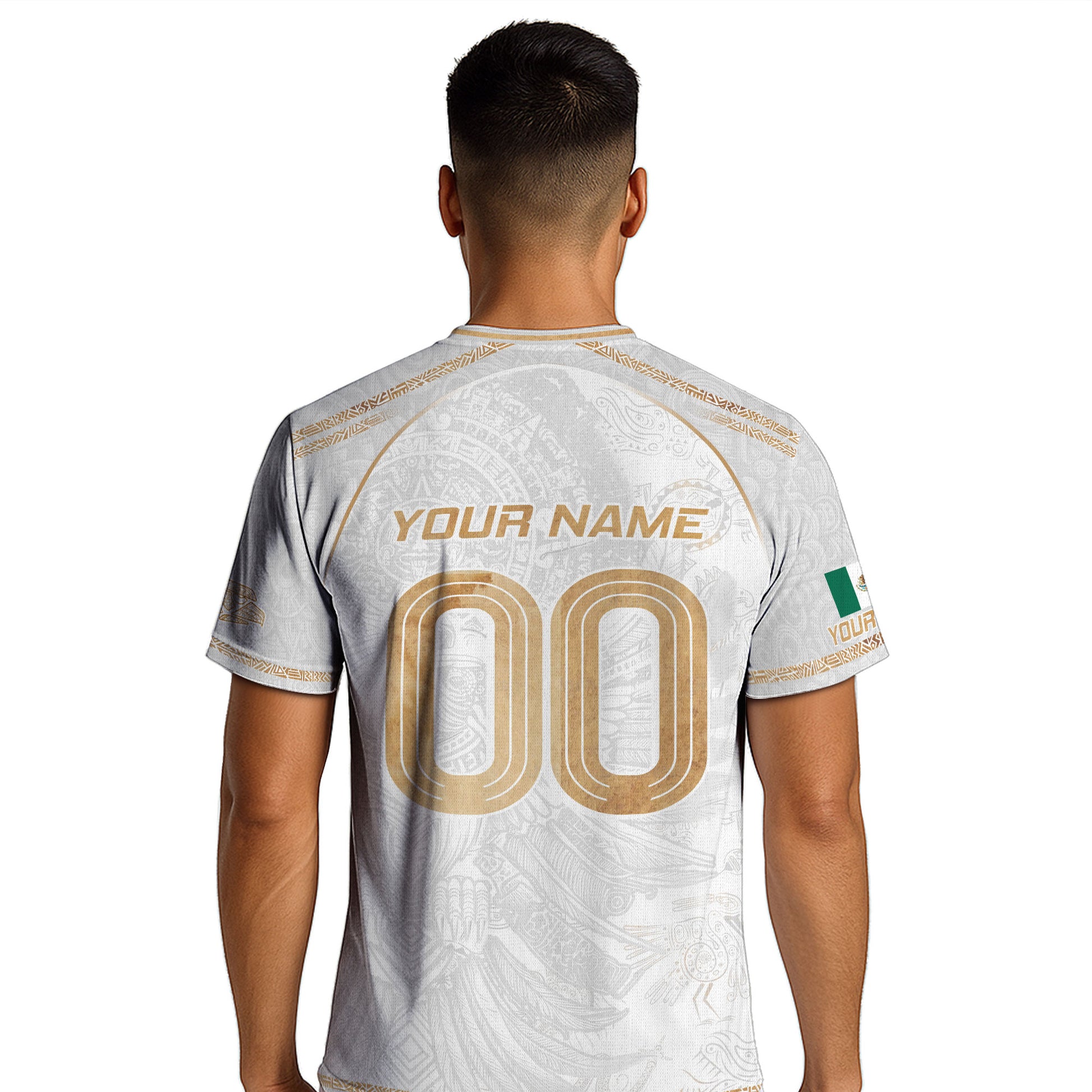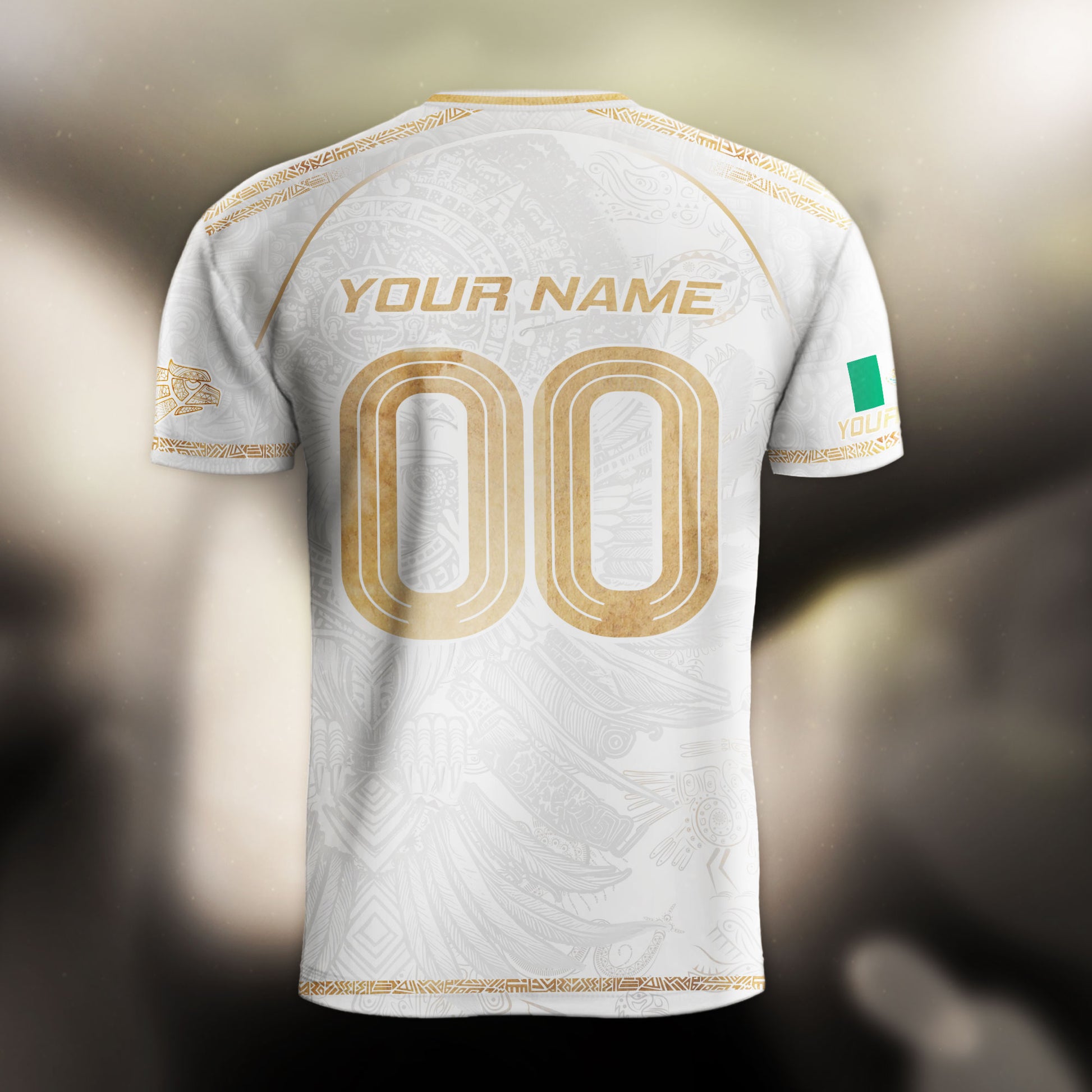 Custom Mexico Soccer Jersey in white gold heritage aztec eagle design. Add name and number. Celebrate Mexican pride and aztec inspired craftsmanship.