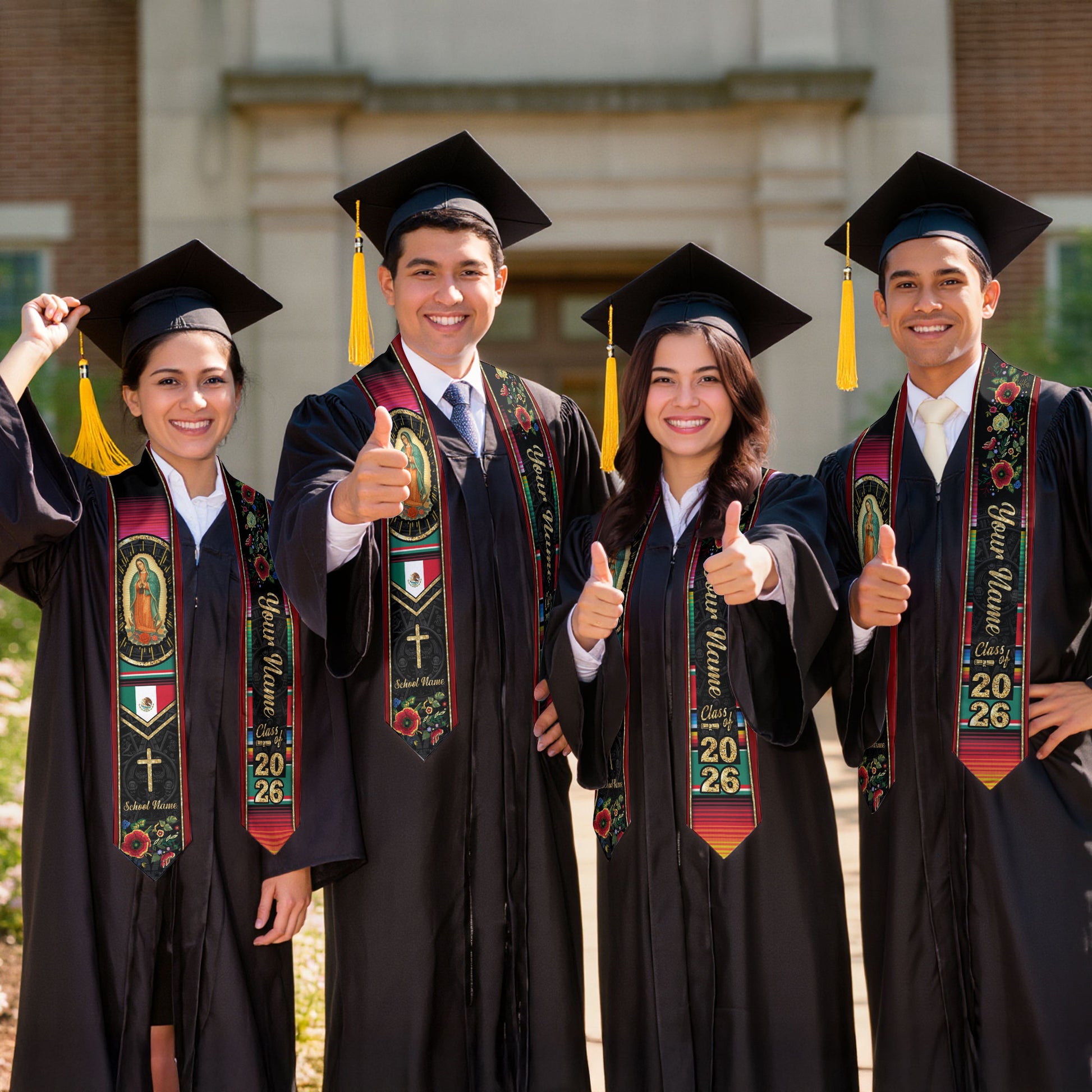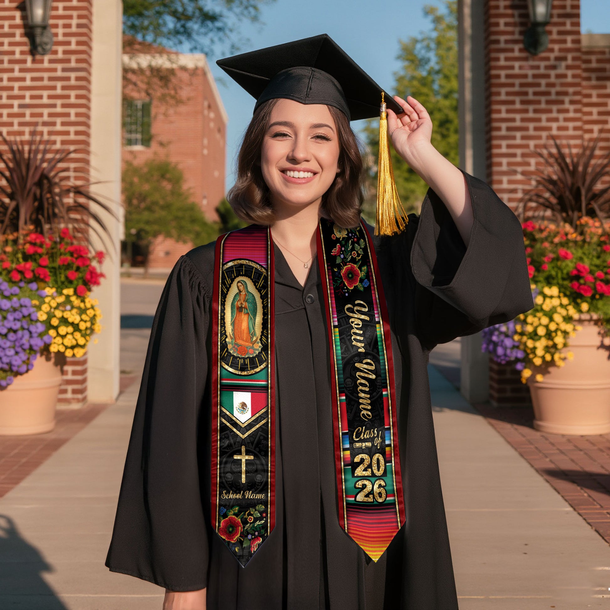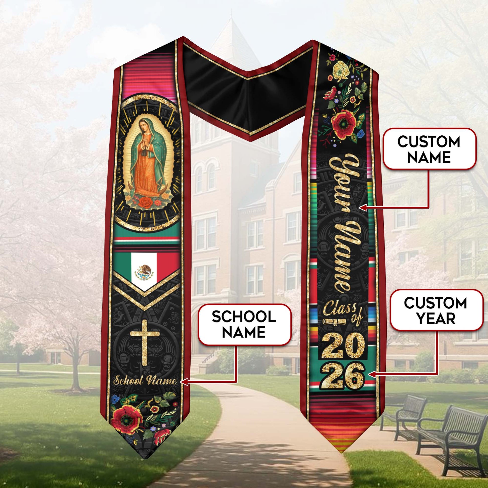 Custom Virgen de Guadalupe Christian Graduation Stole 2026 – Personalized Class of 2026 Senior Sash with Cross & Floral Design
