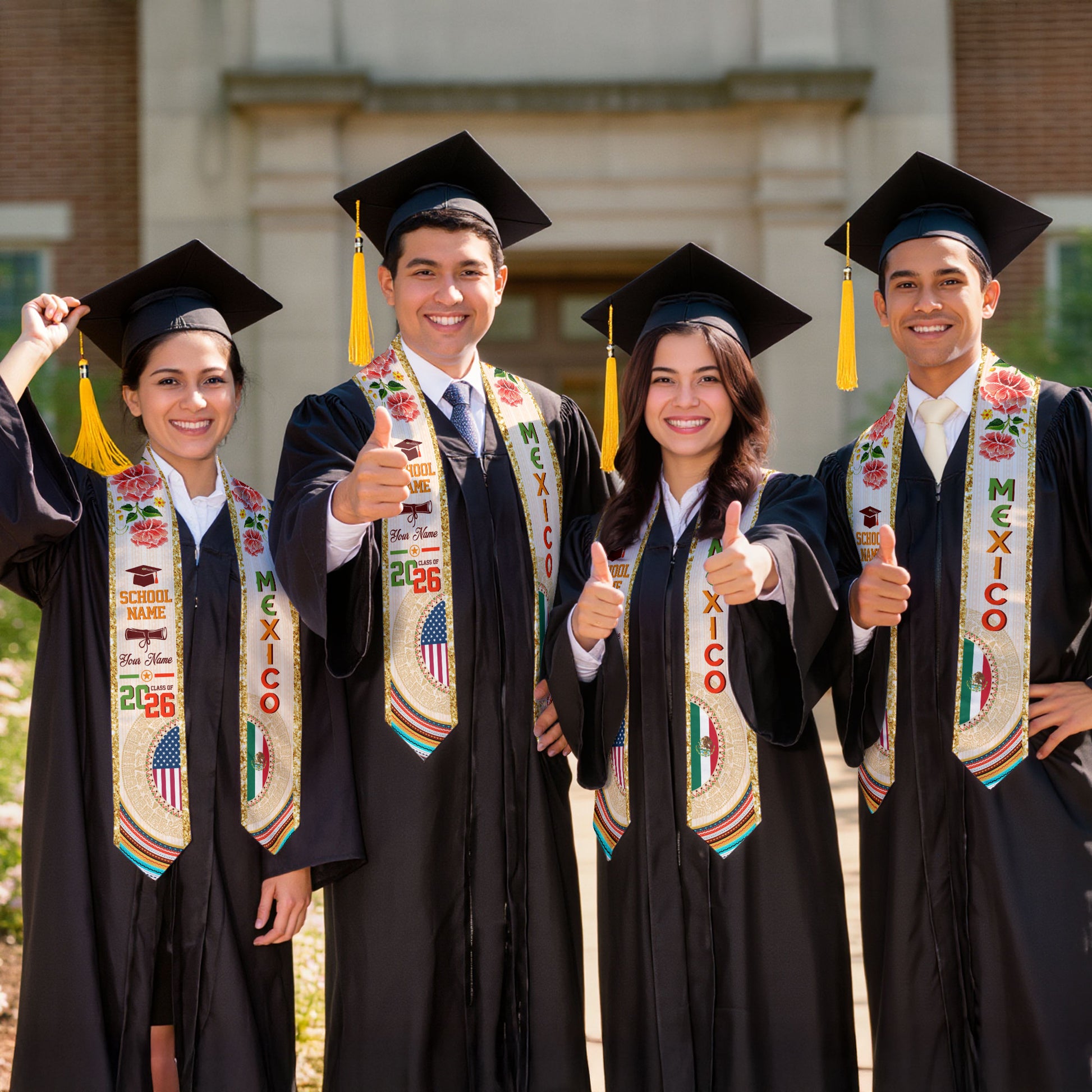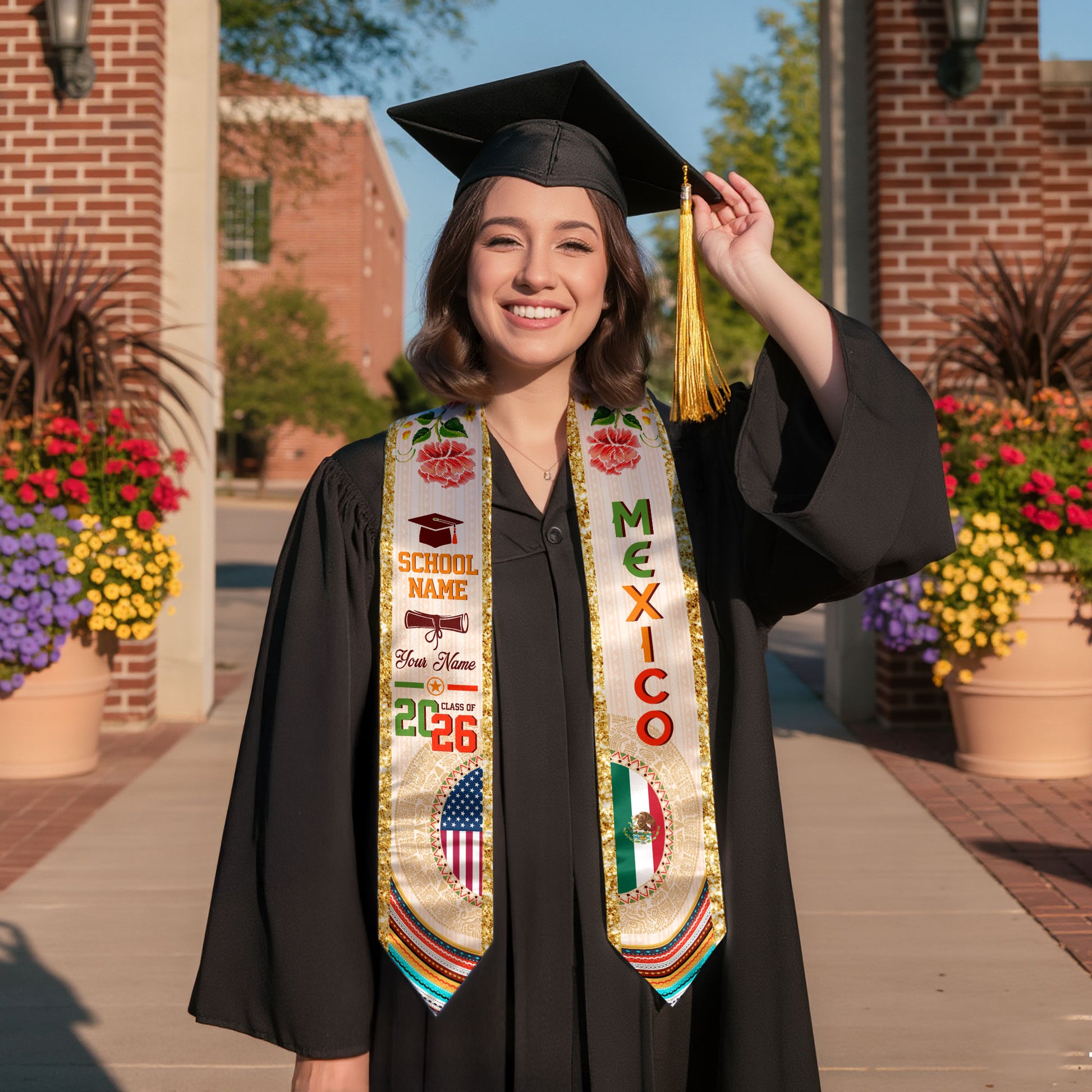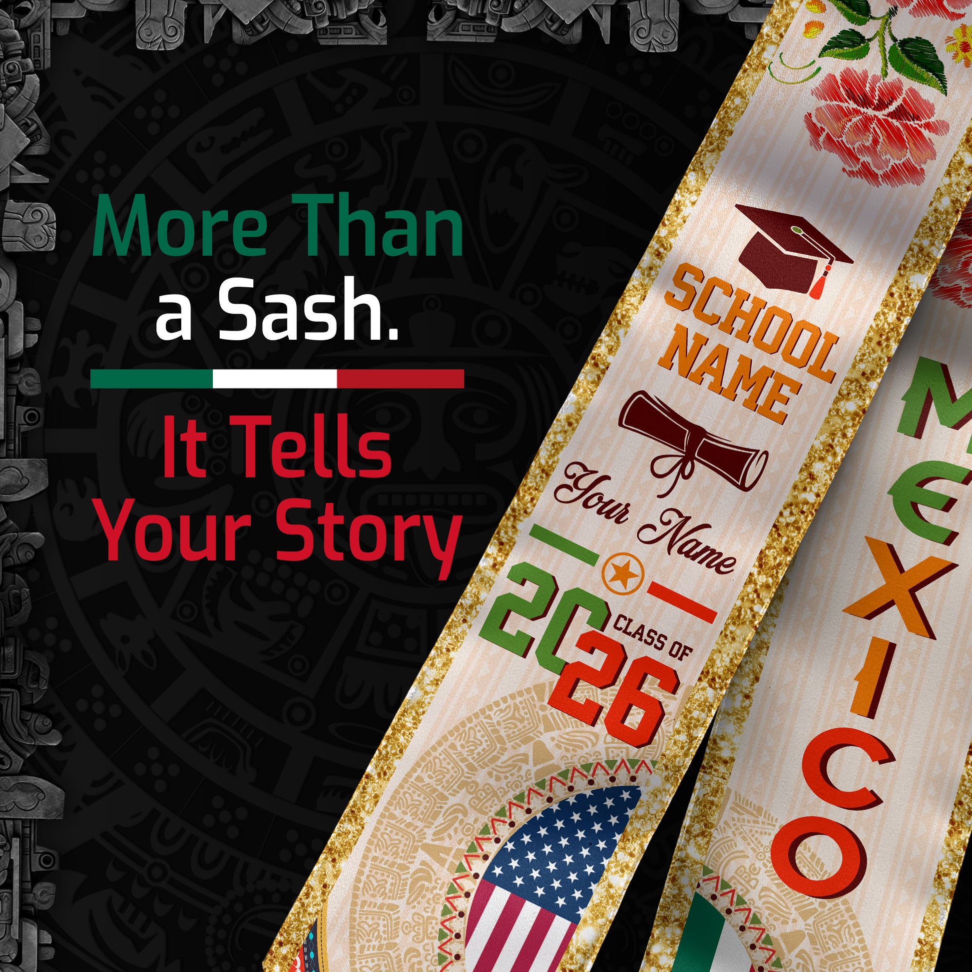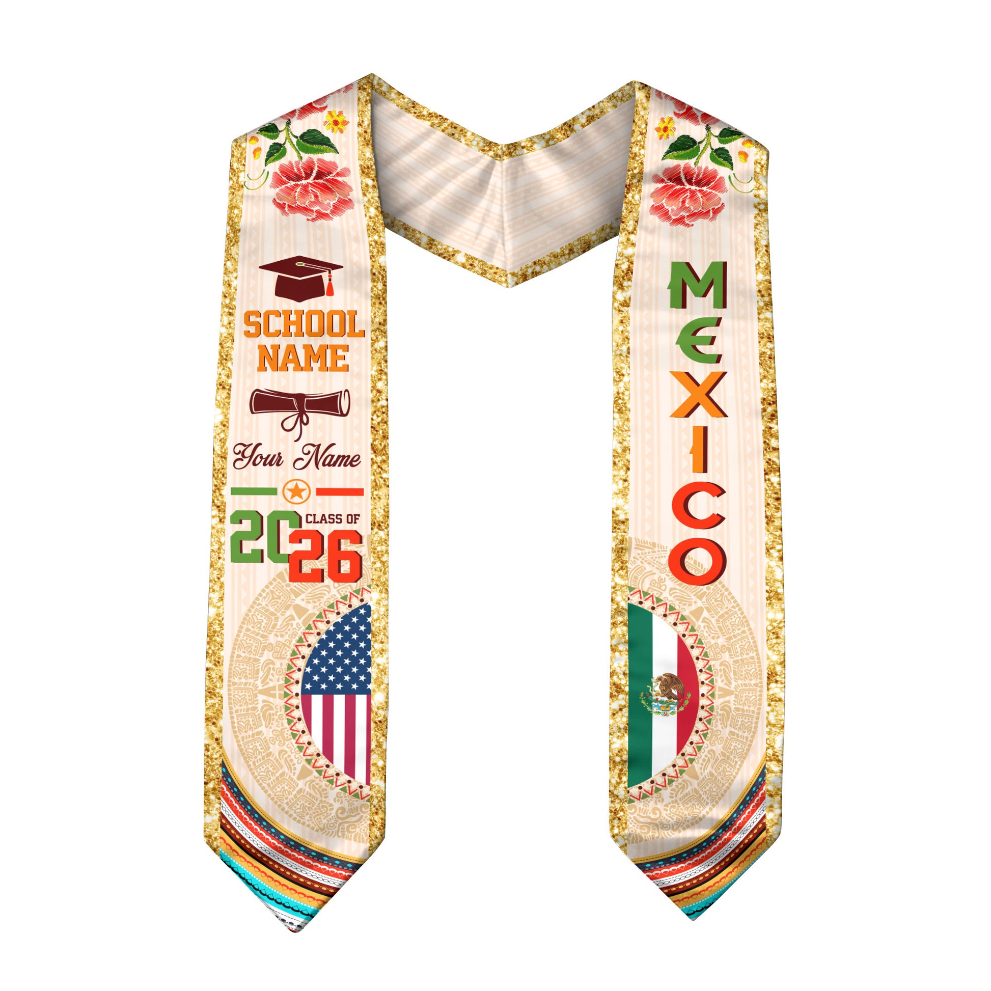 Mexican Graduation Stole Custom Name Mexico USA Flag Aztec Rose Class 2026