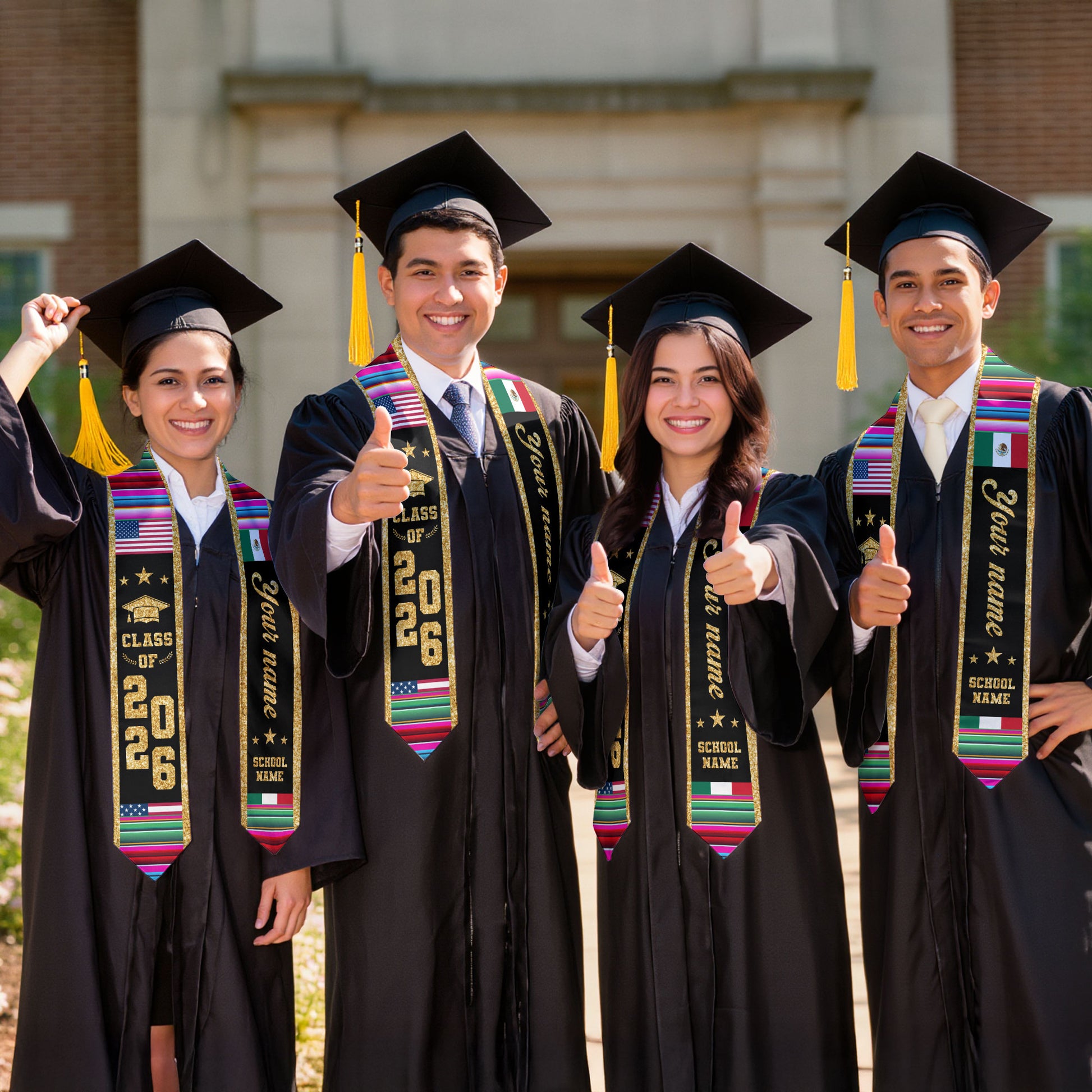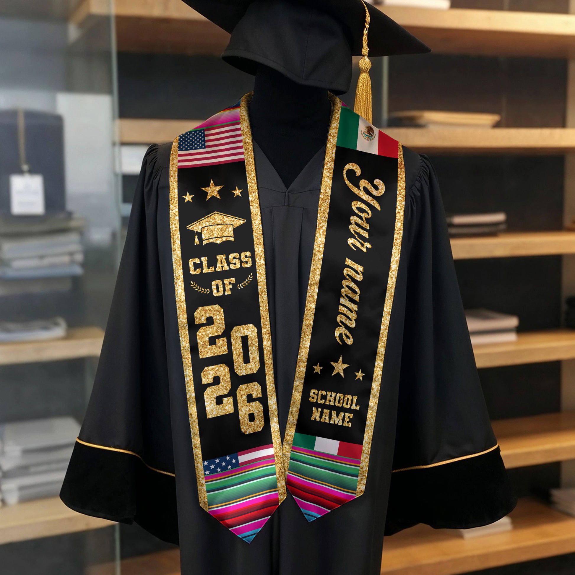 Mexican Graduation Stole Custom Name Mexico USA Flag Serape Gold Glitter Class 2026