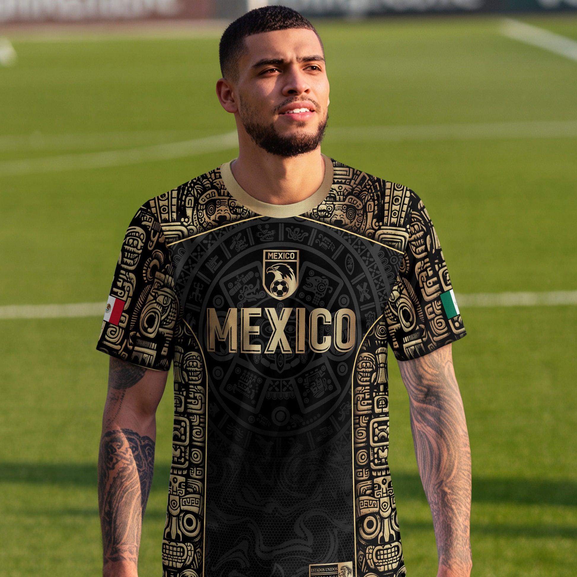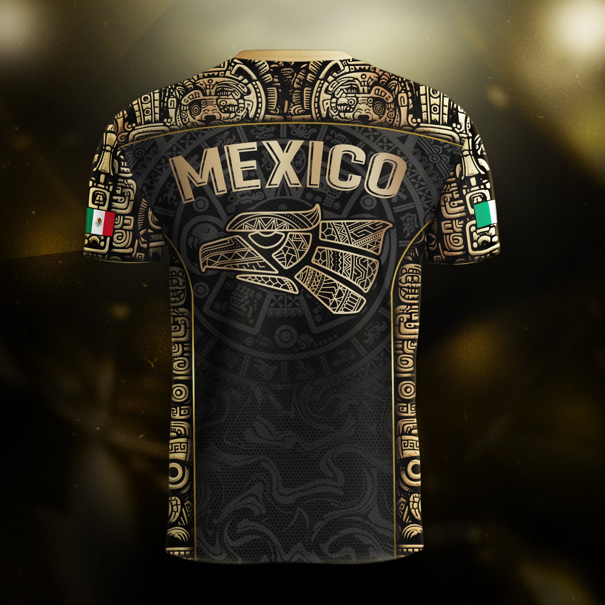 Honor Mexico’s heritage with this Black Gold Limited Edition Aztec Jersey featuring a bold Eagle pattern and premium metallic details. Made from high-quality polyester that is soft, lightweight, breathable, and quick-drying, this jersey delivers comfort and performance for games, training, and everyday wear while showcasing true Mexican pride.