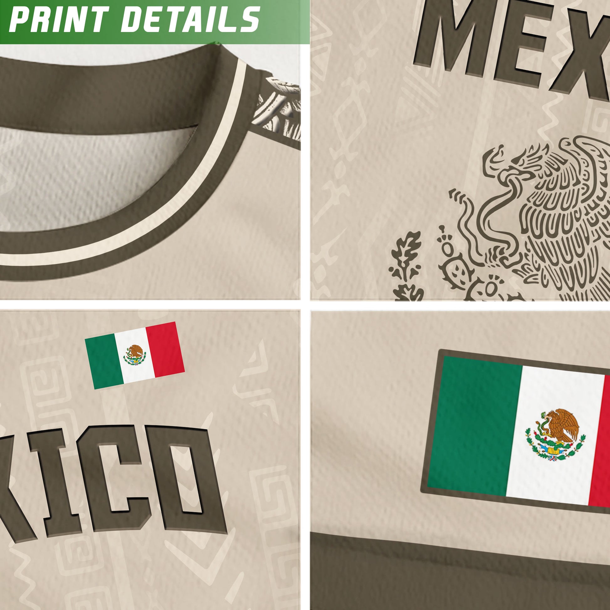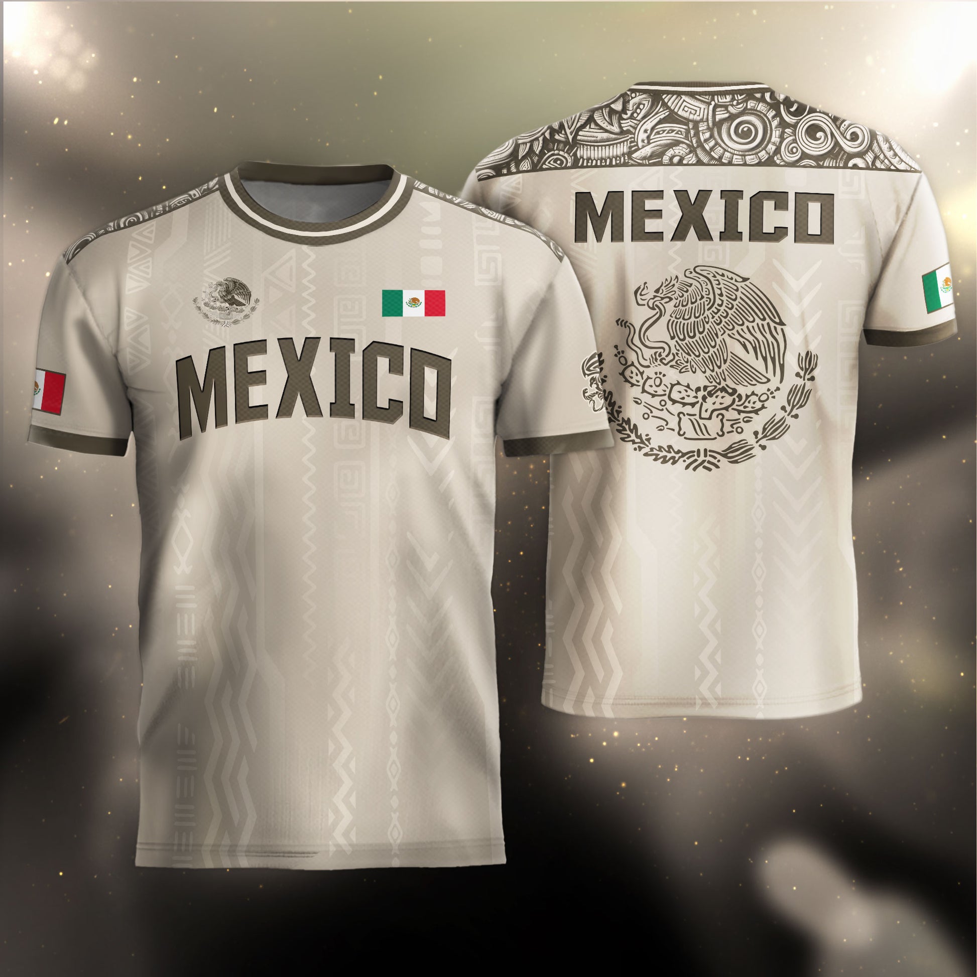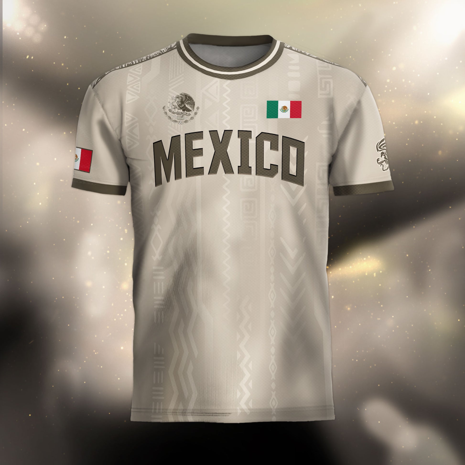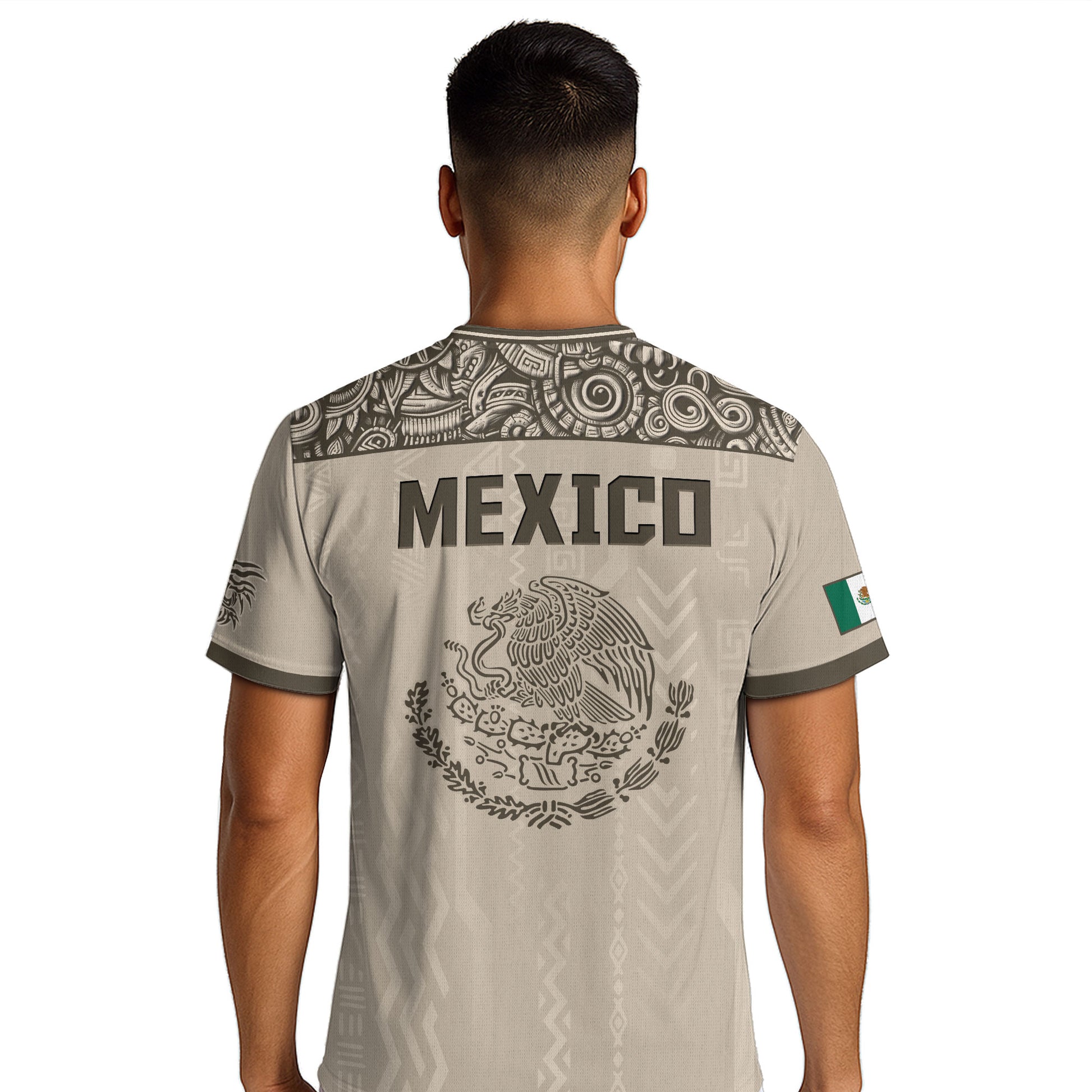 Discover a unique stone and earth toned Mexico soccer jersey. This design prominently features the legendary eagle devouring the serpent on the back, with intricate Aztec patterns on the shoulders and body.