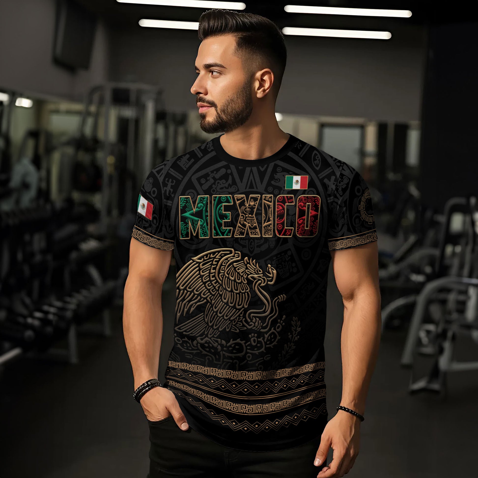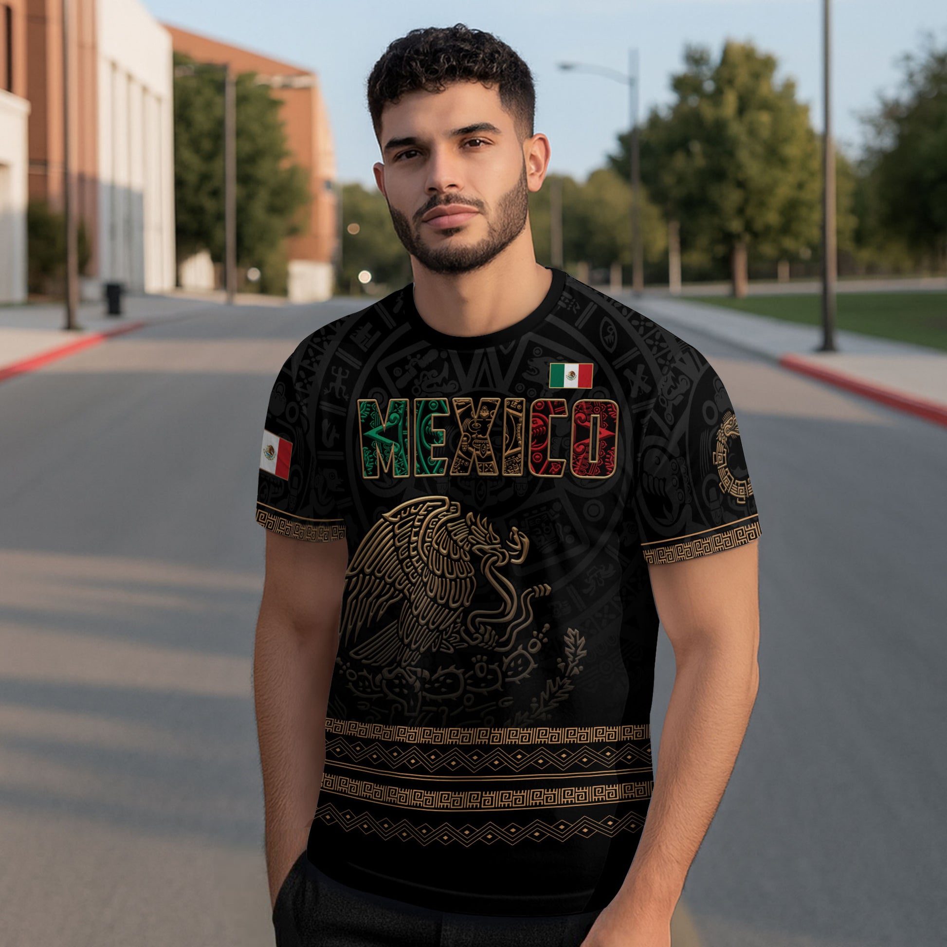Honor Mexican heritage with this 3D Aztec Eagle Gold shirt. Featuring intricate tribal designs and metallic tones, it embodies pride, strength, and warrior legacy.