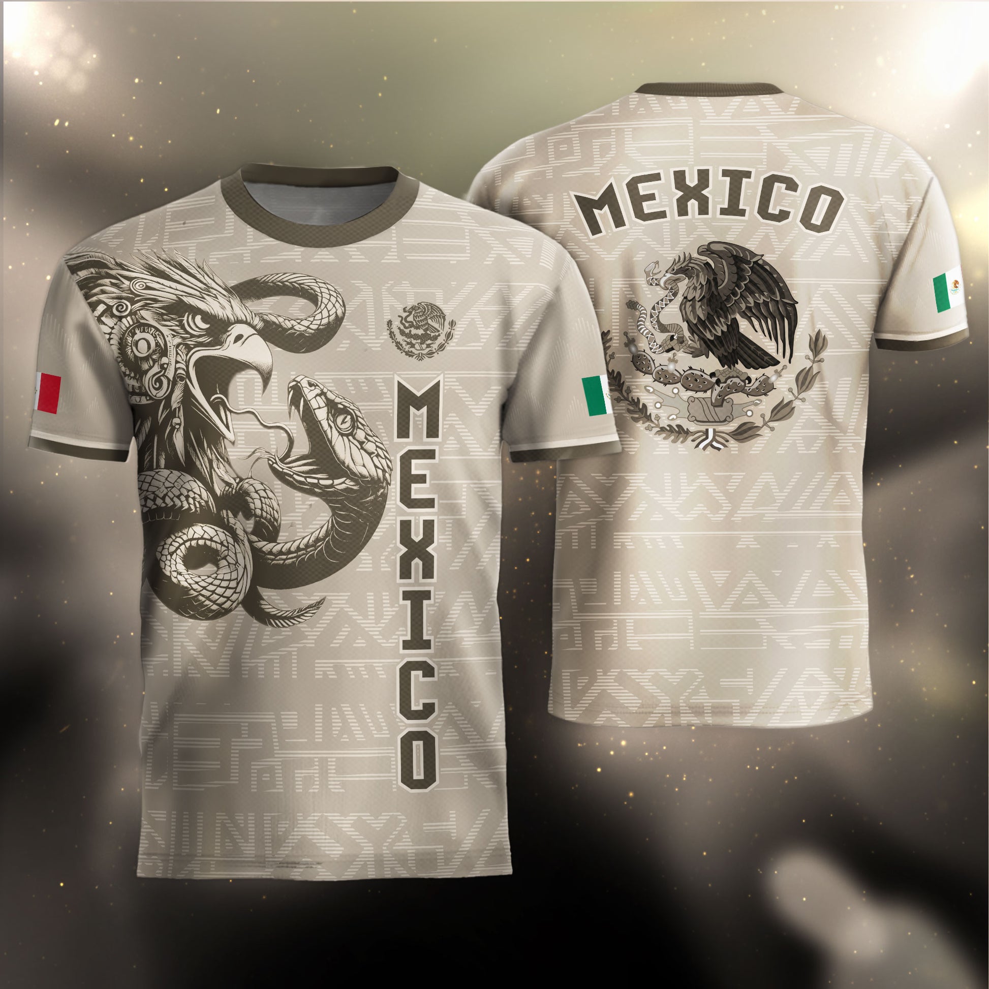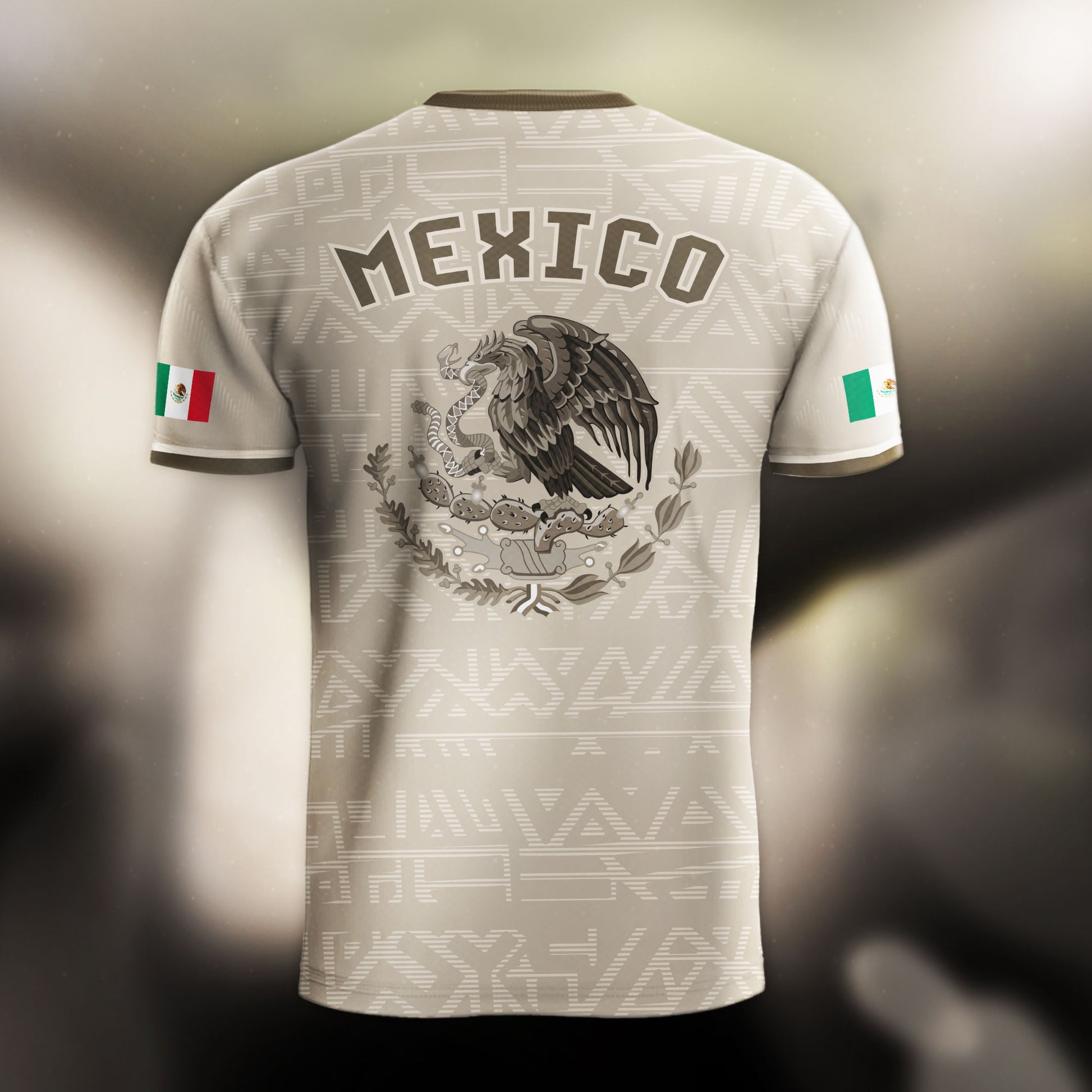 A unique take on national pride, this Mexico soccer jersey comes in a stylish tan and brown design. It features the legendary eagle and serpent on the front and the full coat of arms on the back. A standout piece for any fan.