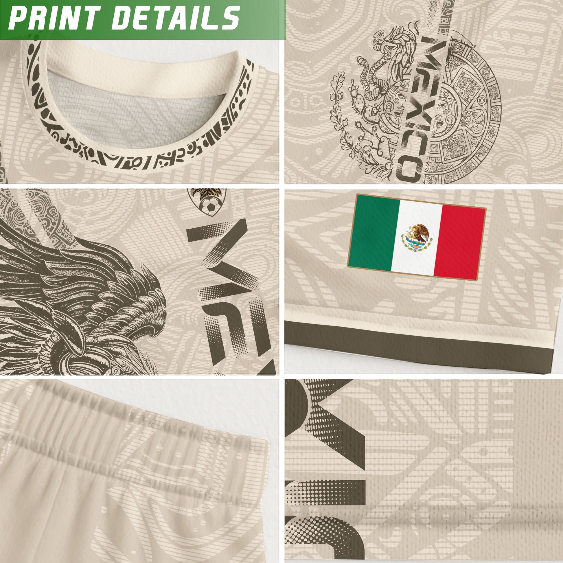 Honor Mexican culture with this beige Aztec eagle design — sleek vertical “Mexico” print, ancient motifs, and lightweight comfort for every fan.