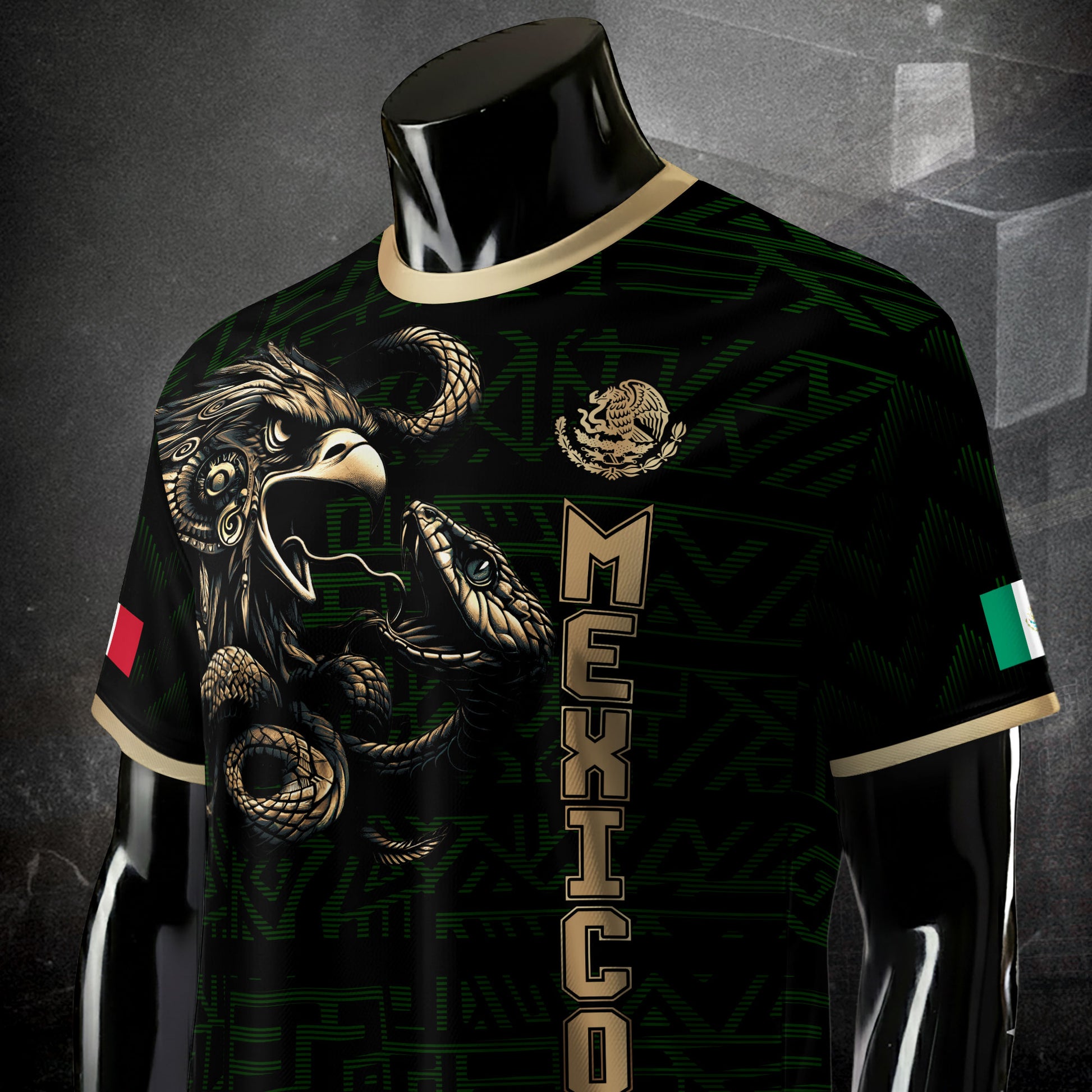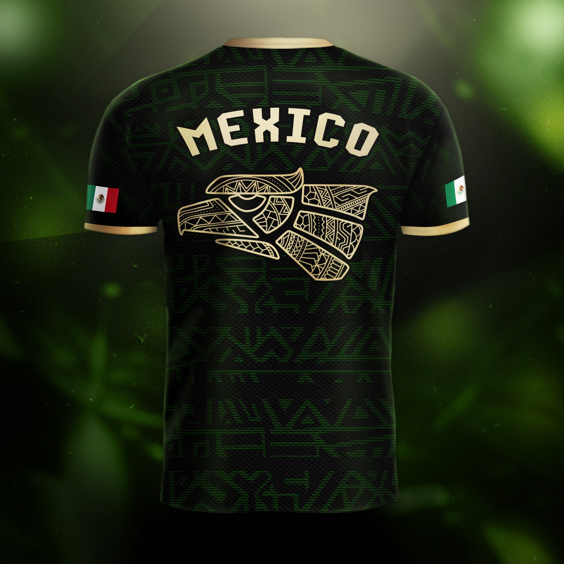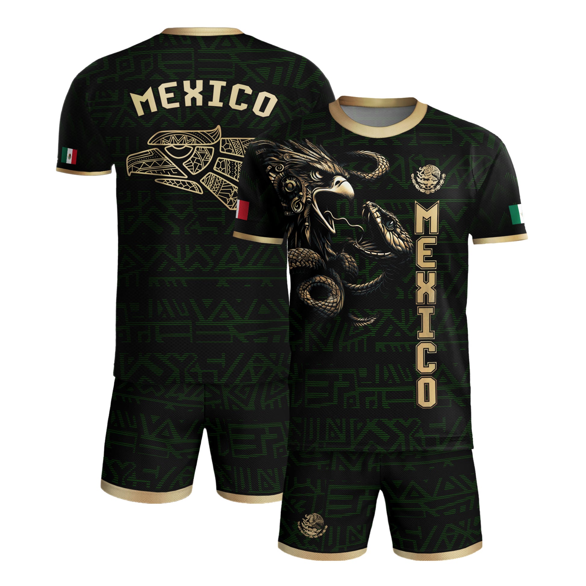 Unleash the warrior spirit with this stunning Mexico soccer jersey. It features a powerful black and gold design with a detailed Aztec eagle battling the serpent. A bold look for every true fan of El Tri.