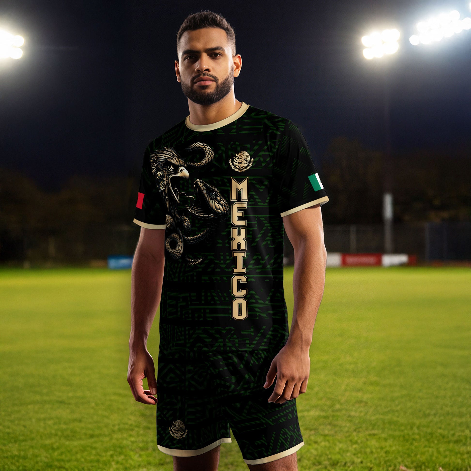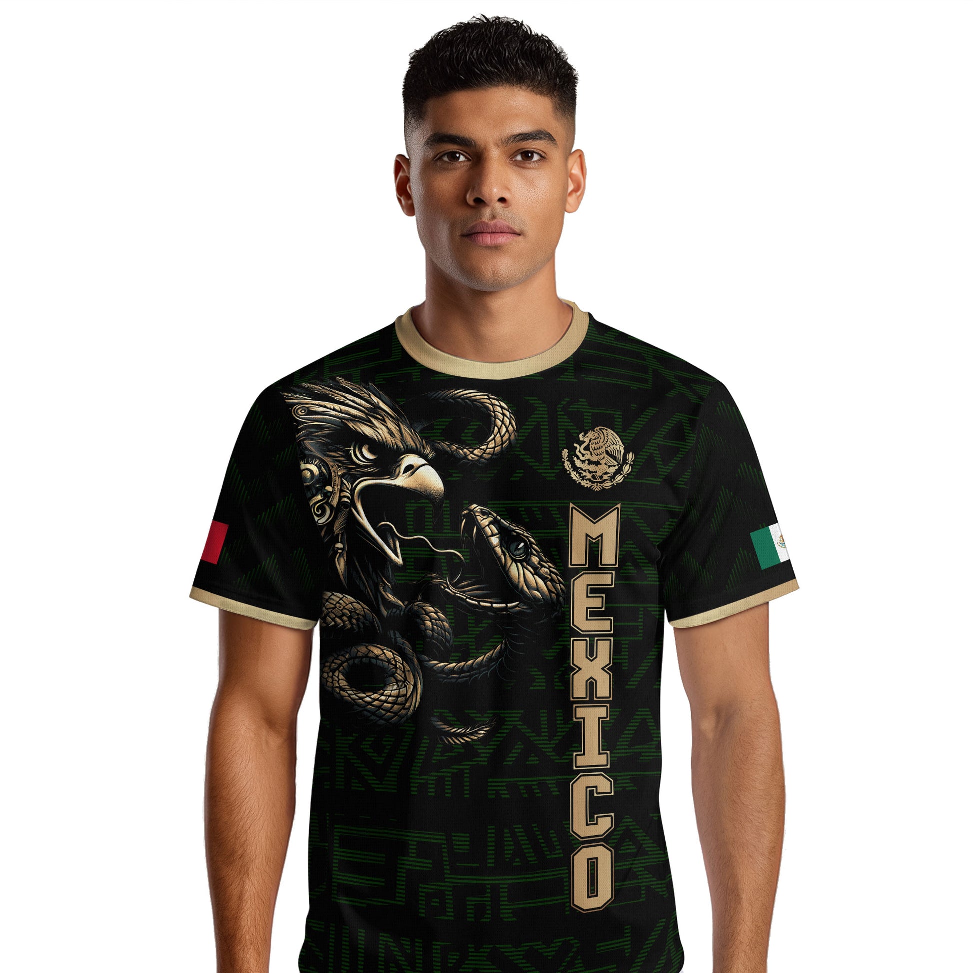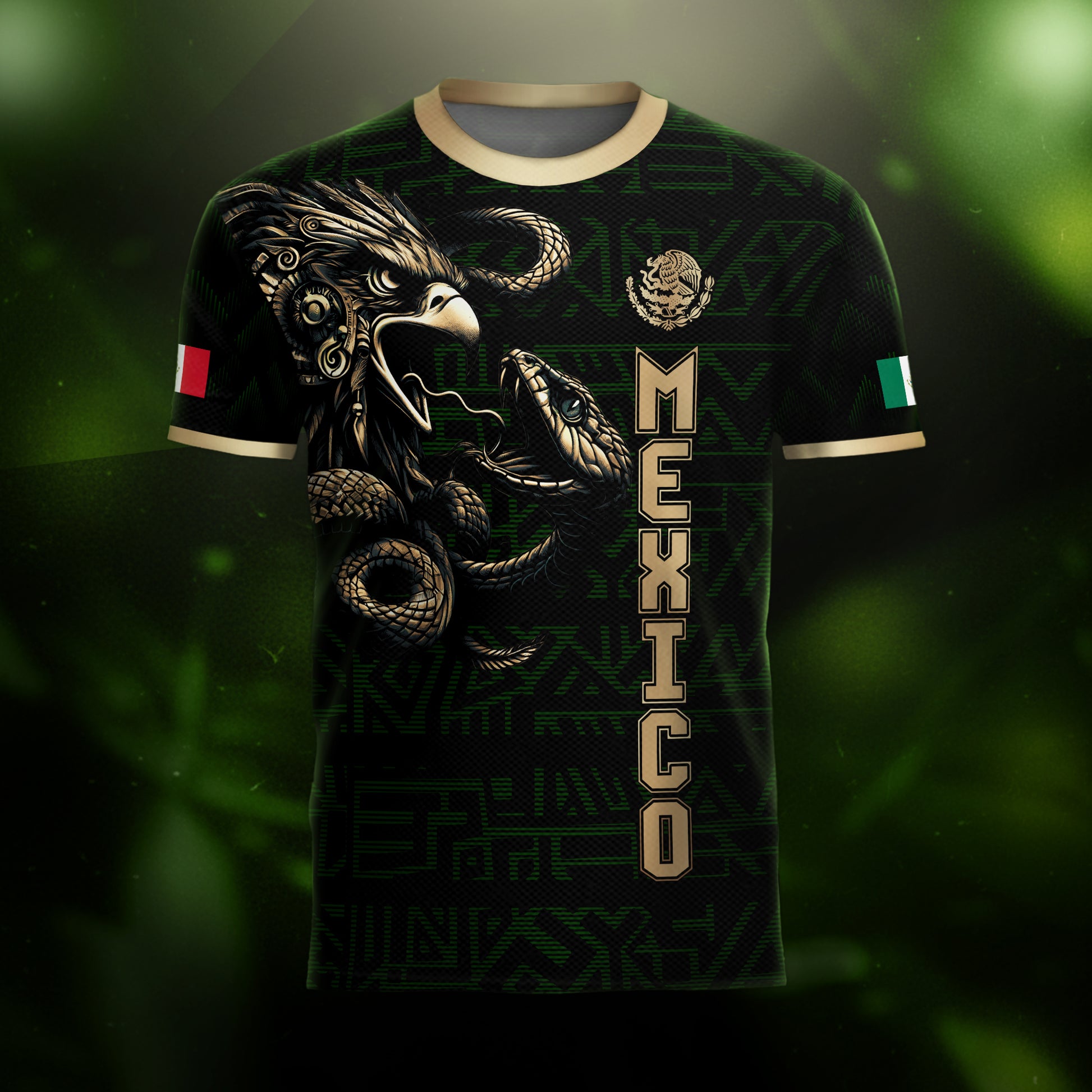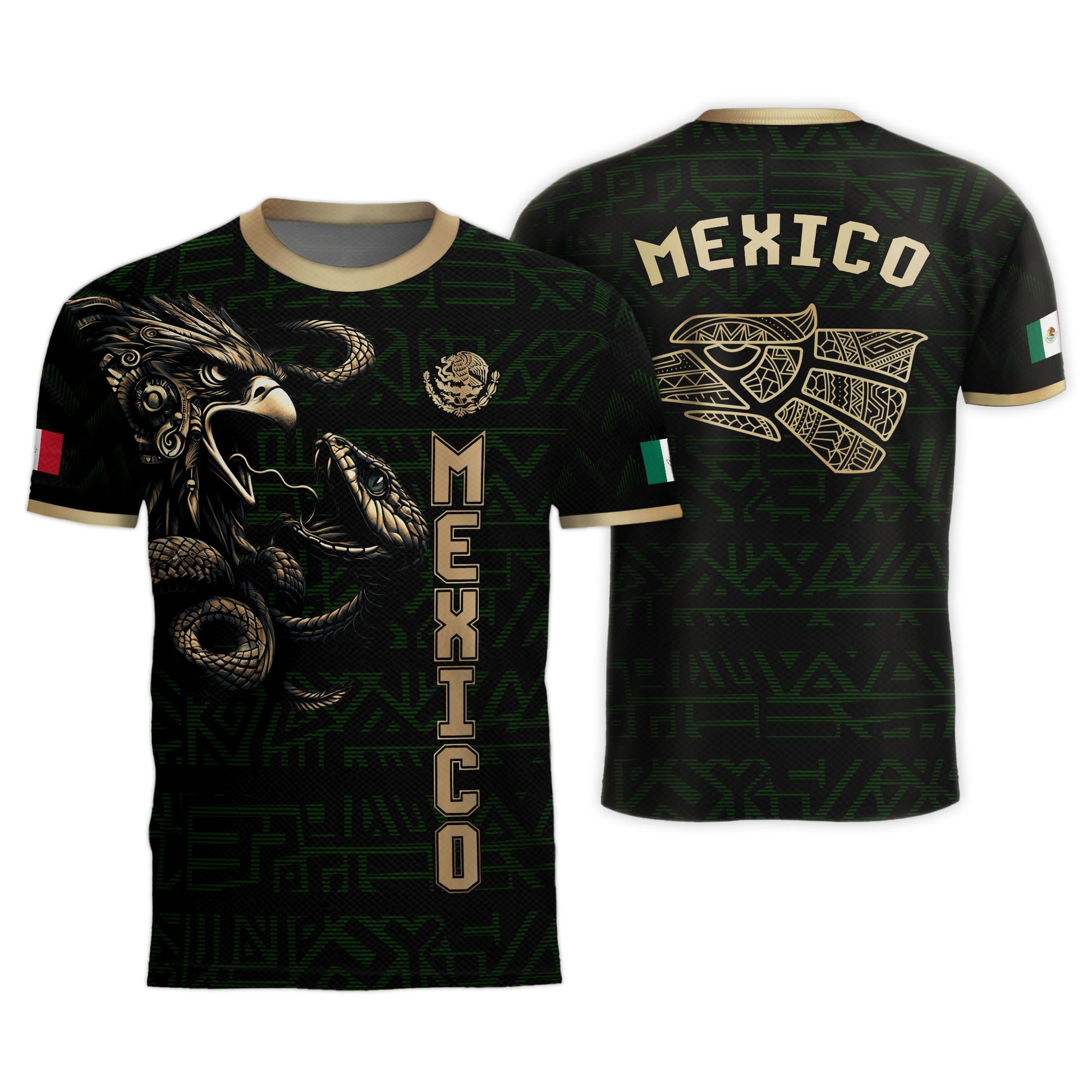 Unleash the warrior spirit with this stunning Mexico soccer jersey. It features a powerful black and gold design with a detailed Aztec eagle battling the serpent. A bold look for every true fan of El Tri.