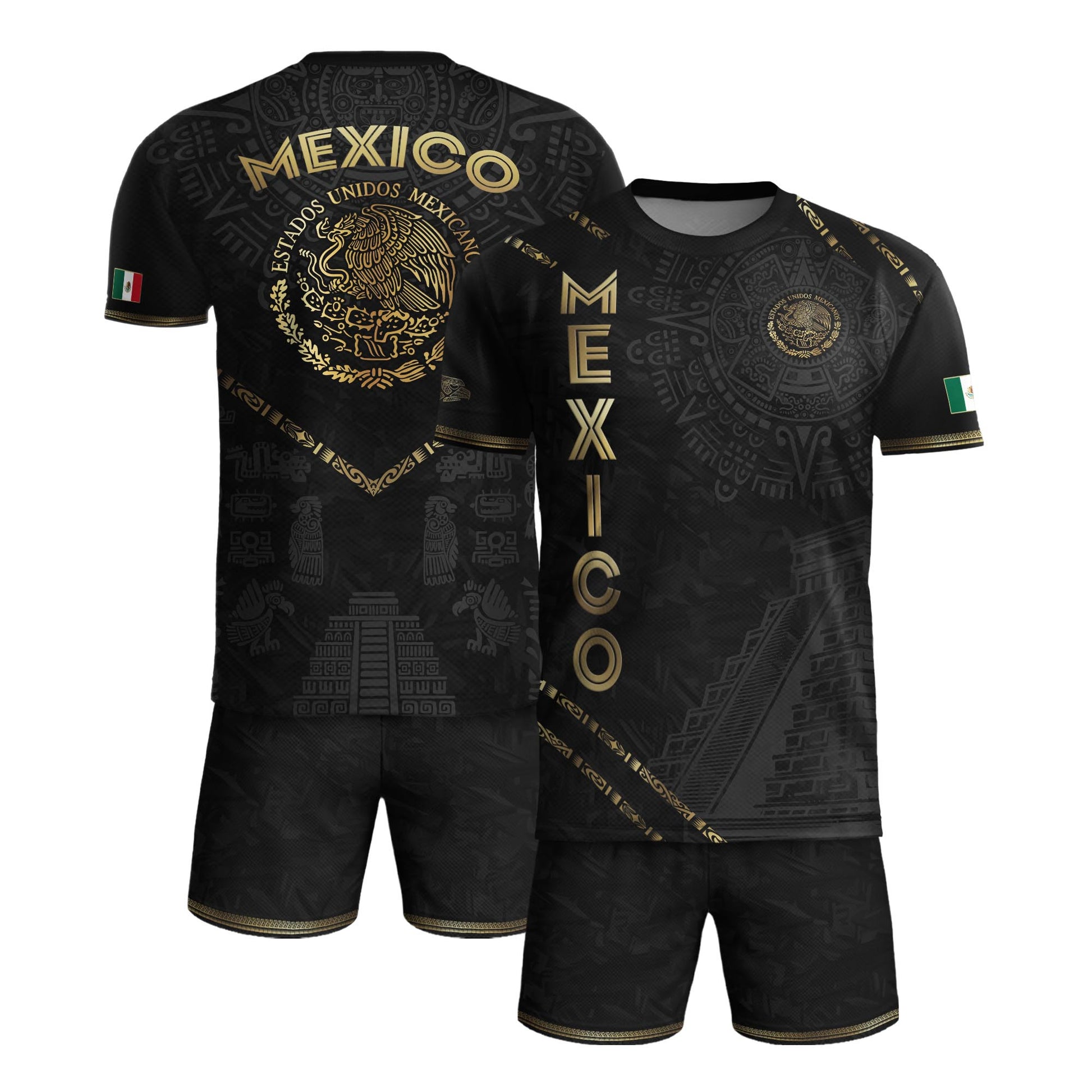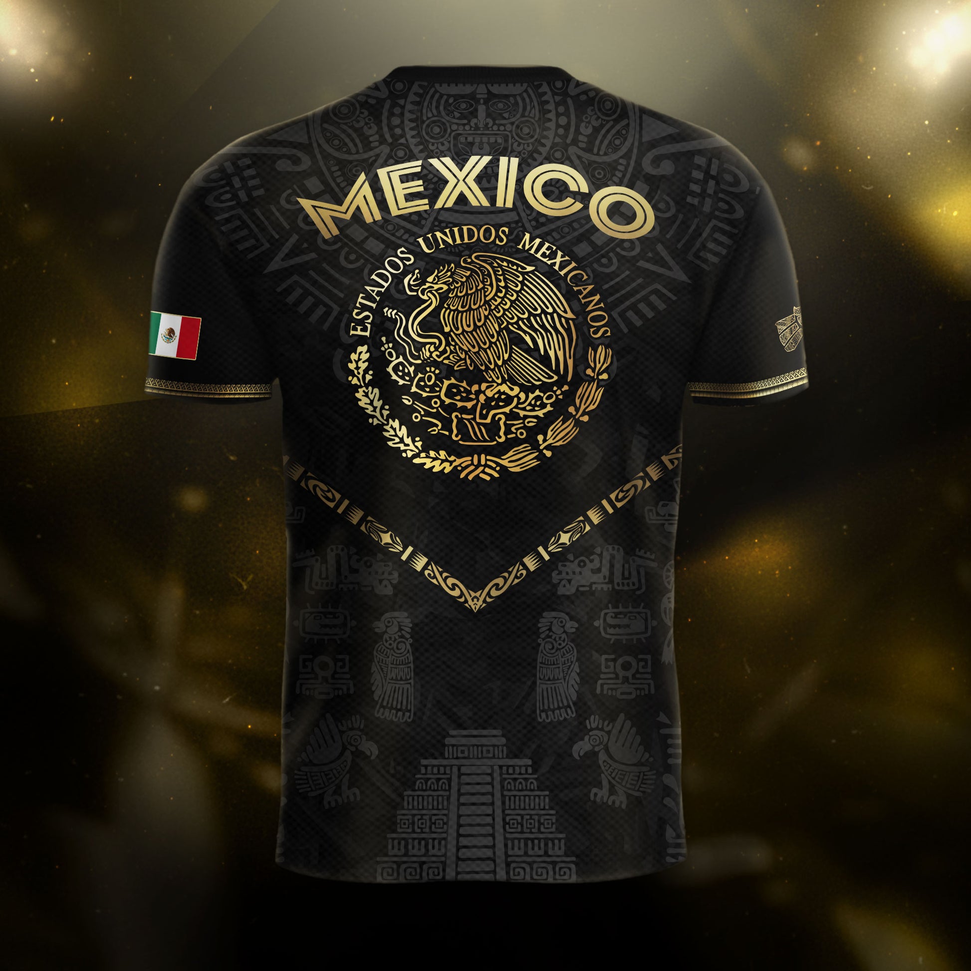 Show your pride in Mexico’s ancient legacy with this black and gold Aztec pyramid jersey — a bold blend of culture, history, and soccer passion.