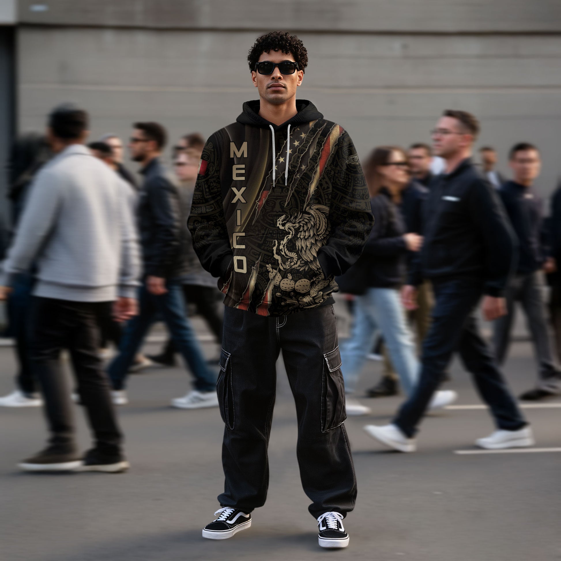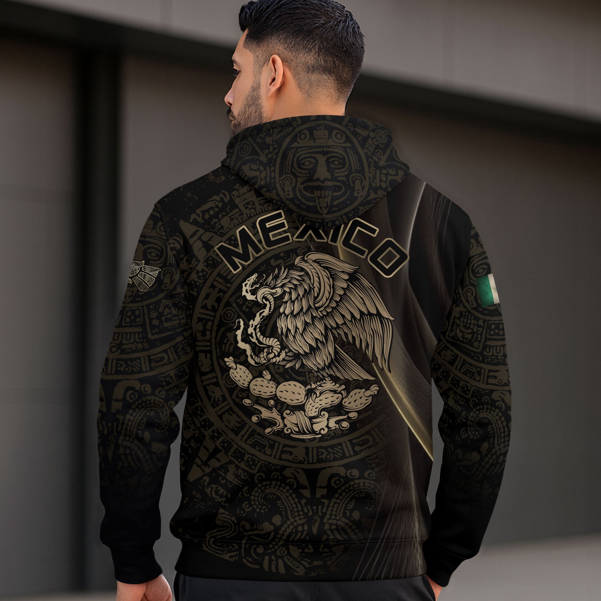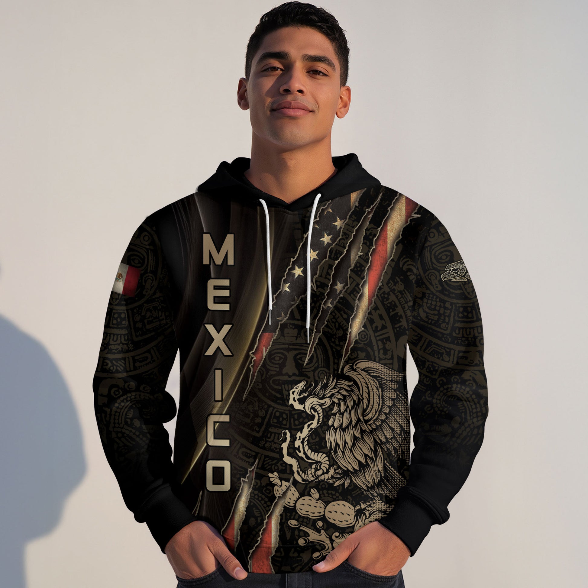 All over print hoodie blending Aztec patterns, golden eagle, and fierce claw mark design. A bold tribute to Mexico’s strength, pride, and warrior legacy.