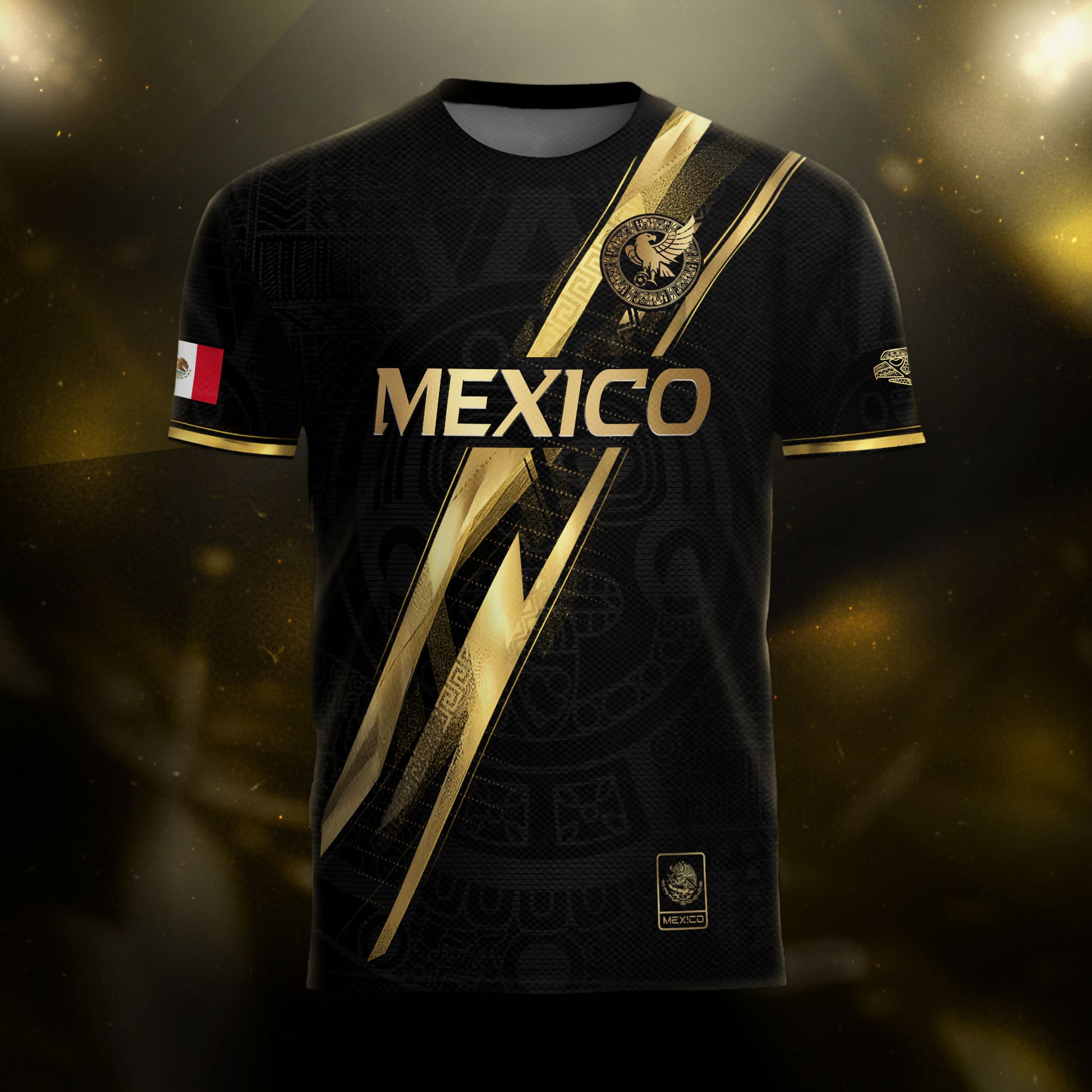 Bold and electrifying — this black and gold soccer jersey celebrates Mexico’s map and Aztec heritage with striking warrior energy.