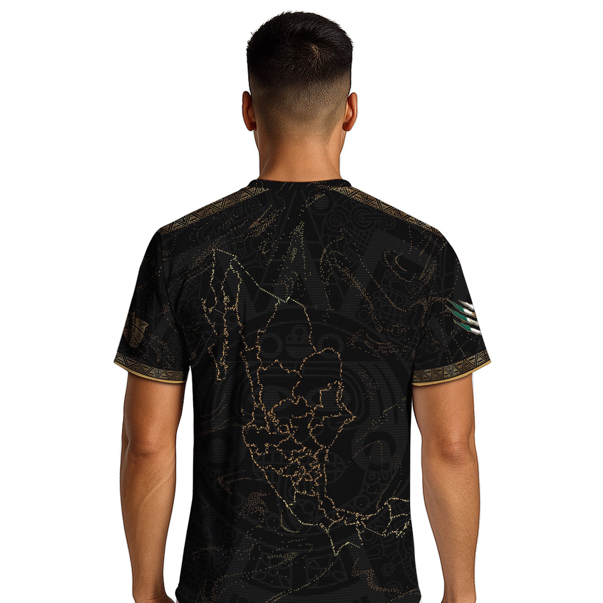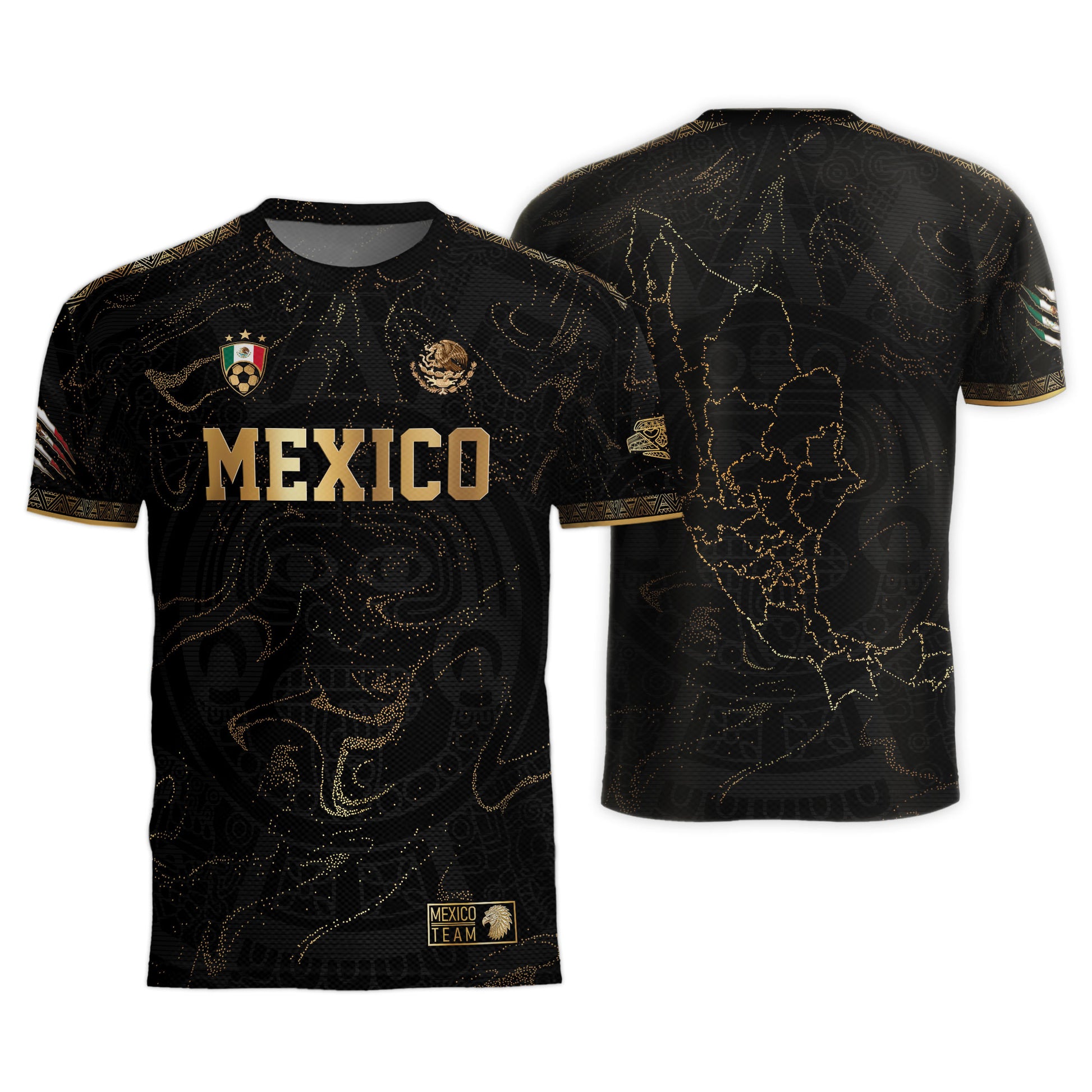 Celebrate Mexico’s legacy with this black and gold soccer jersey — a fusion of Aztec art, national map, and fearless pride.