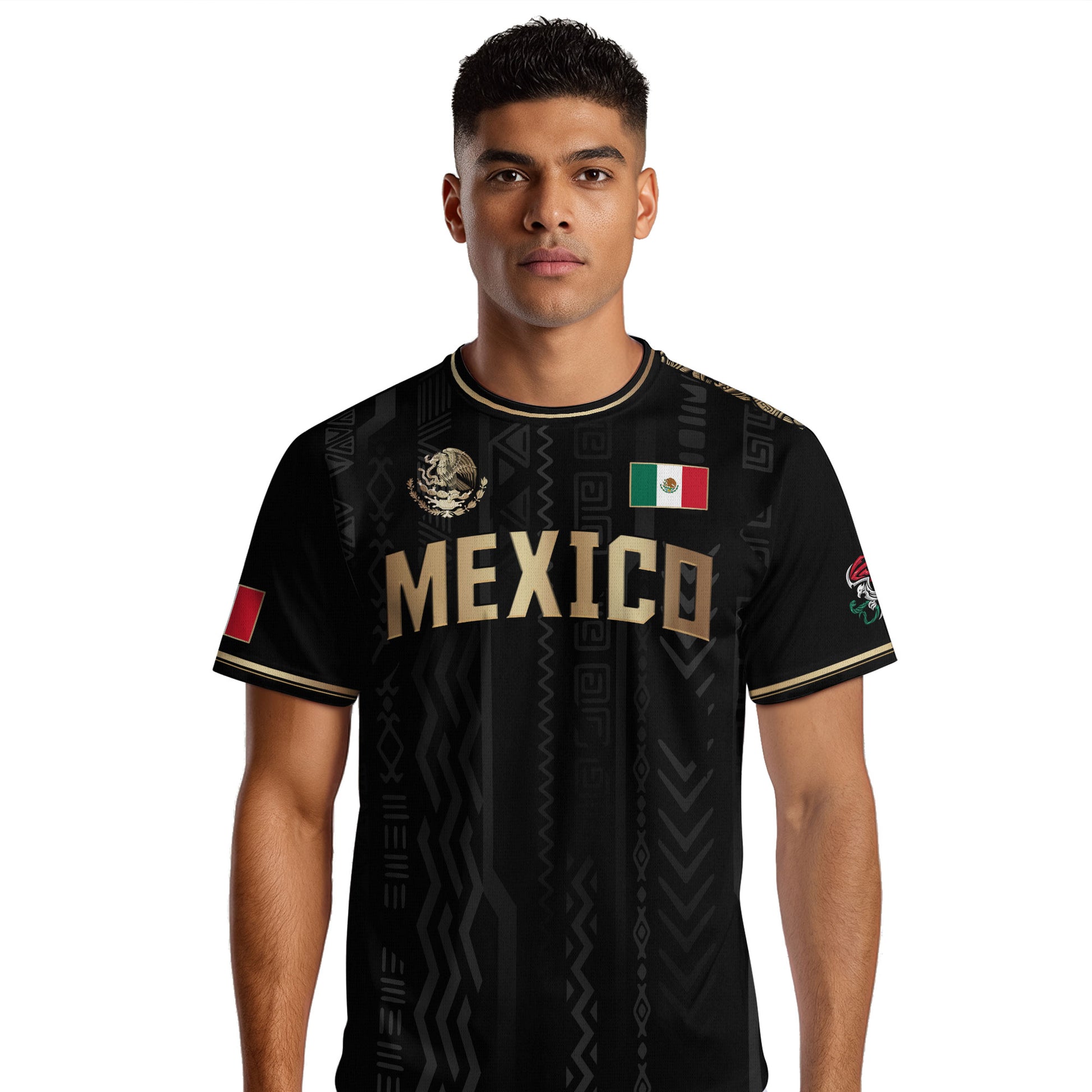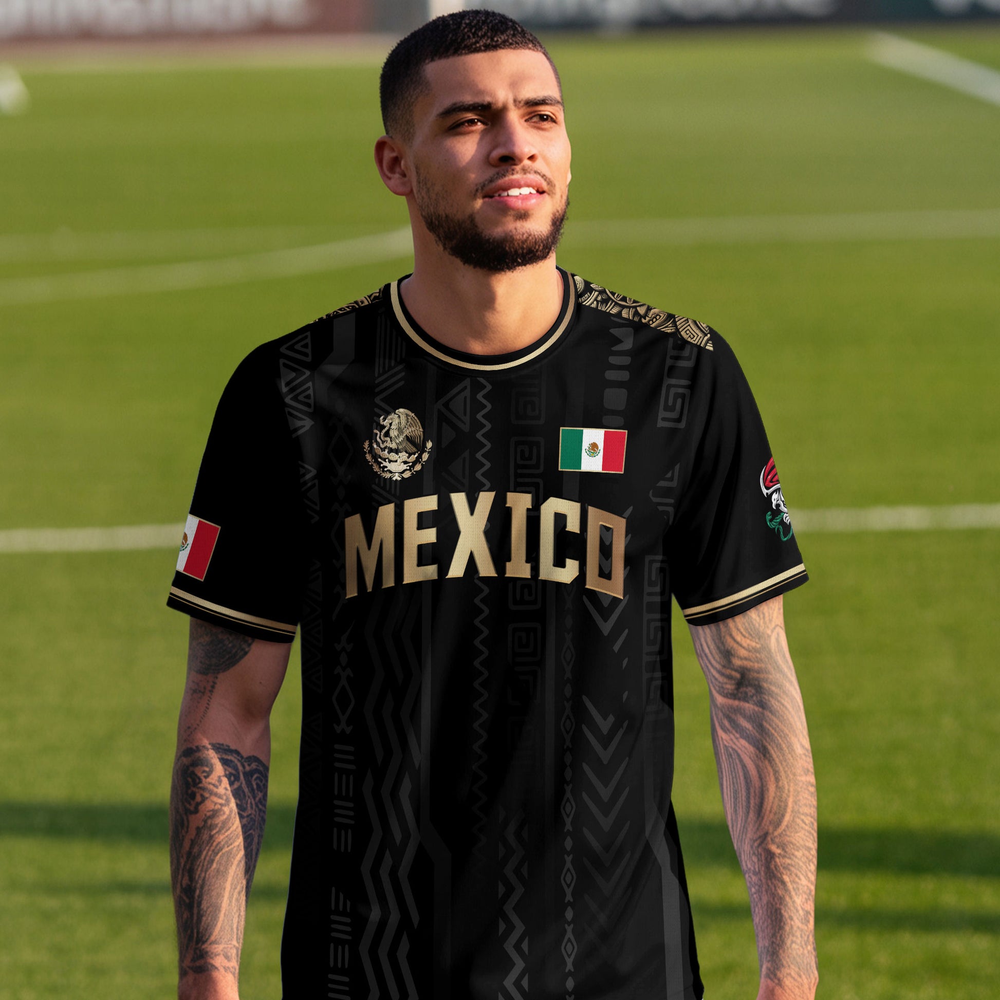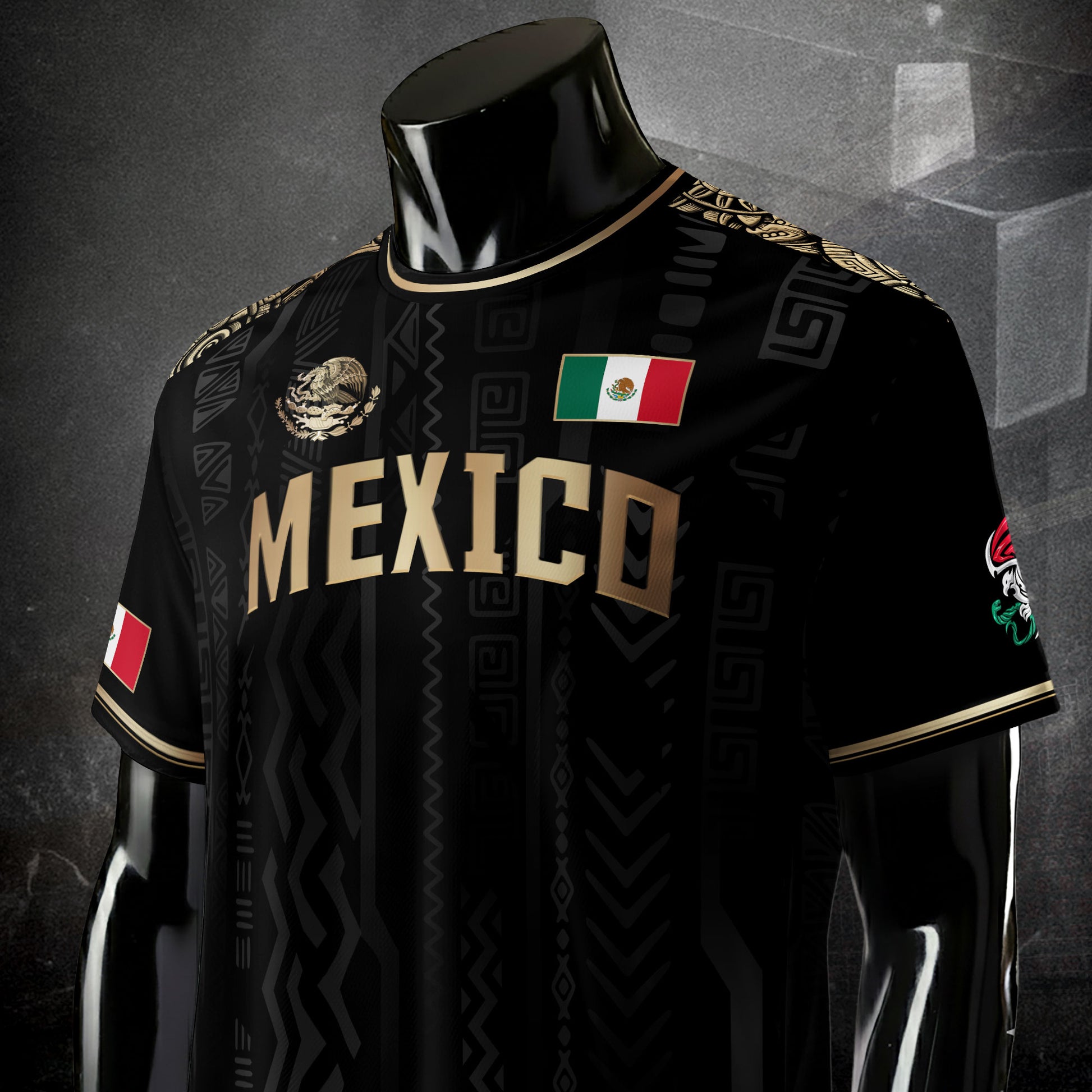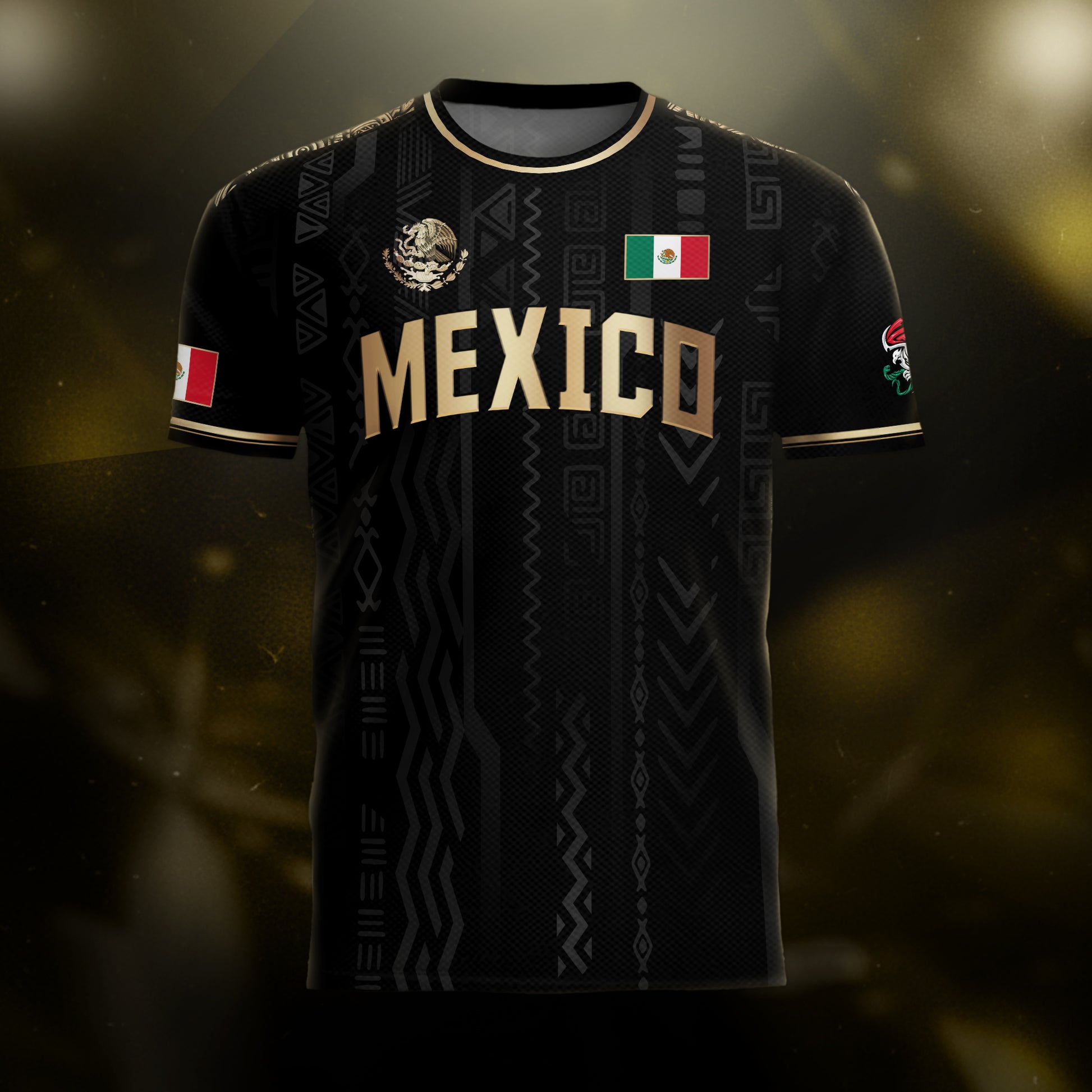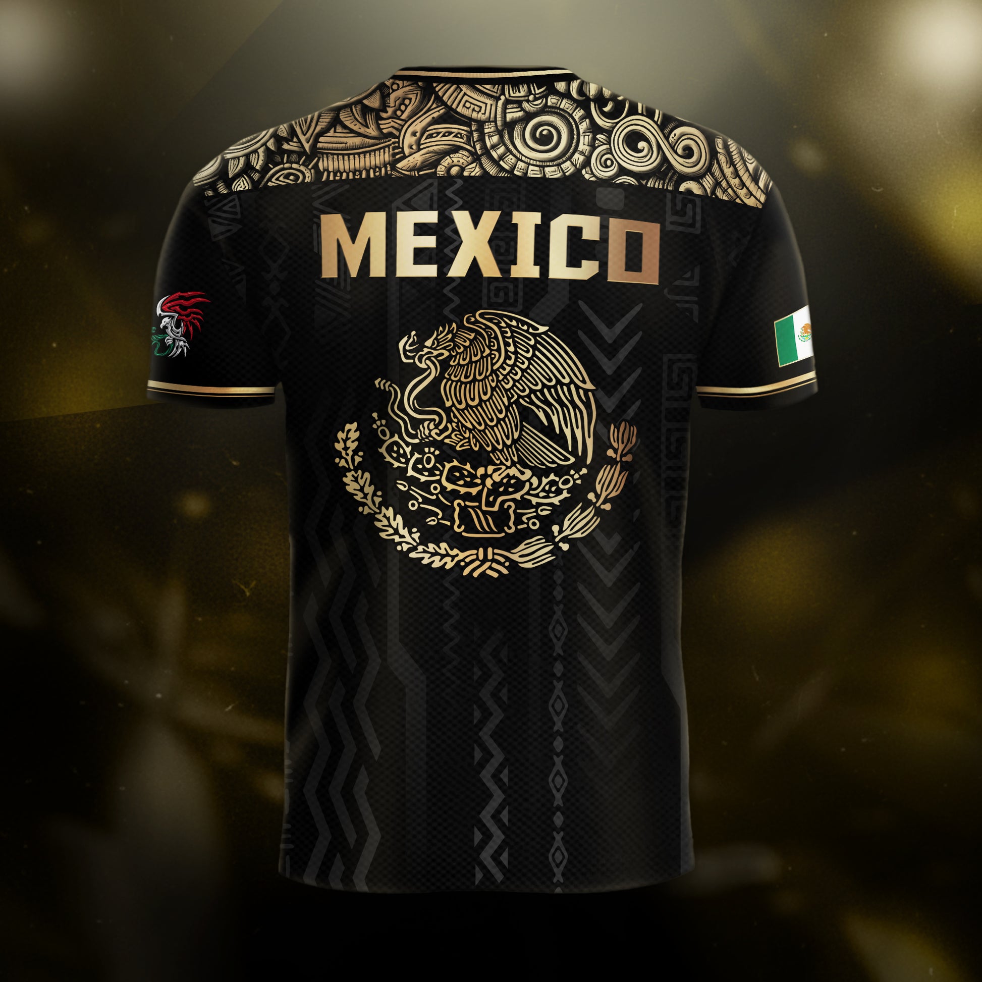 Make a bold statement with this elegant black and gold Mexico soccer jersey. It features prominent 'MEXICO' text on the chest and a stunning gold national emblem on the back. A premium design for the ultimate fan.