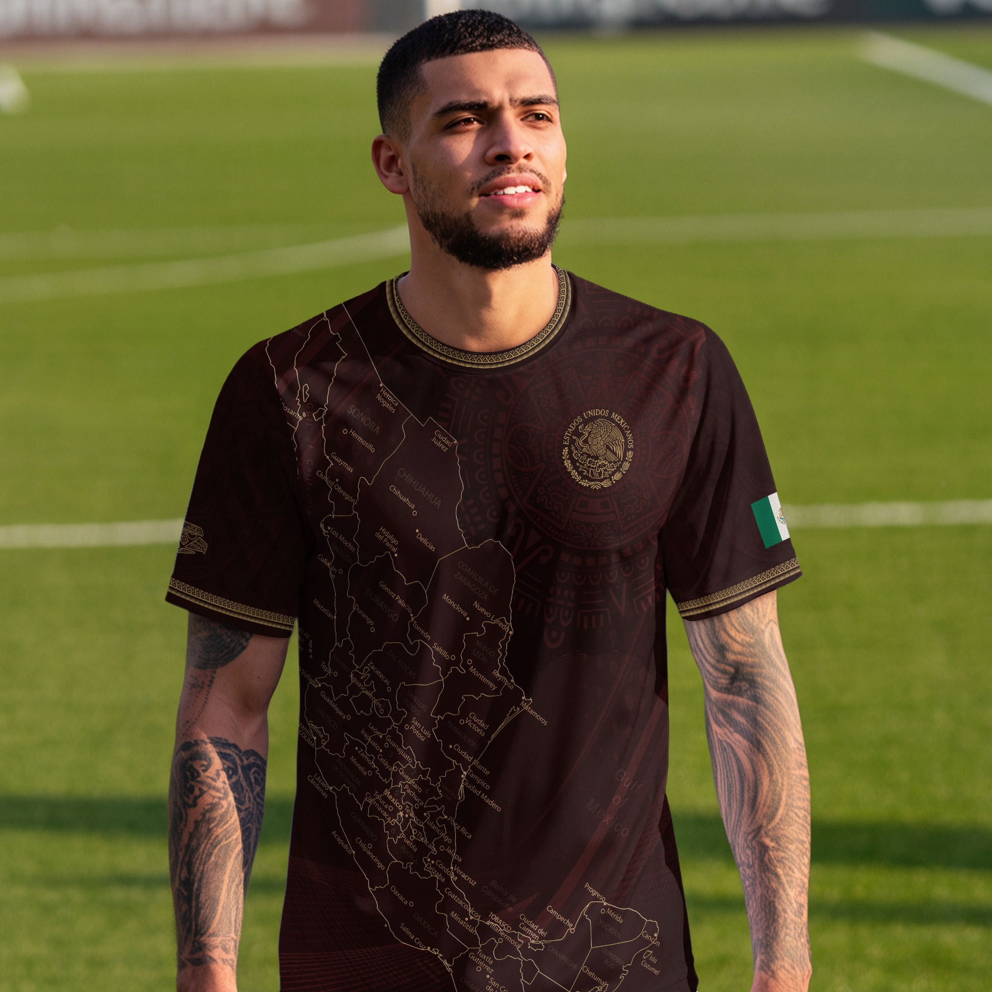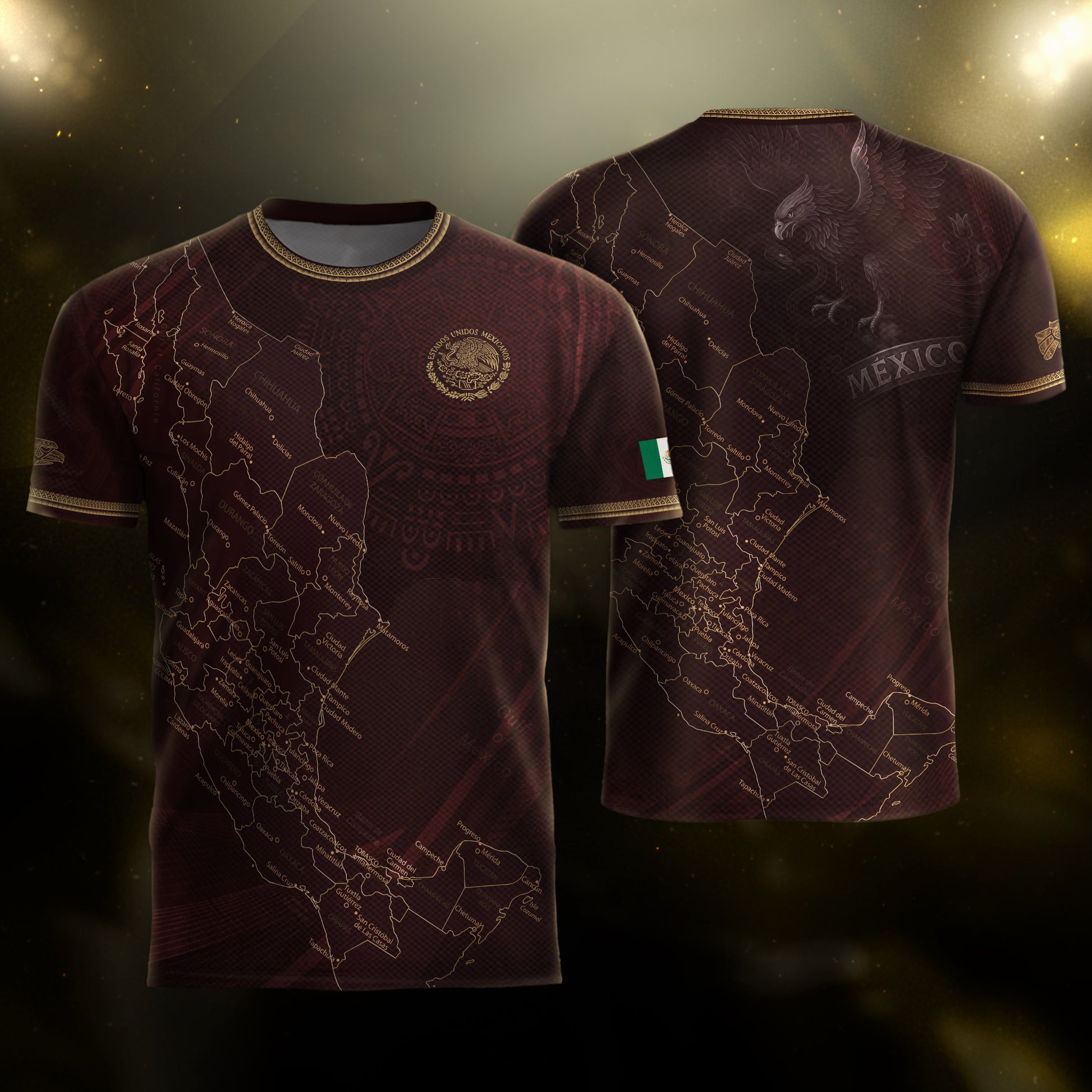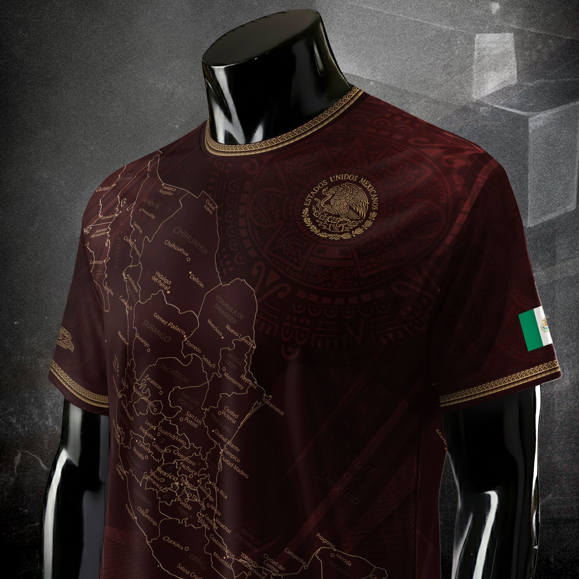 Celebrate Mexico’s unity and legacy with this burgundy map jersey — elegant Aztec art meets national pride.