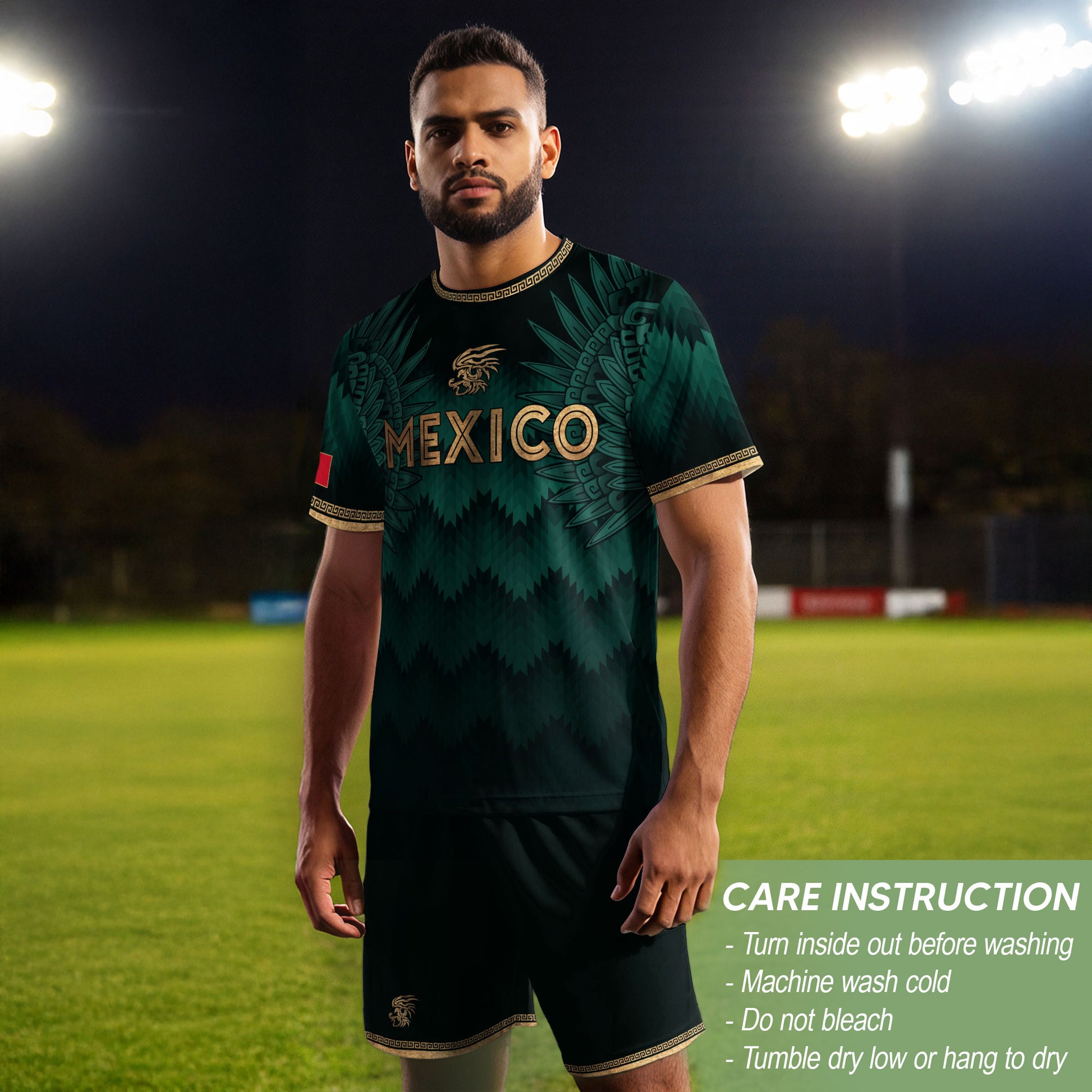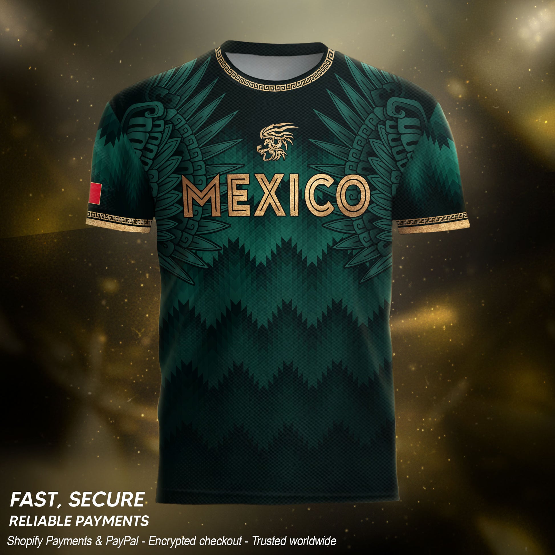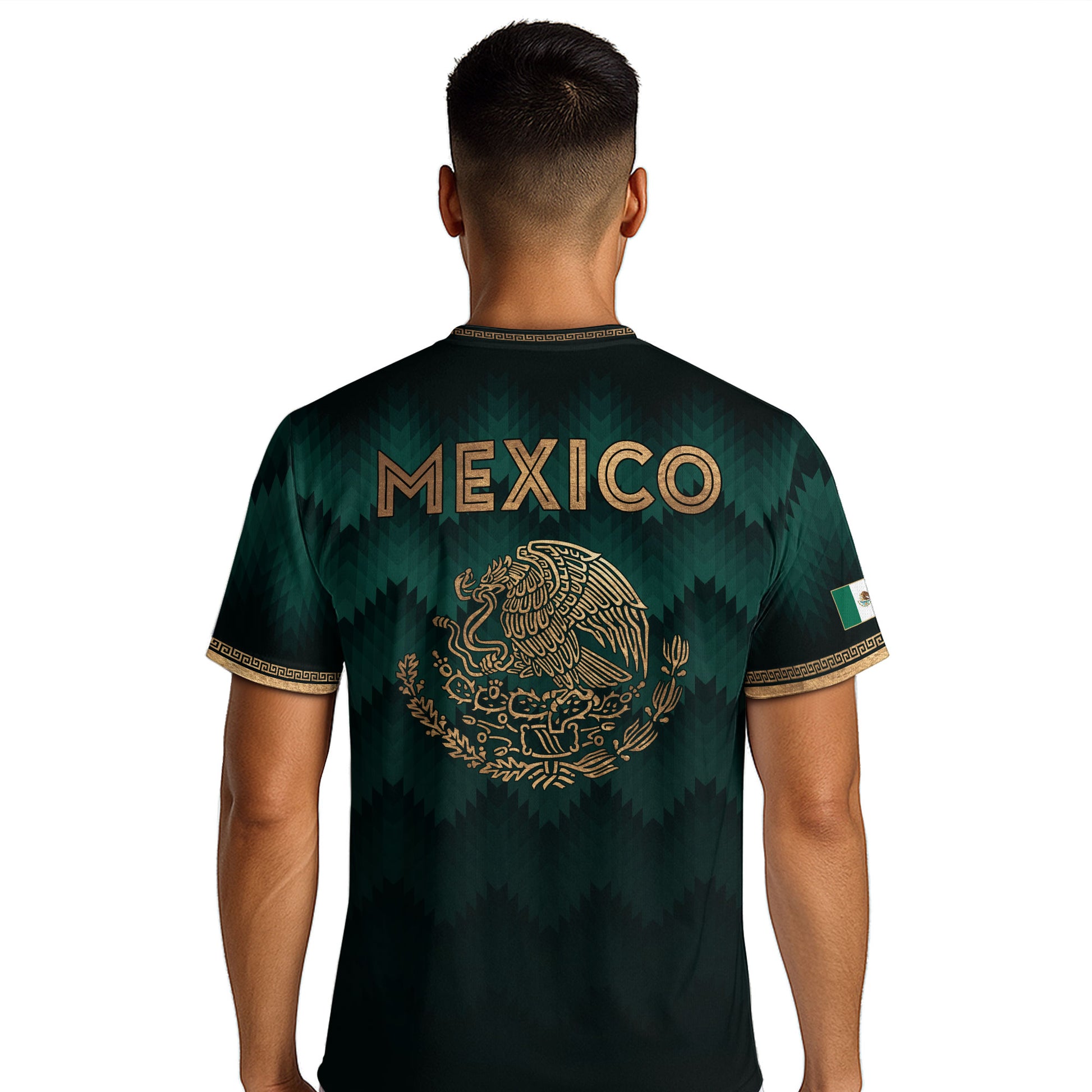Mexico Coat of Arms Green Gold Aztec Ziczac Pattern Wing Graphic Heritage Soccer Jersey