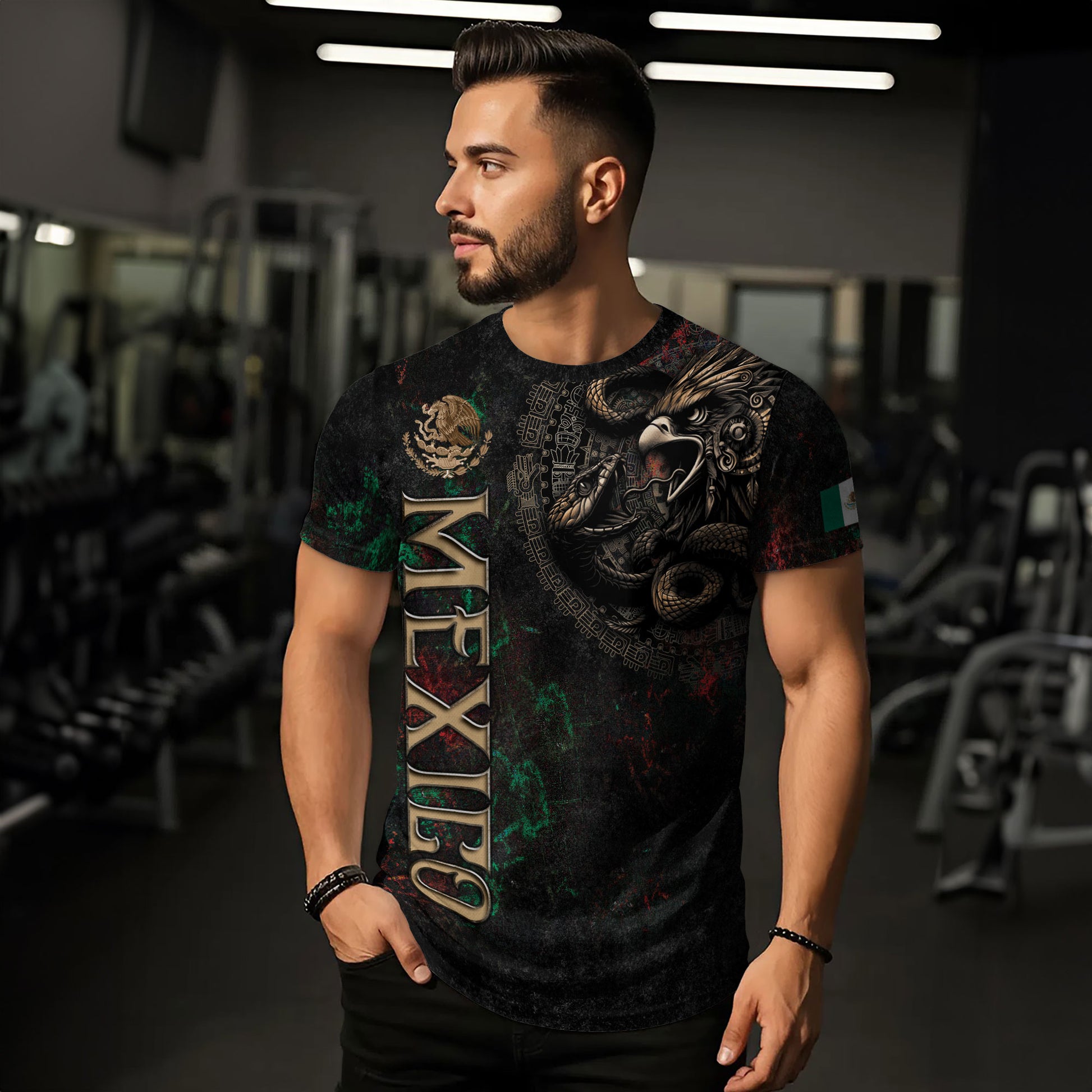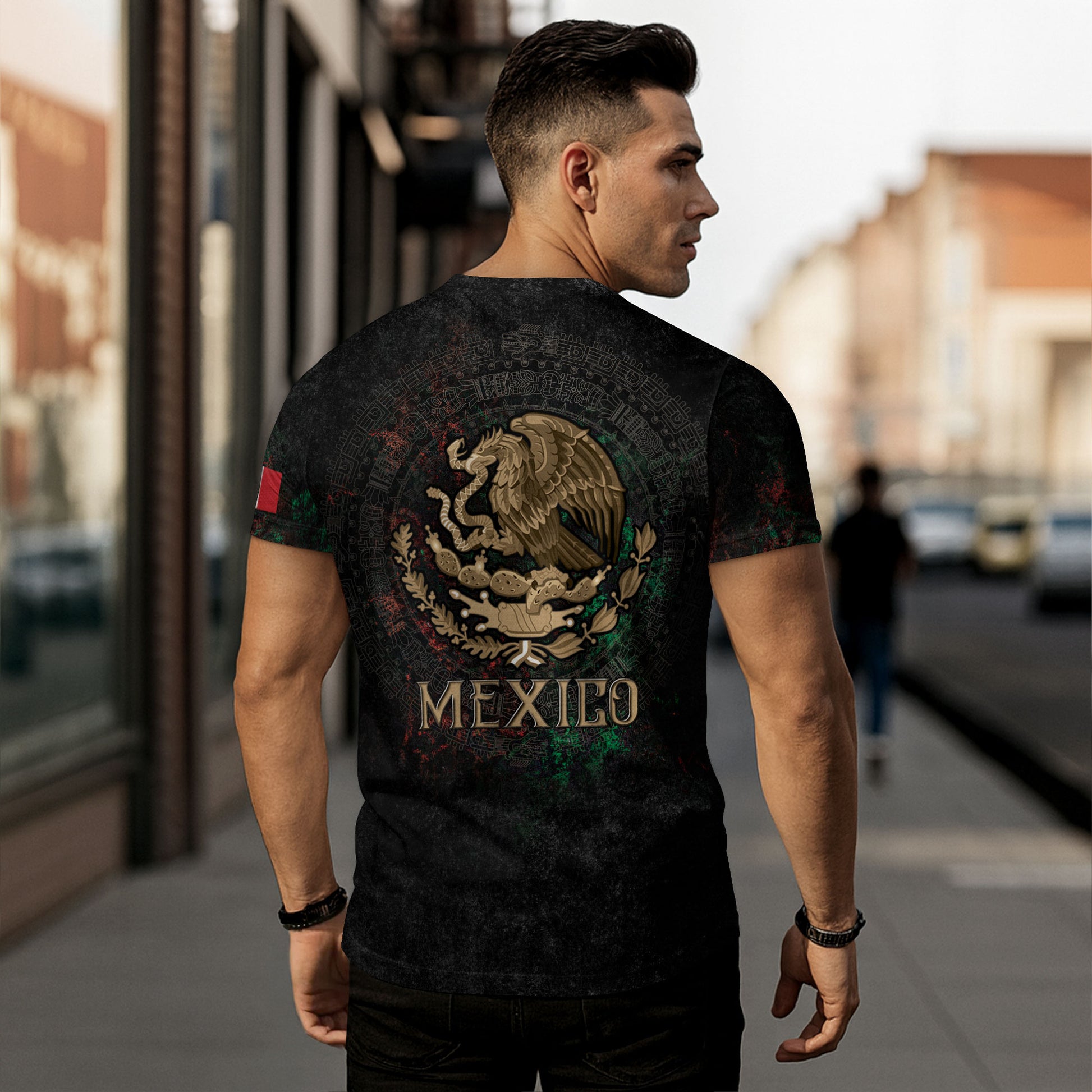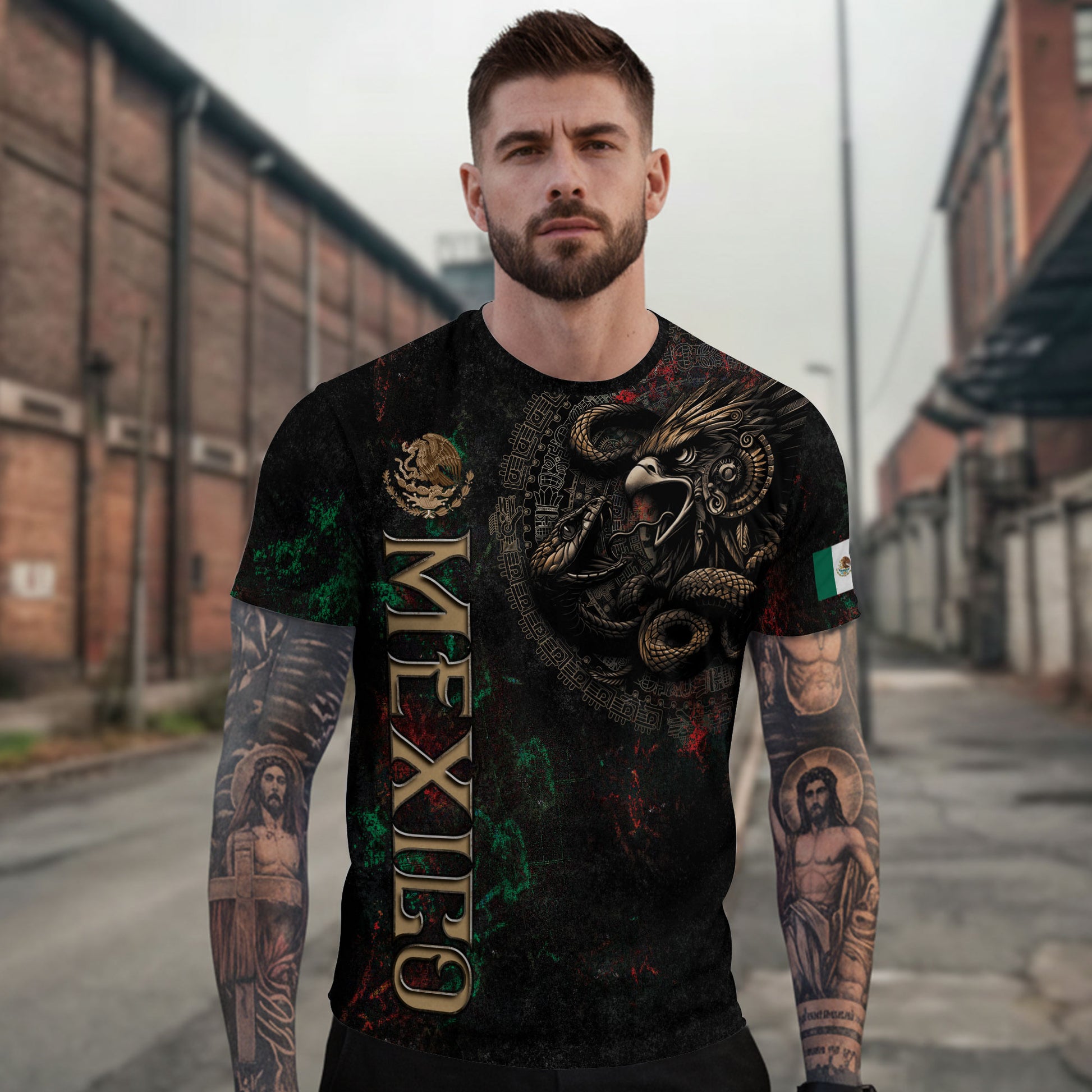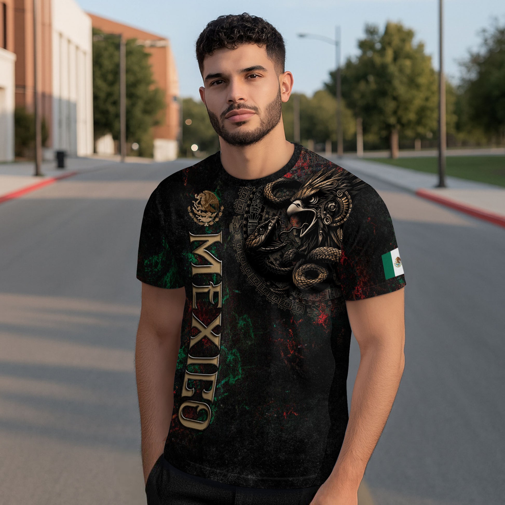 Embrace Mexican heritage with this 3D Aztec Eagle and Serpent shirt. Its black and gold design with red-green accents embodies warrior spirit and national pride.
