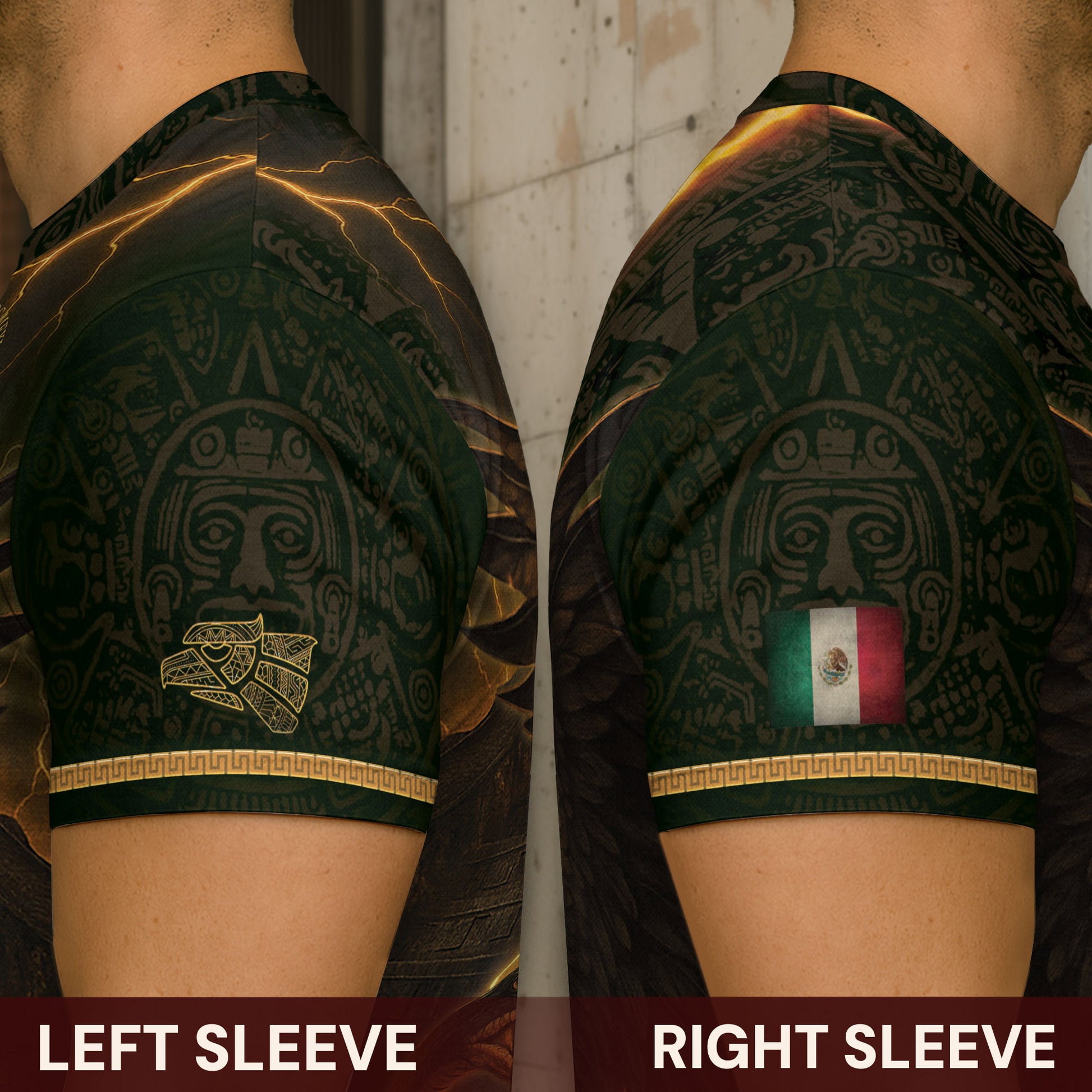 An electrifying all over print shirt featuring Mexico’s eagle and serpent above the Aztec pyramid. Lightning energy and gold tones honor strength, pride, and heritage.