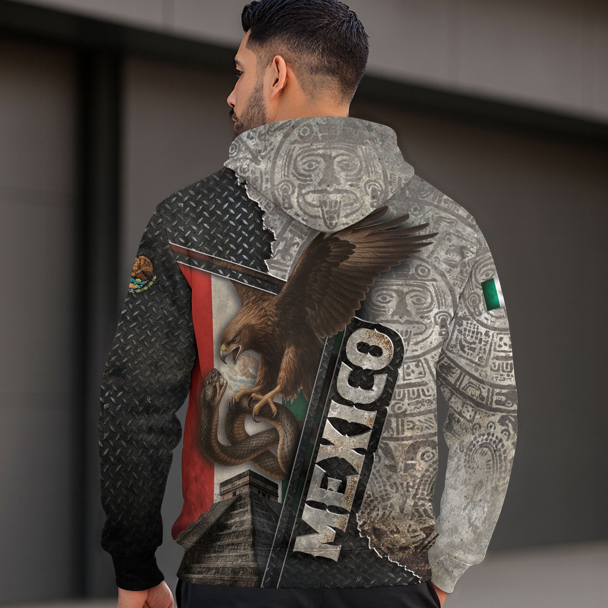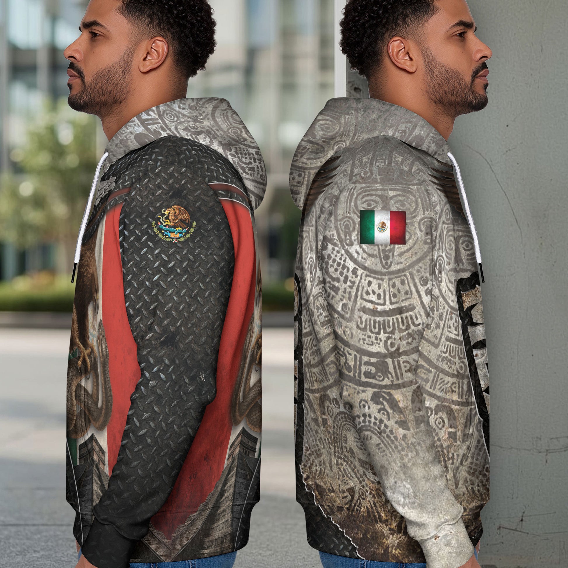 A striking all over print hoodie merging Mexico’s flag, Aztec pyramid, and eagle design with stone and steel details. A bold tribute to heritage and national pride.