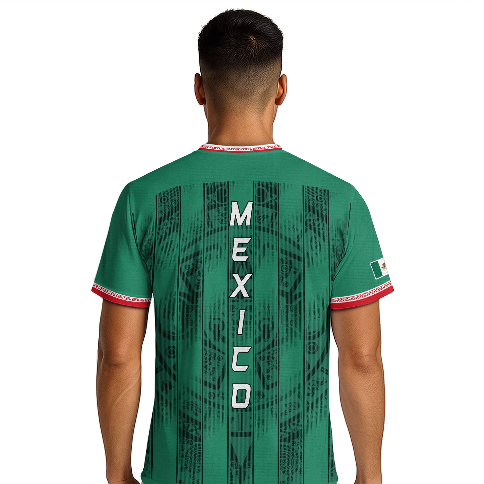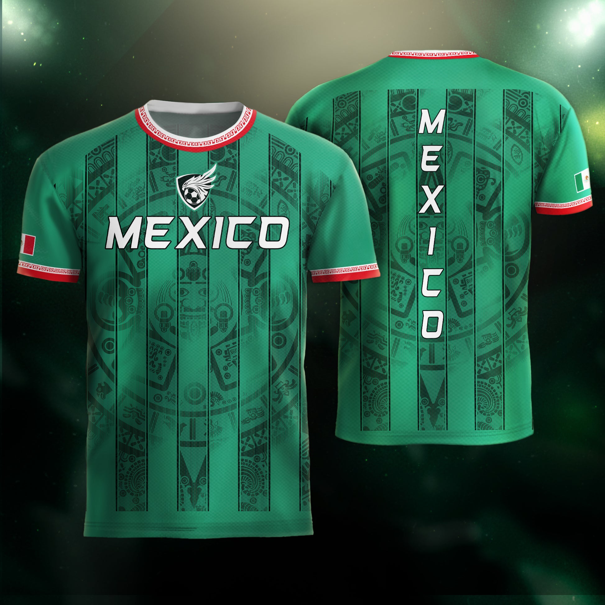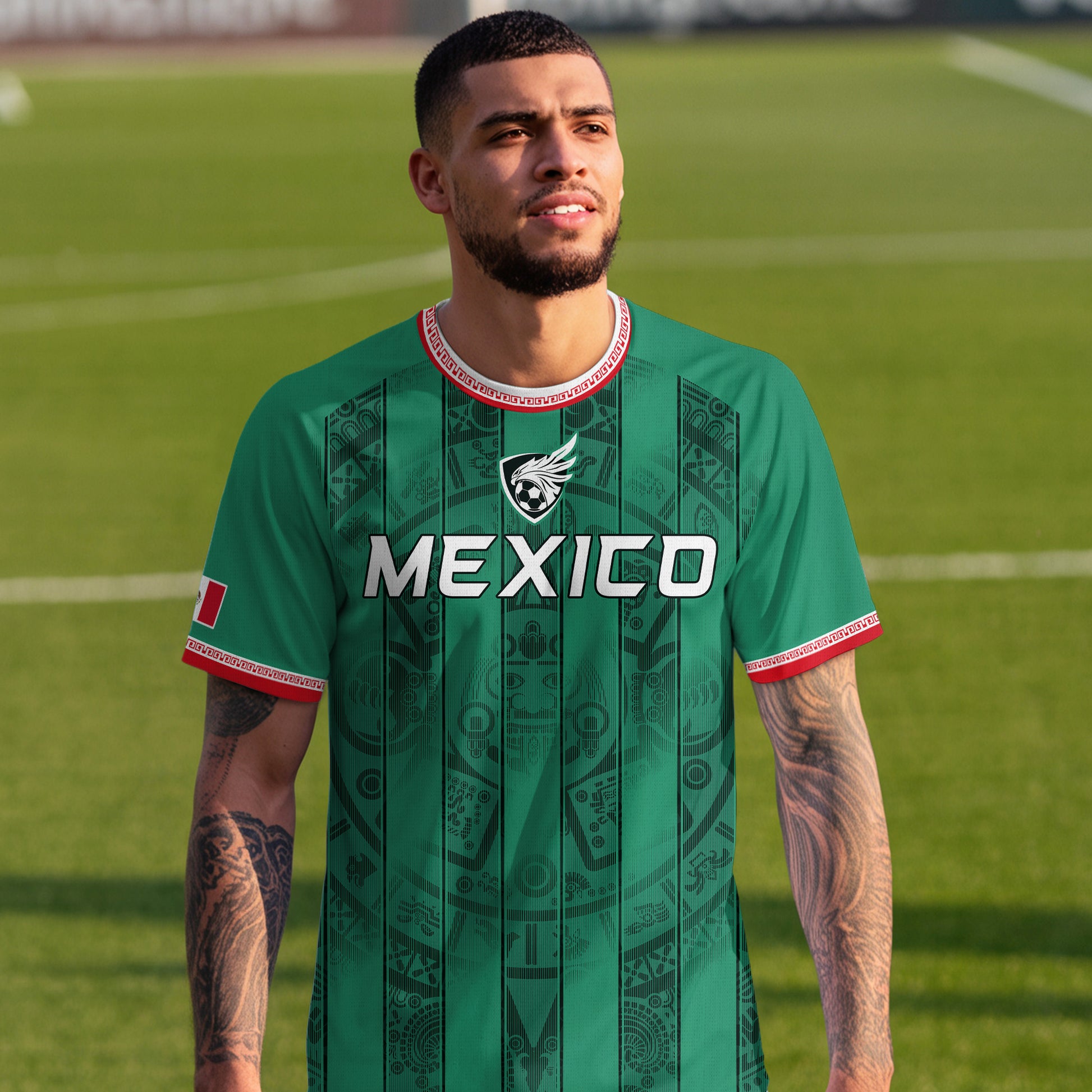 Honor Mexico’s heritage with this Green Aztec Pattern Soccer Jersey showcasing bold indigenous designs and national pride. Made from high-quality polyester that is soft, lightweight, breathable, and quick-drying, this jersey delivers comfort and performance for matches, training, and everyday wear.