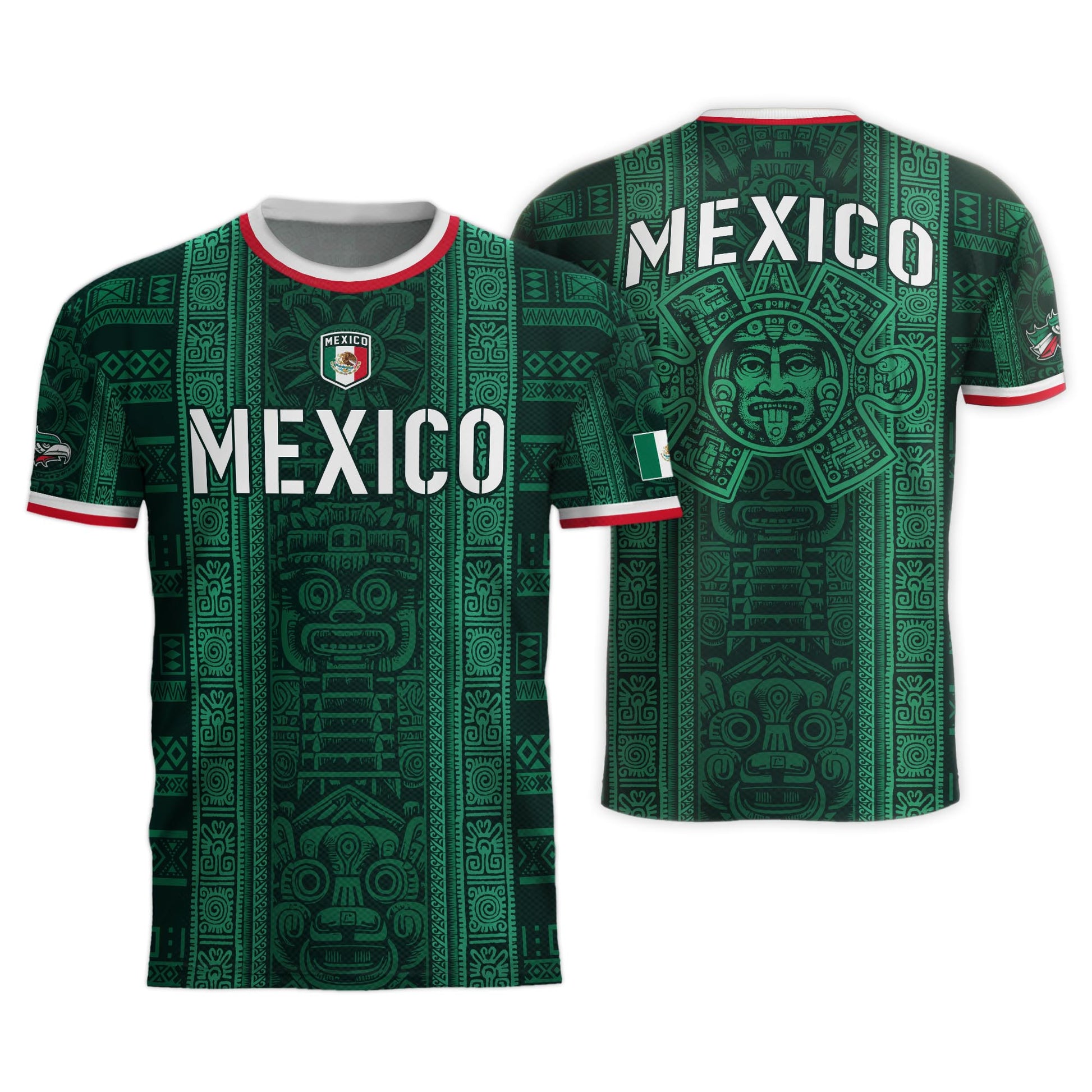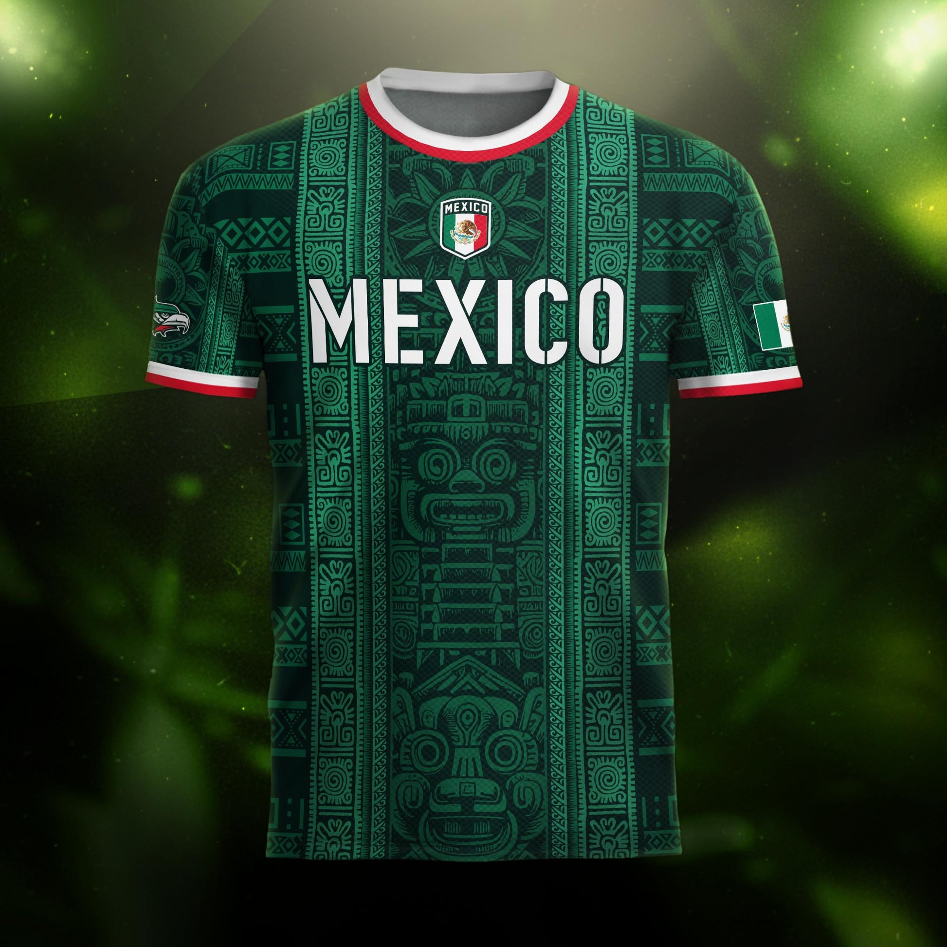 Show your Mexican pride with this vibrant green Aztec warrior jersey — blending ancient artistry with modern soccer passion.
