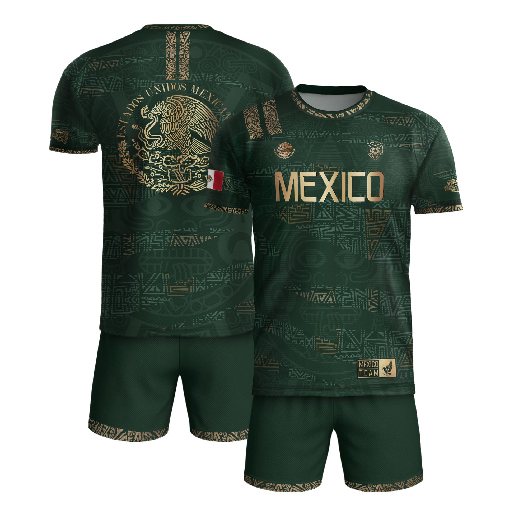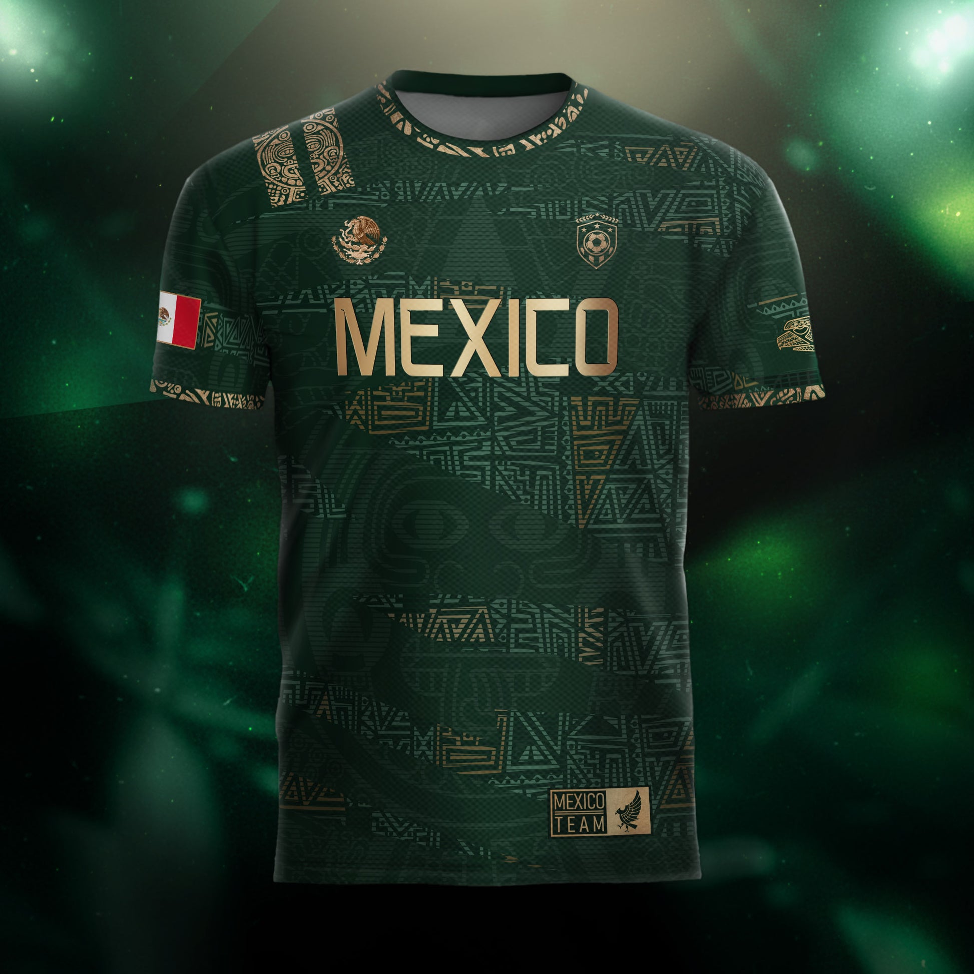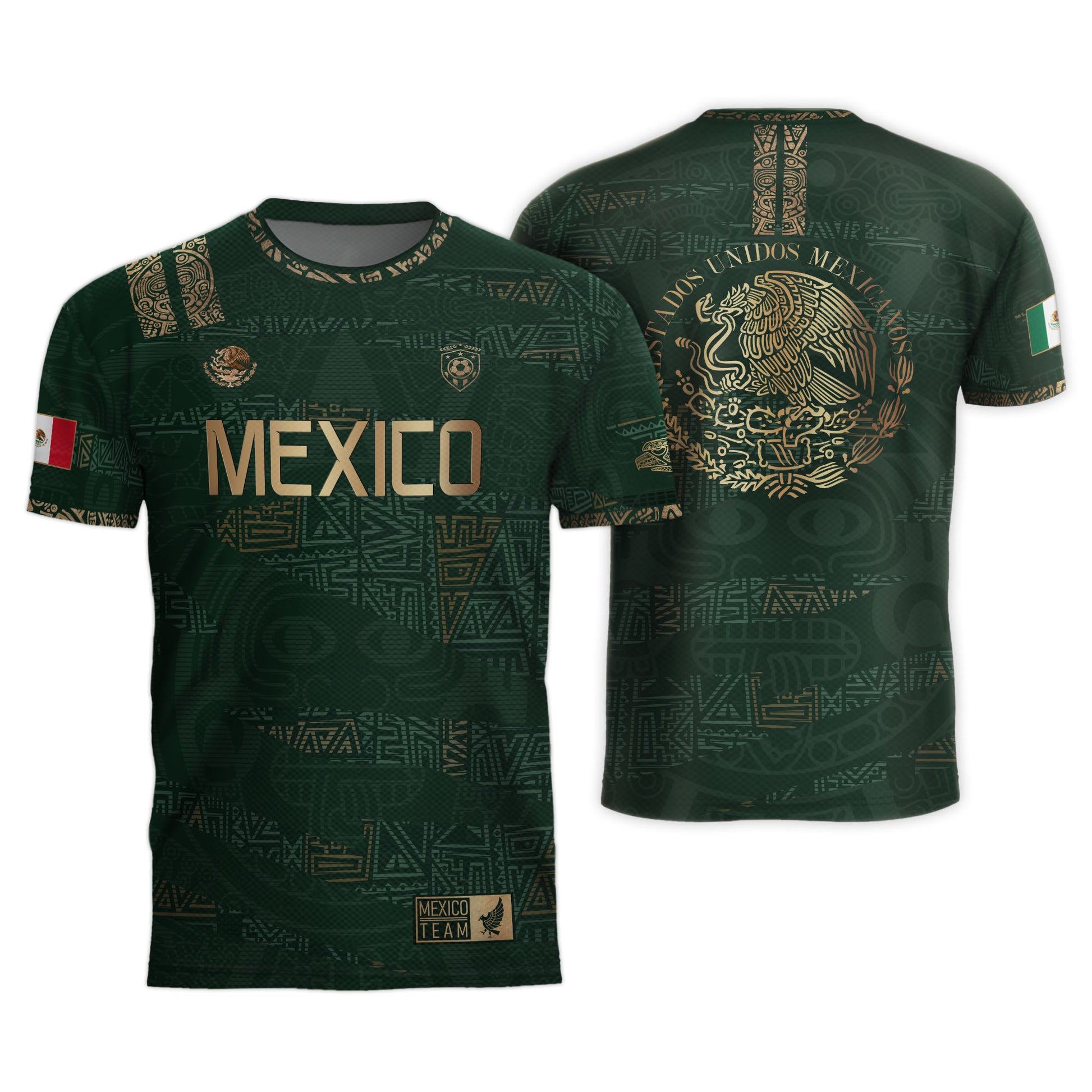 Classic green Mexico soccer jersey with gold Aztec details and national crest. A bold design honoring tradition and football passion.