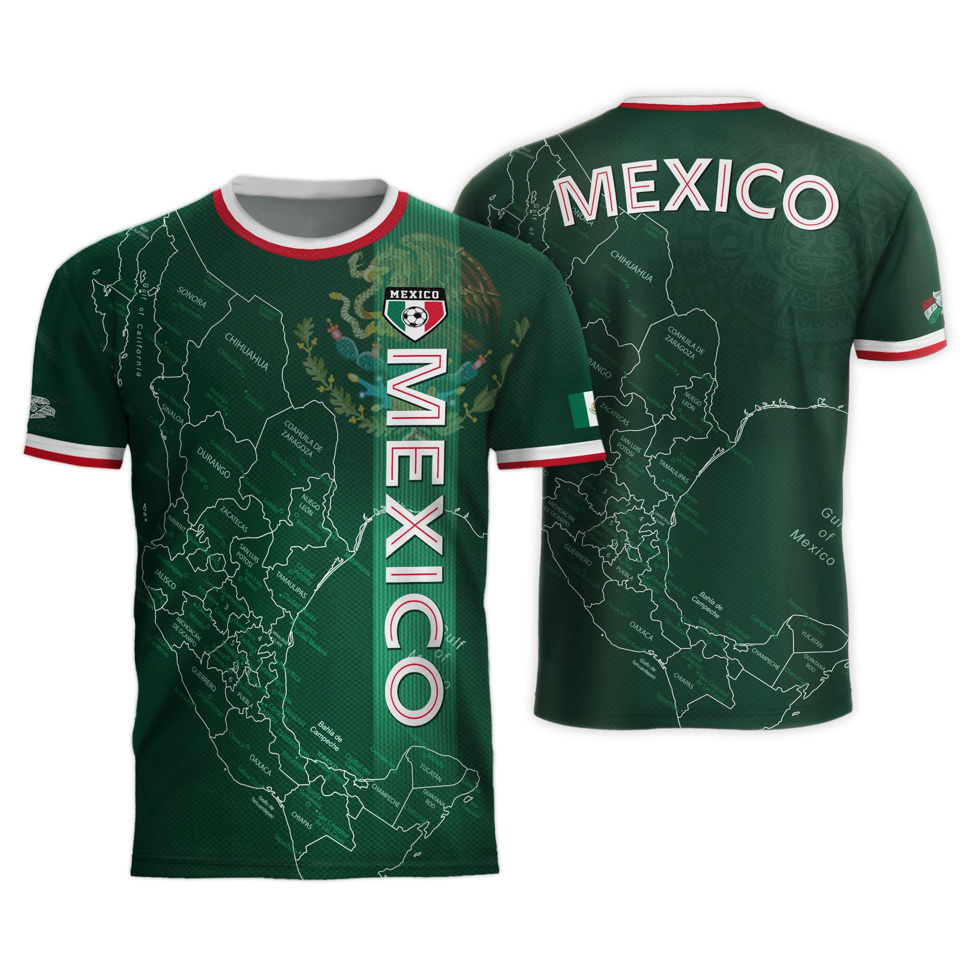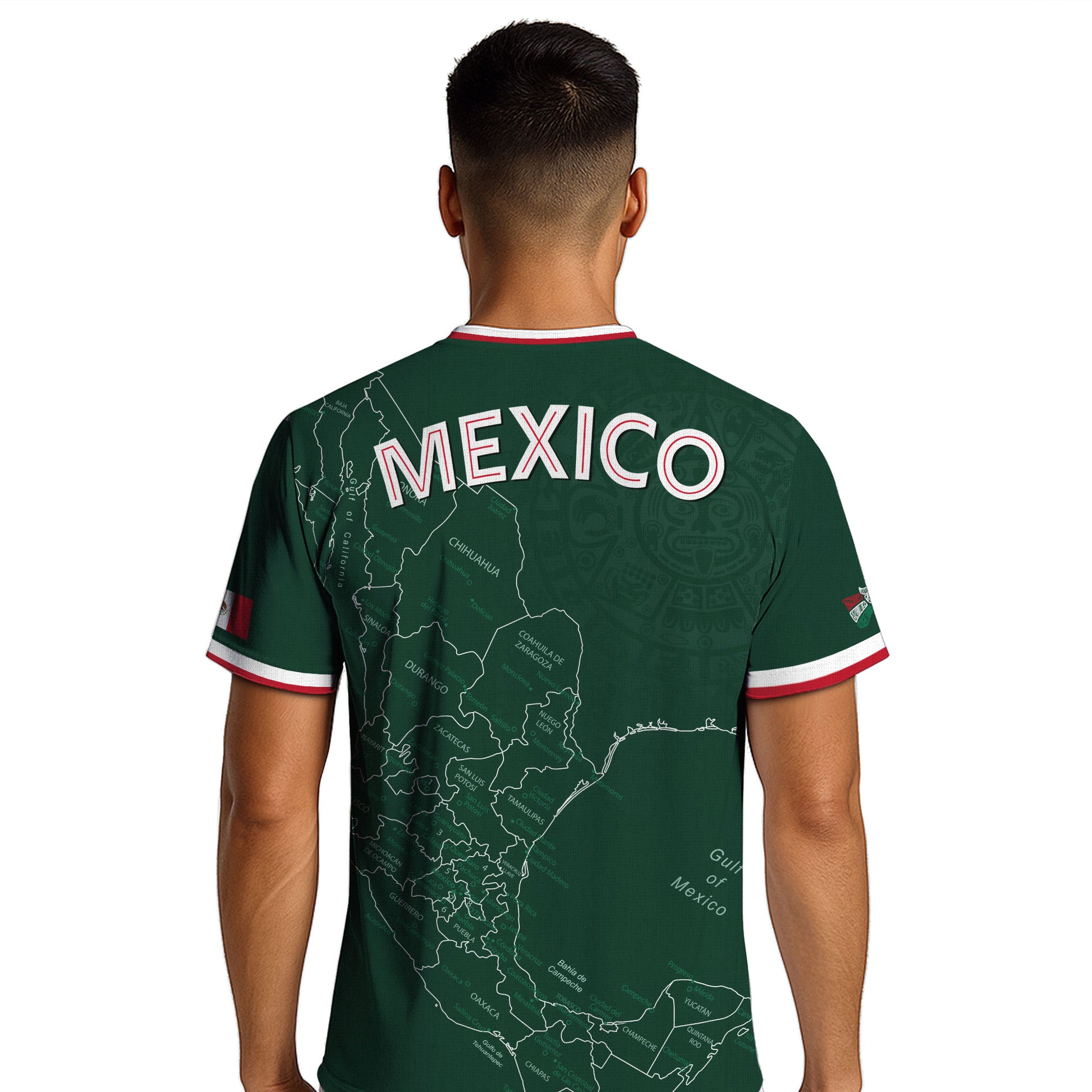 Wear your pride with this Mexico green heritage map soccer jersey. The detailed map and subtle Aztec textures honor Mexico’s roots — a perfect blend of tradition and bold modern style.
