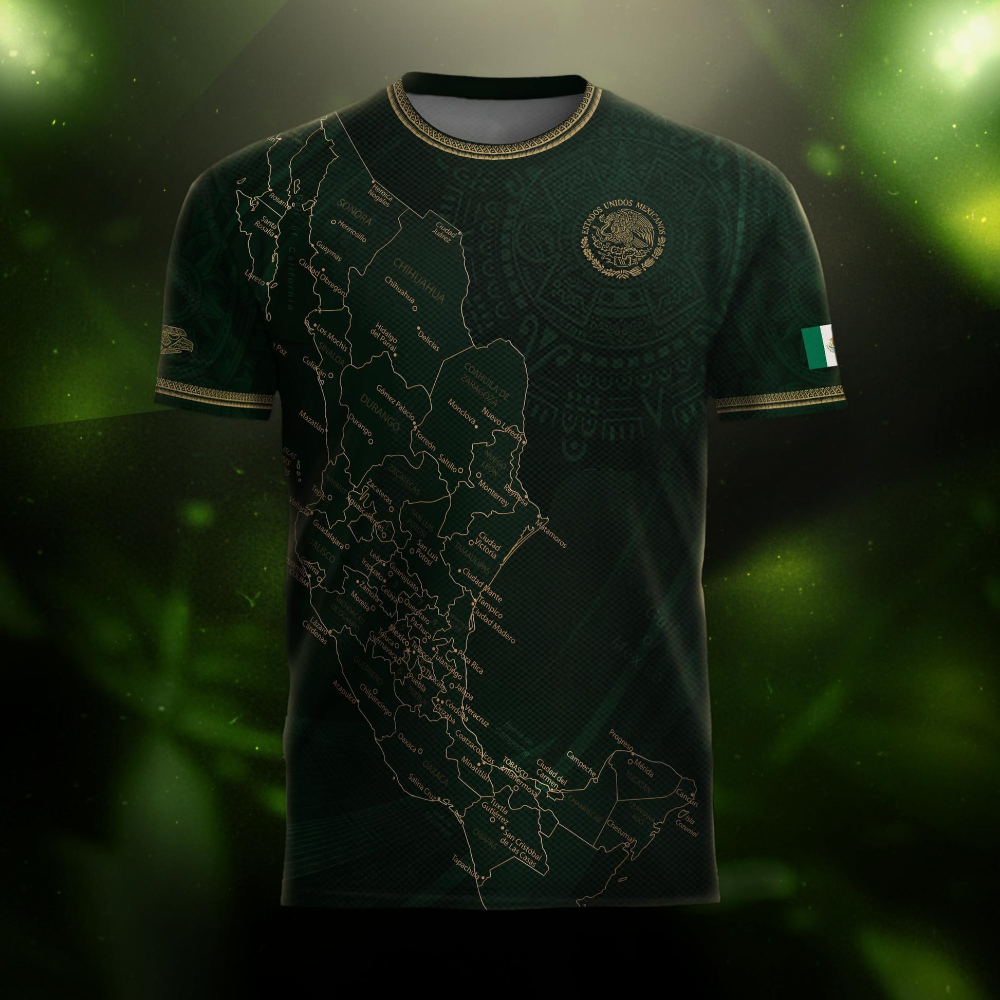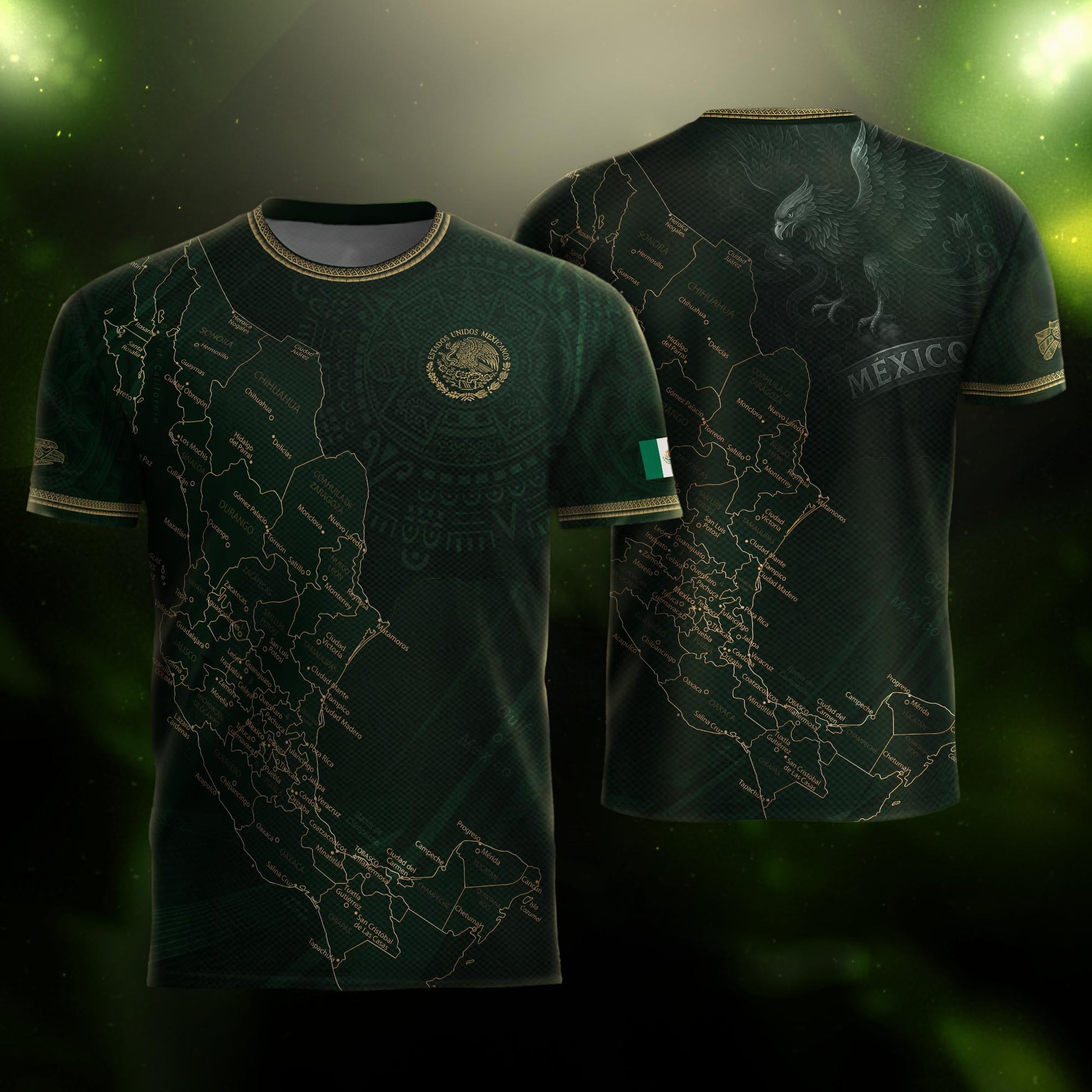 Stand for unity and heritage with this Mexico map jersey — deep green tones, Aztec patterns, and bold national pride.