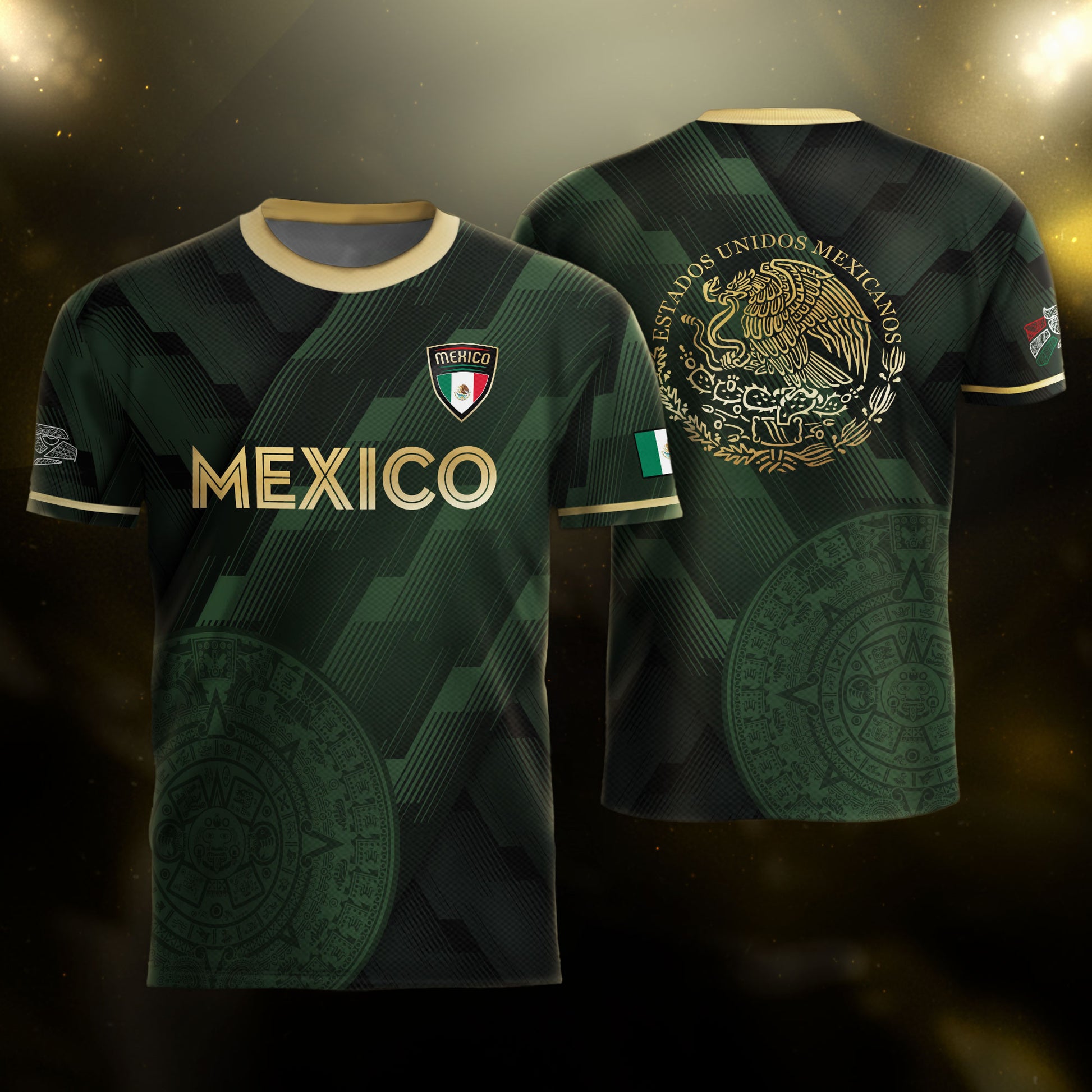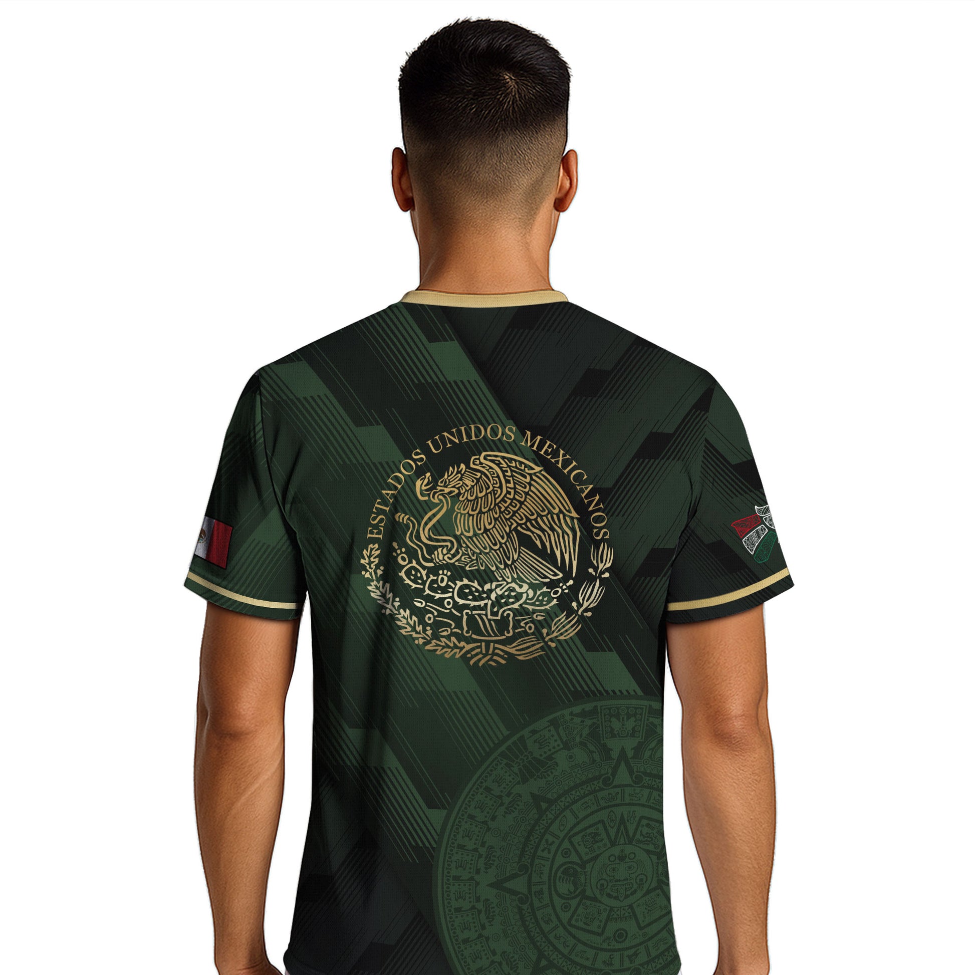 Celebrate Mexico’s legacy with this green soccer jersey featuring the golden Aztec Sunstone and national crest. A bold mix of heritage and modern football spirit.