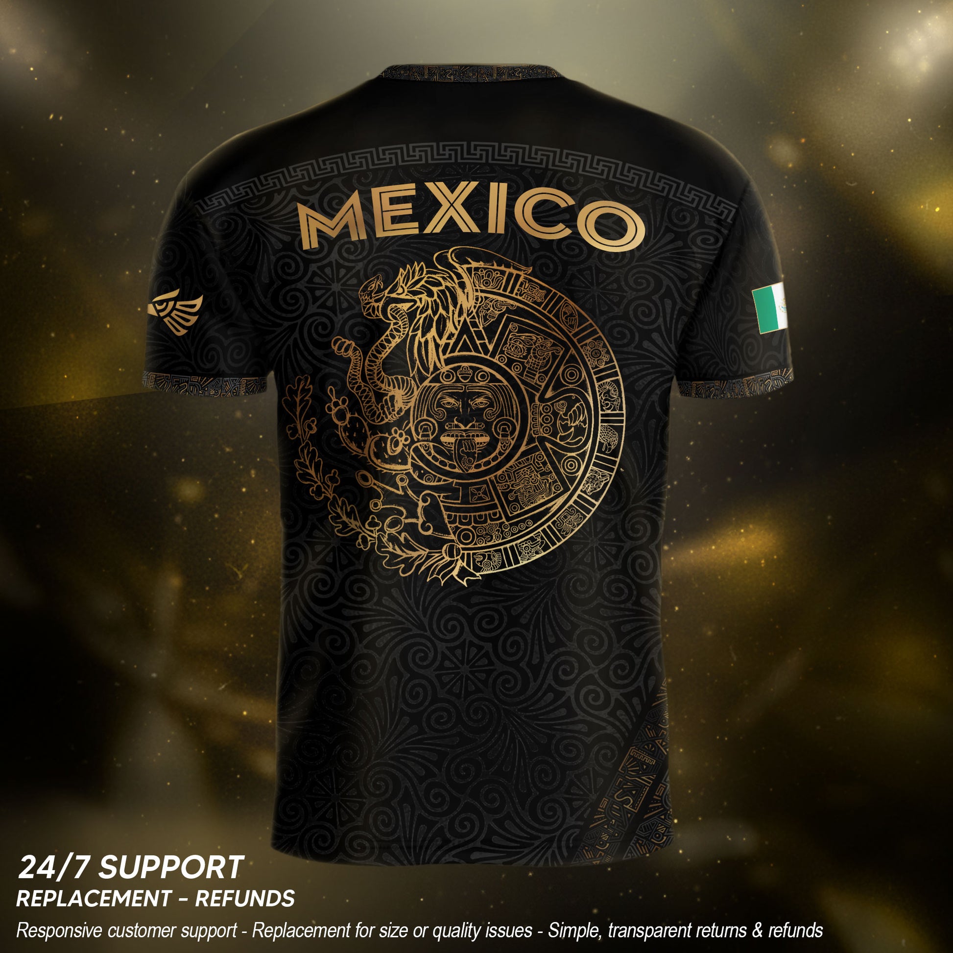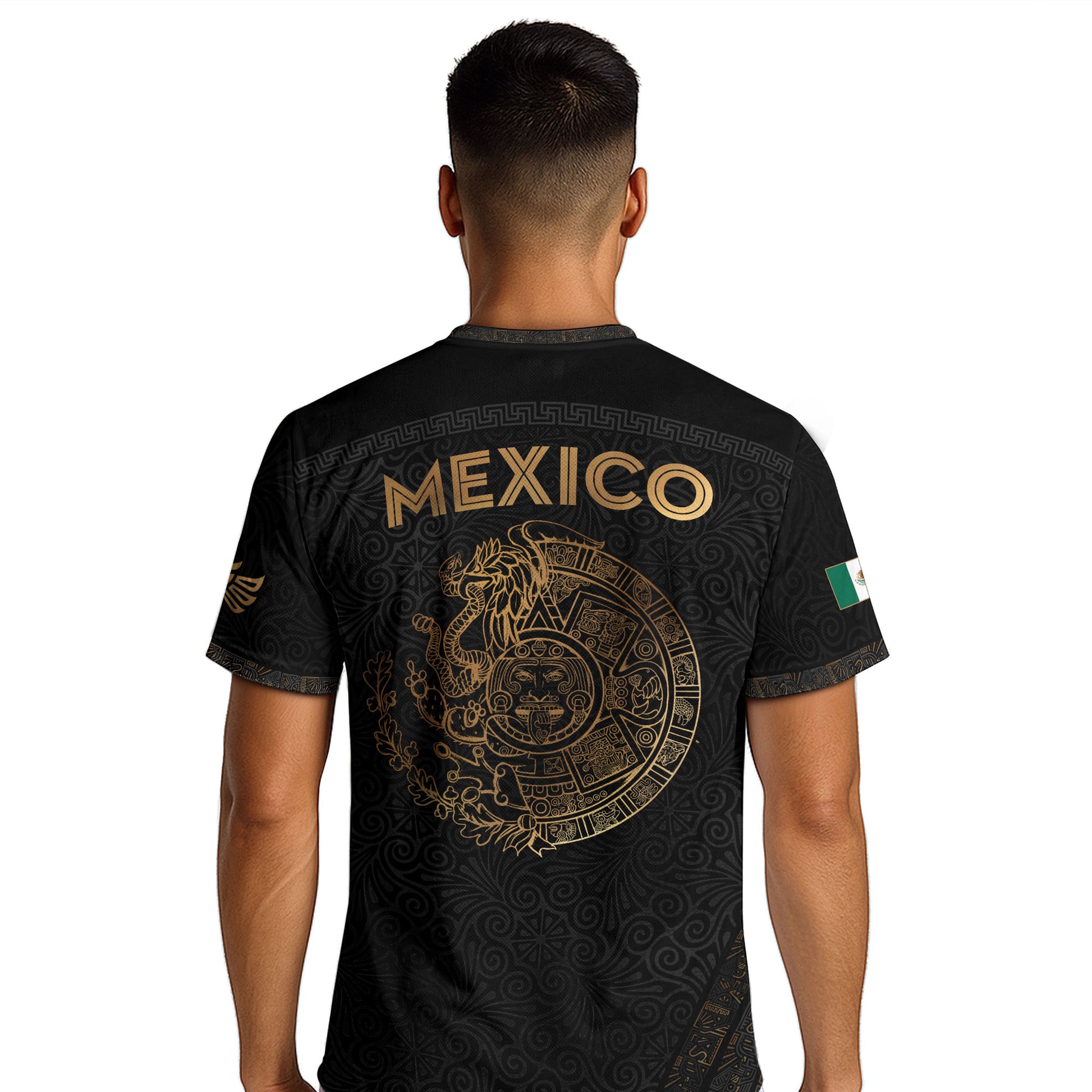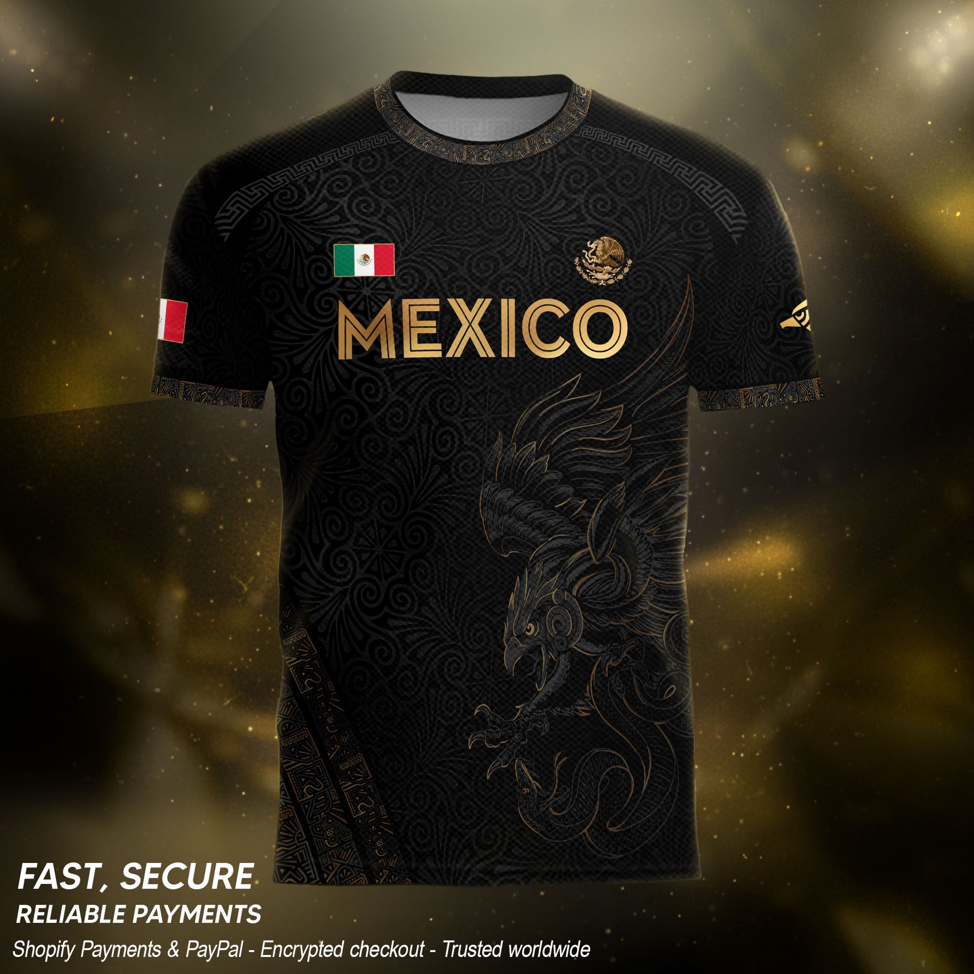 Featuring a bold eagle graphic paired with intricate floral patterns, this black and gold jersey highlights Mexican cultural artistry.