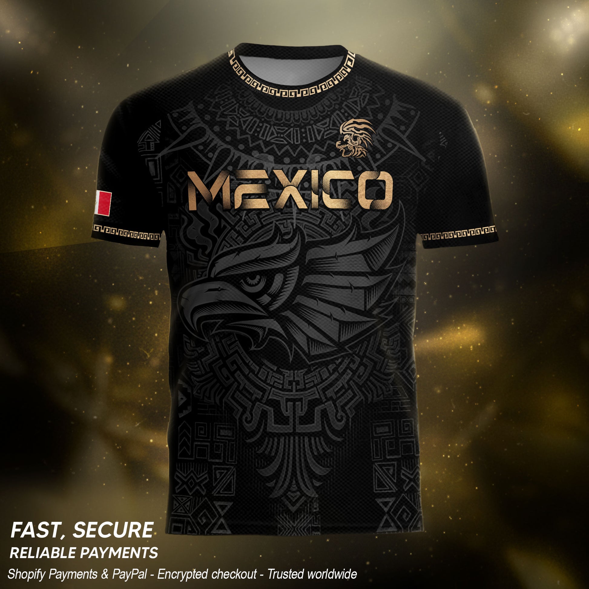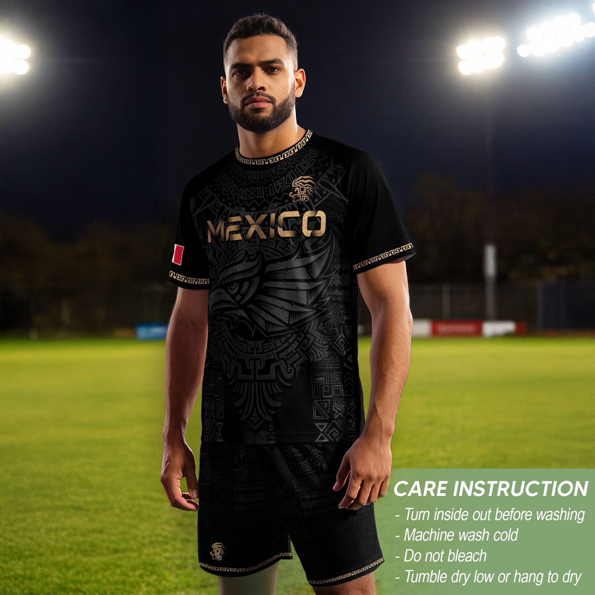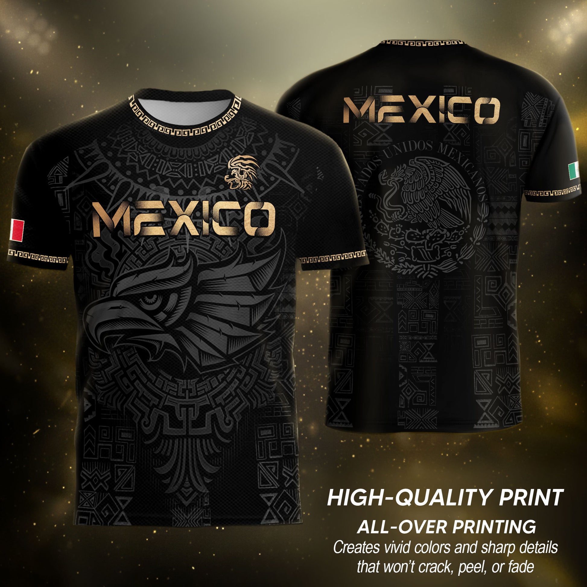 This black and gold jersey combines the Aztec Calendar with a bold eagle graphic inspired by Mexican heritage.