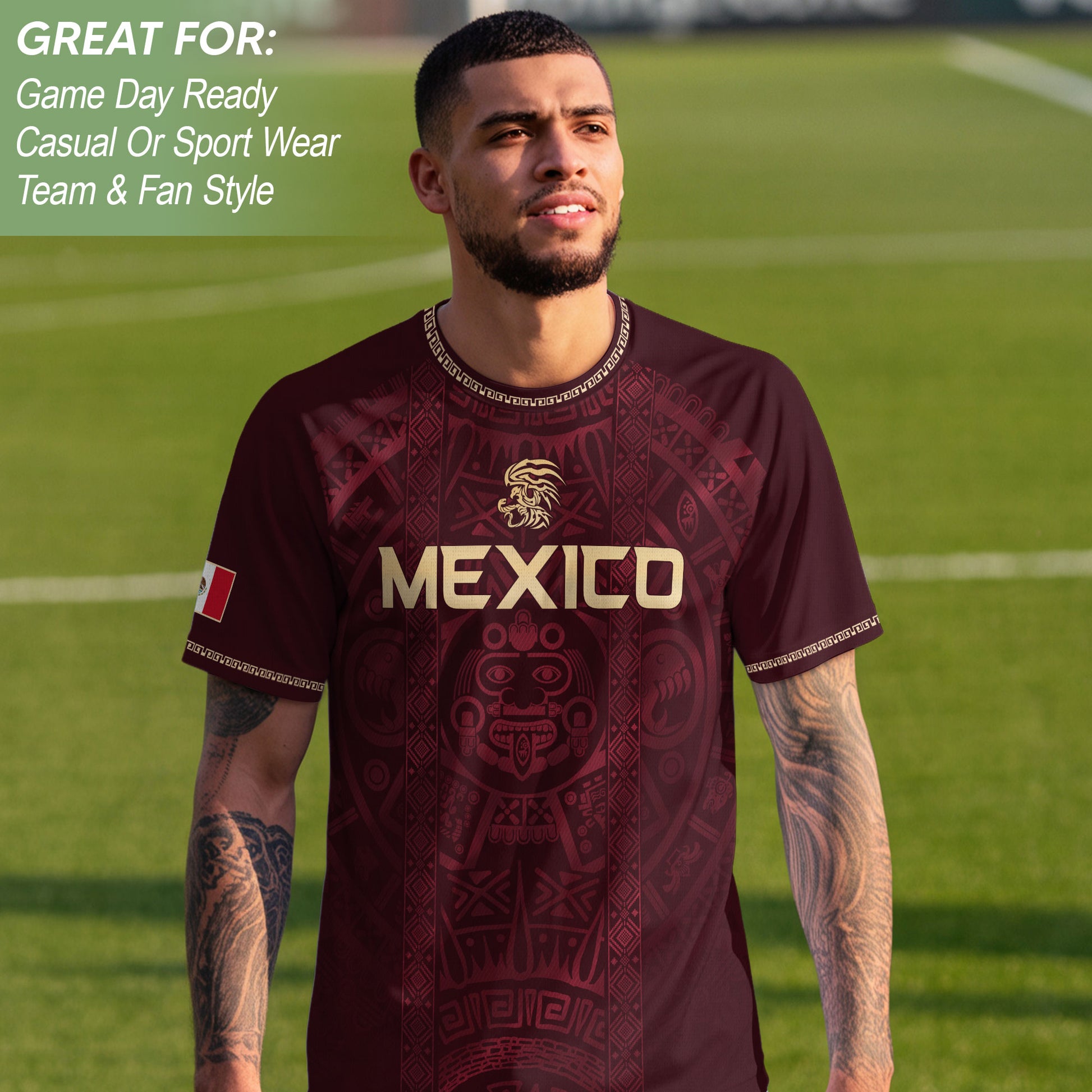 Mexico Heritage Orgullo Mexicano Maroon Burgundy Aztec Calendar Sun Stone Soccer Jersey