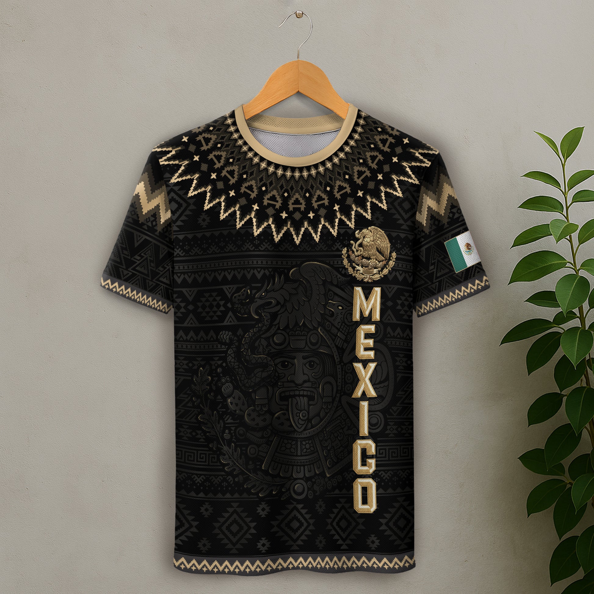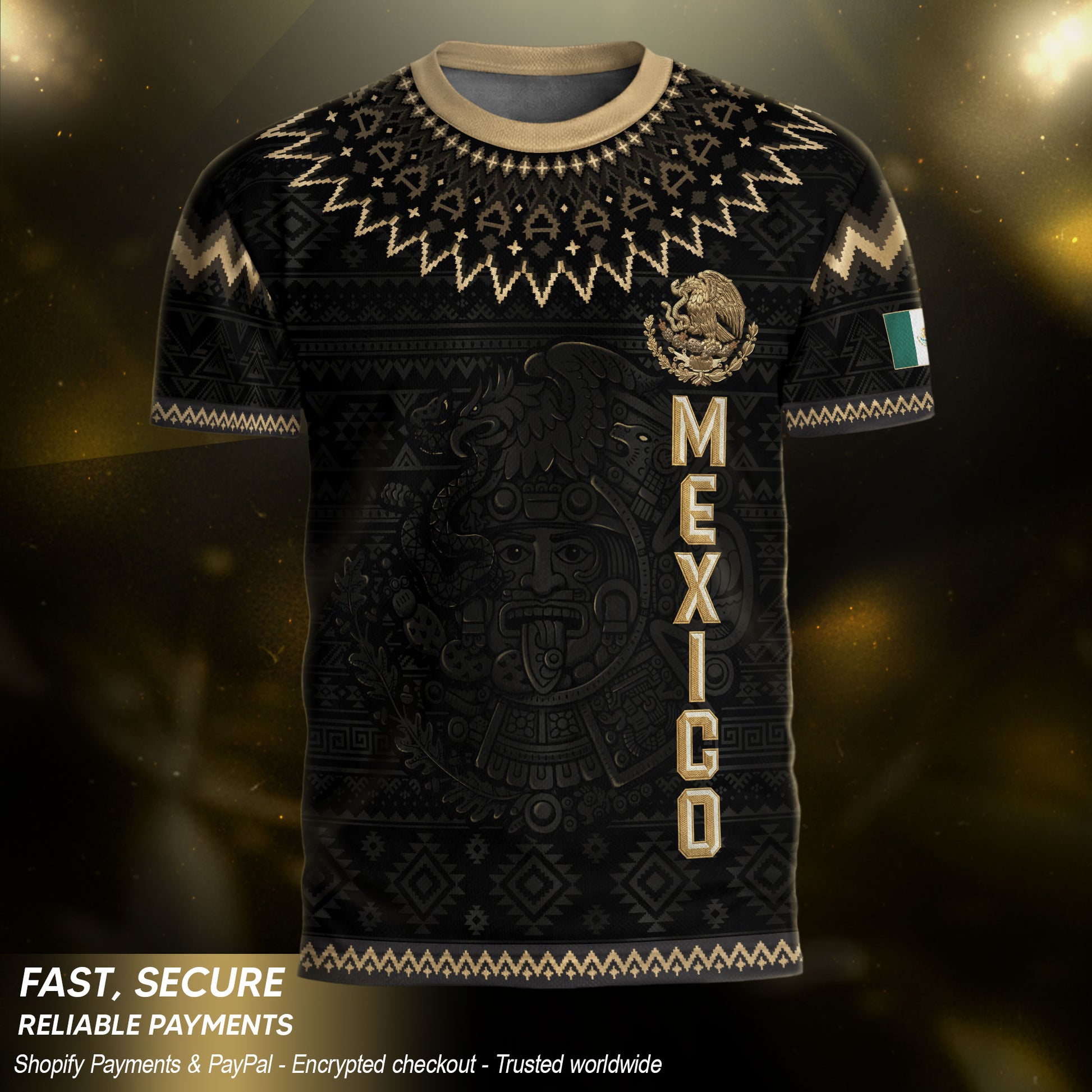 Show your love for Mexico with this Mexico Heritage Soccer Jersey, inspired by the strength and artistry of ancient Aztec culture. The bold black and gold design reflects rich history, cultural identity, and the powerful spirit passed down through generations.