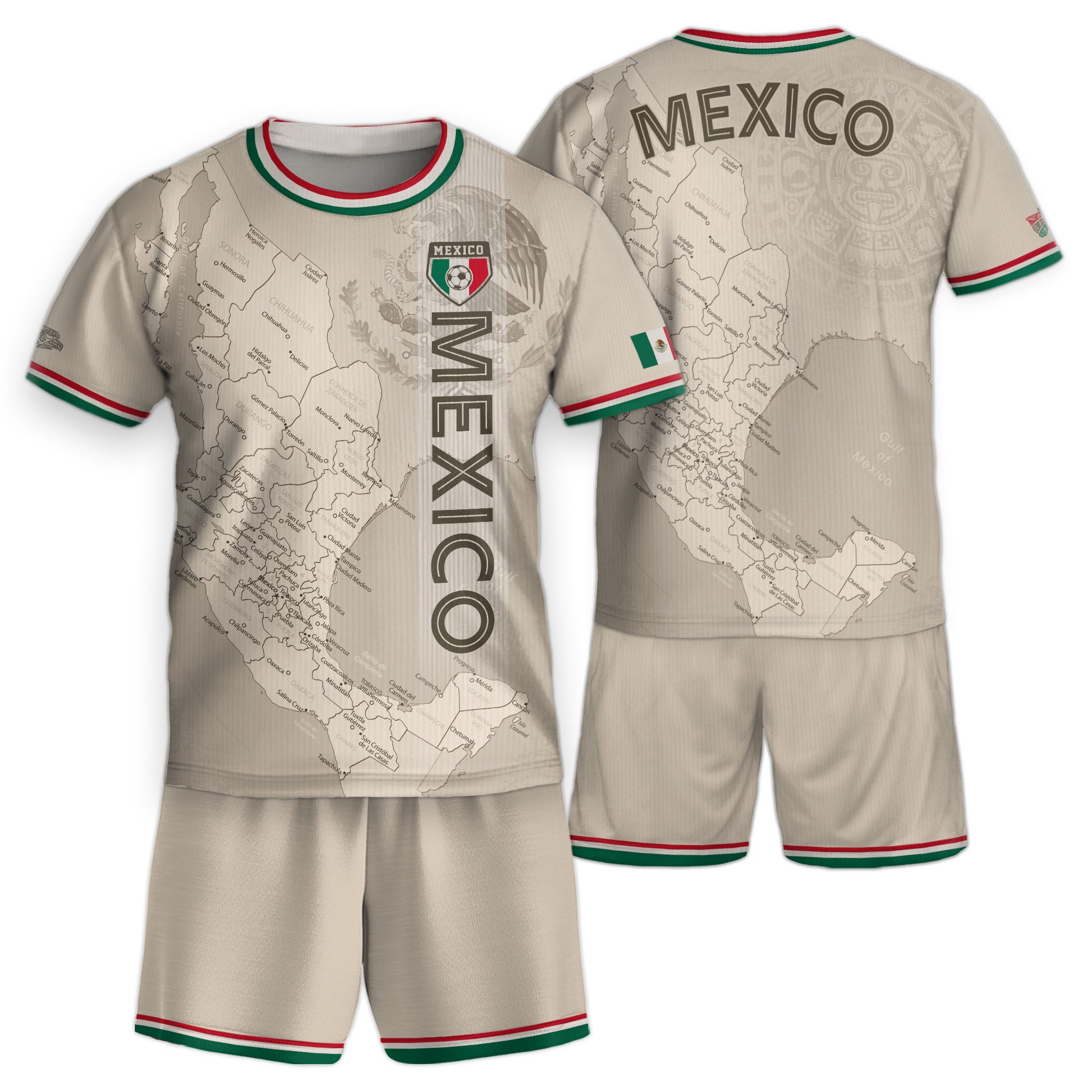 Beige soccer jersey for kids featuring Mexico map and Aztec-inspired design. Lightweight, breathable, and comfortable. Available as jersey only or full set with shorts.