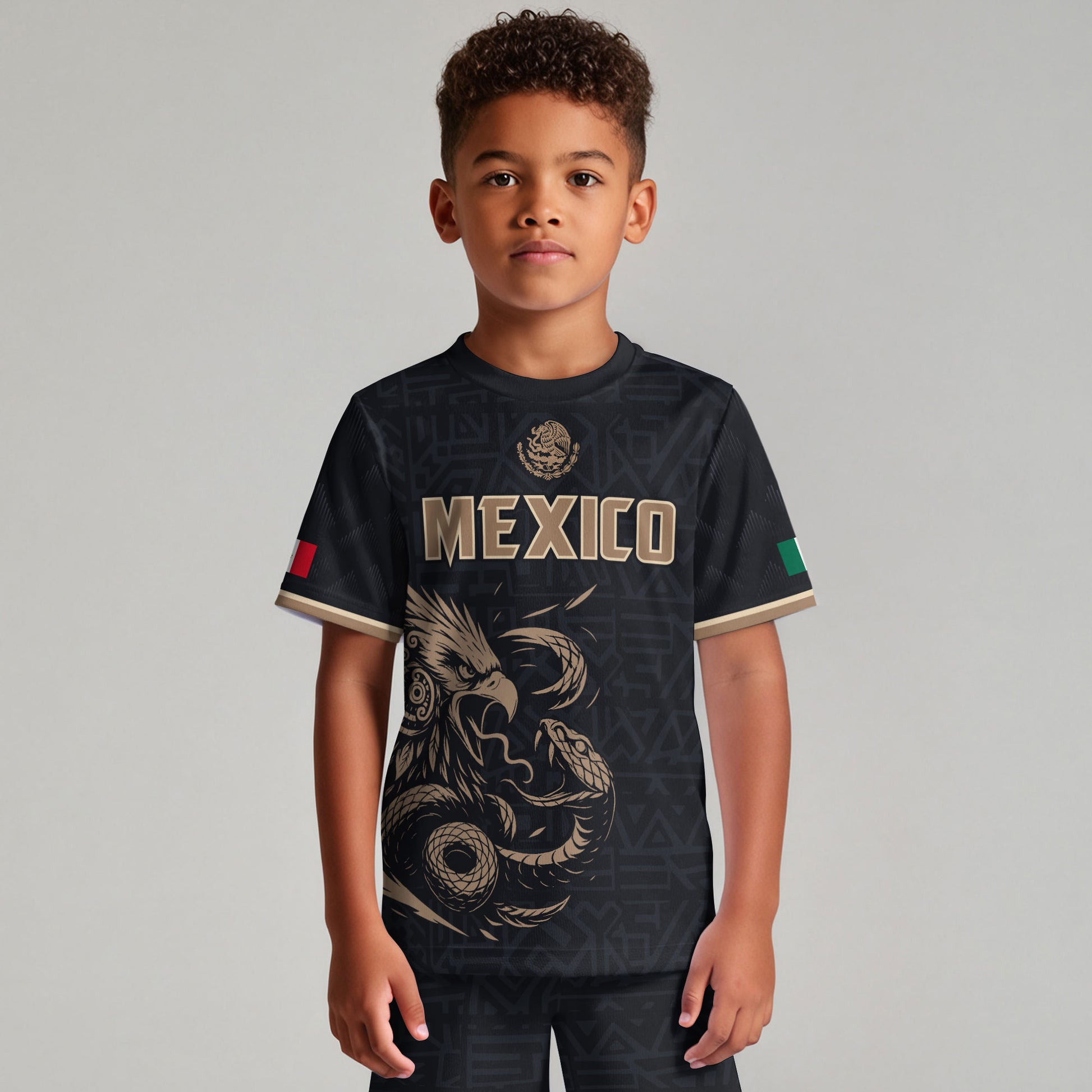Black kids soccer jersey with gold Aztec eagle and serpent artwork. Premium fabric, breathable fit, perfect for young Mexico fans.