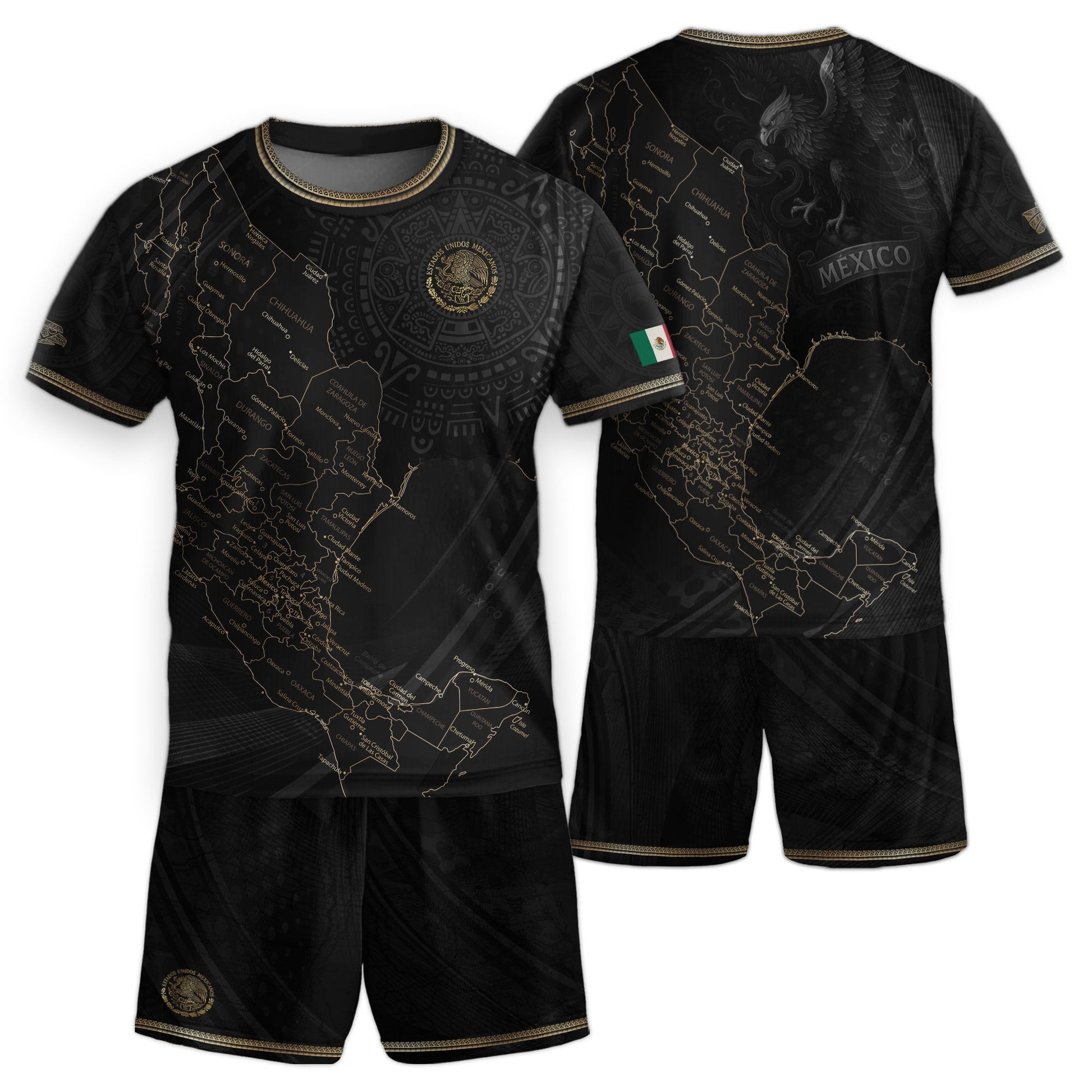 Black and gold kids soccer jersey featuring Mexico map with Aztec-inspired design and national crest. Lightweight, breathable, and perfect for young fans. Available as jersey only or full set with shorts.
