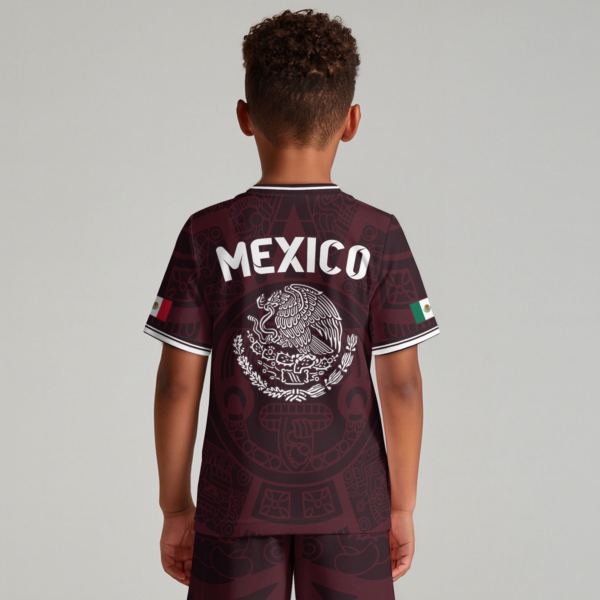 Burgundy kids soccer jersey with Aztec-inspired pattern and Mexico crest. Lightweight, breathable, and comfortable for young fans. Available as jersey only or full set with shorts.