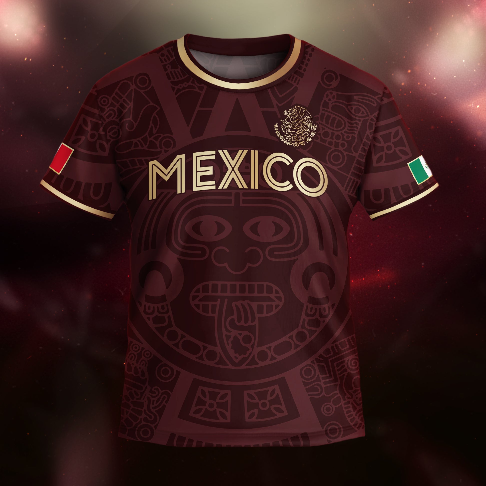 Mexico Kids Soccer Jersey in burgundy gold aztec calendar eagle design. Soft breathable jersey inspired by Mexico heritage and cultural art.