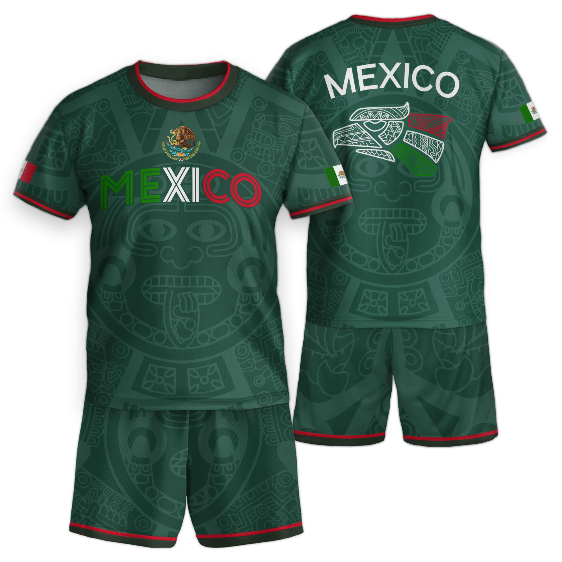 Green kids soccer jersey with Aztec-inspired pattern and Mexico flag colors. Lightweight, breathable, and perfect for young fans. Available as jersey only or full set with shorts.
