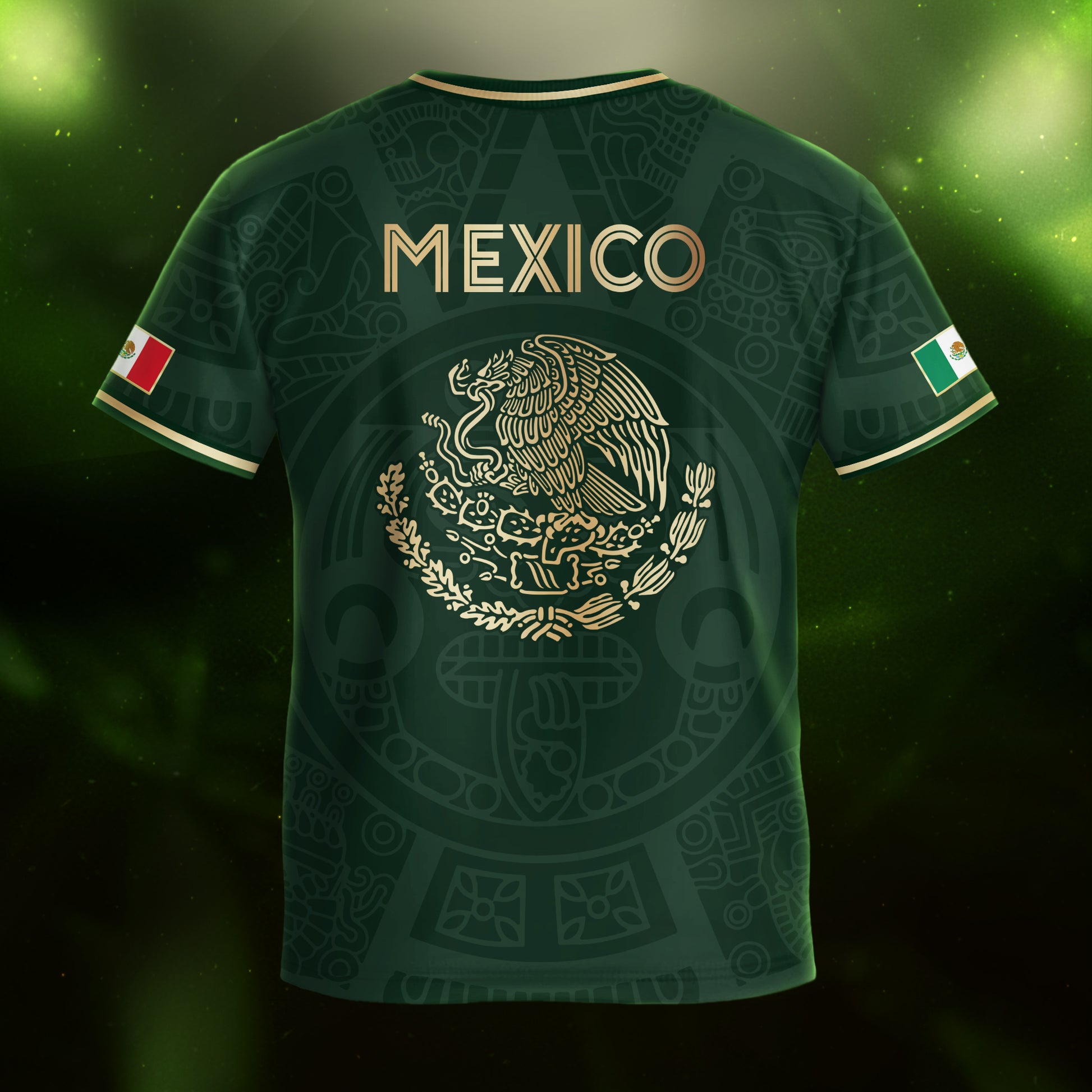 Mexico Kids Soccer Jersey in green gold aztec calendar design. Lightweight and breathable shirt inspired by Mexican culture and national pride.