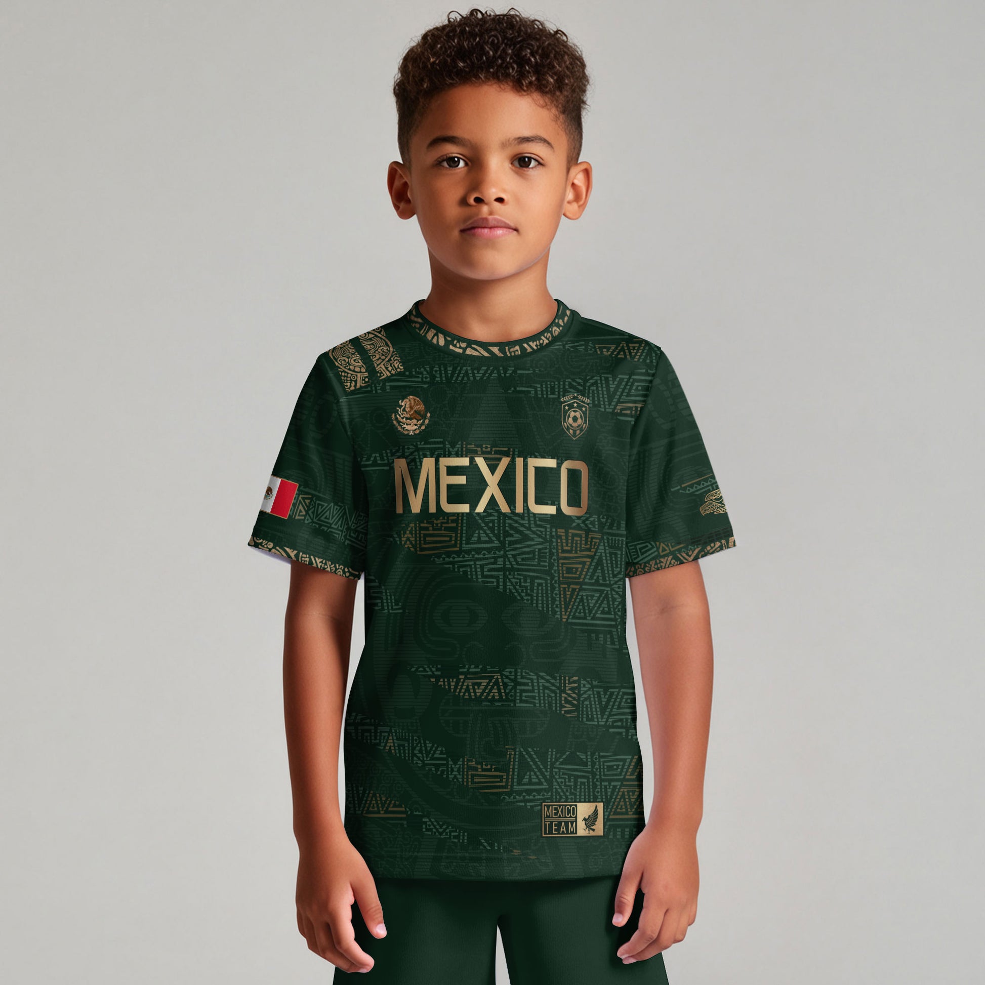 Green and gold kids soccer jersey with Aztec-inspired pattern and Mexico crest. Lightweight, breathable, and perfect for young fans. Available as jersey only or full set with shorts.