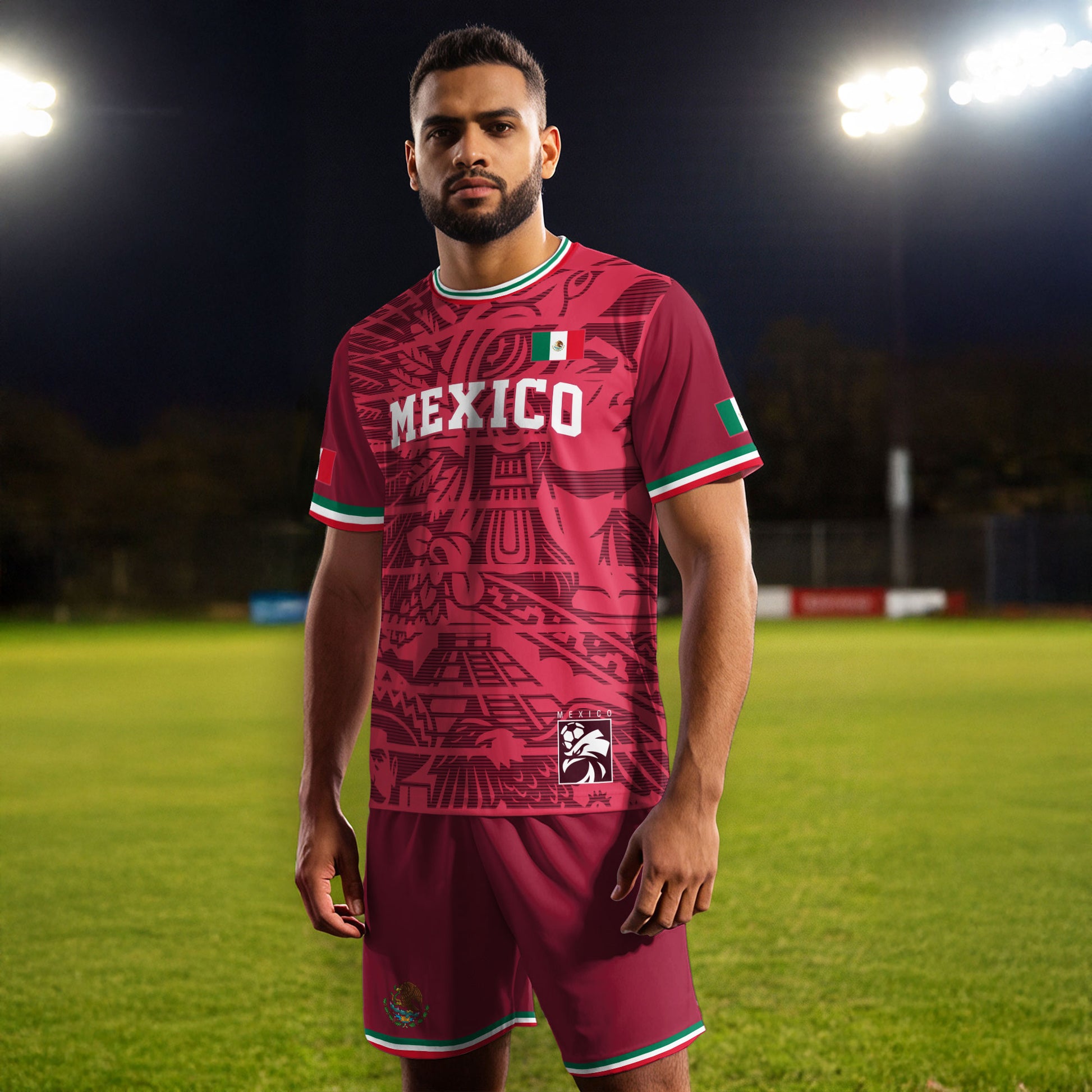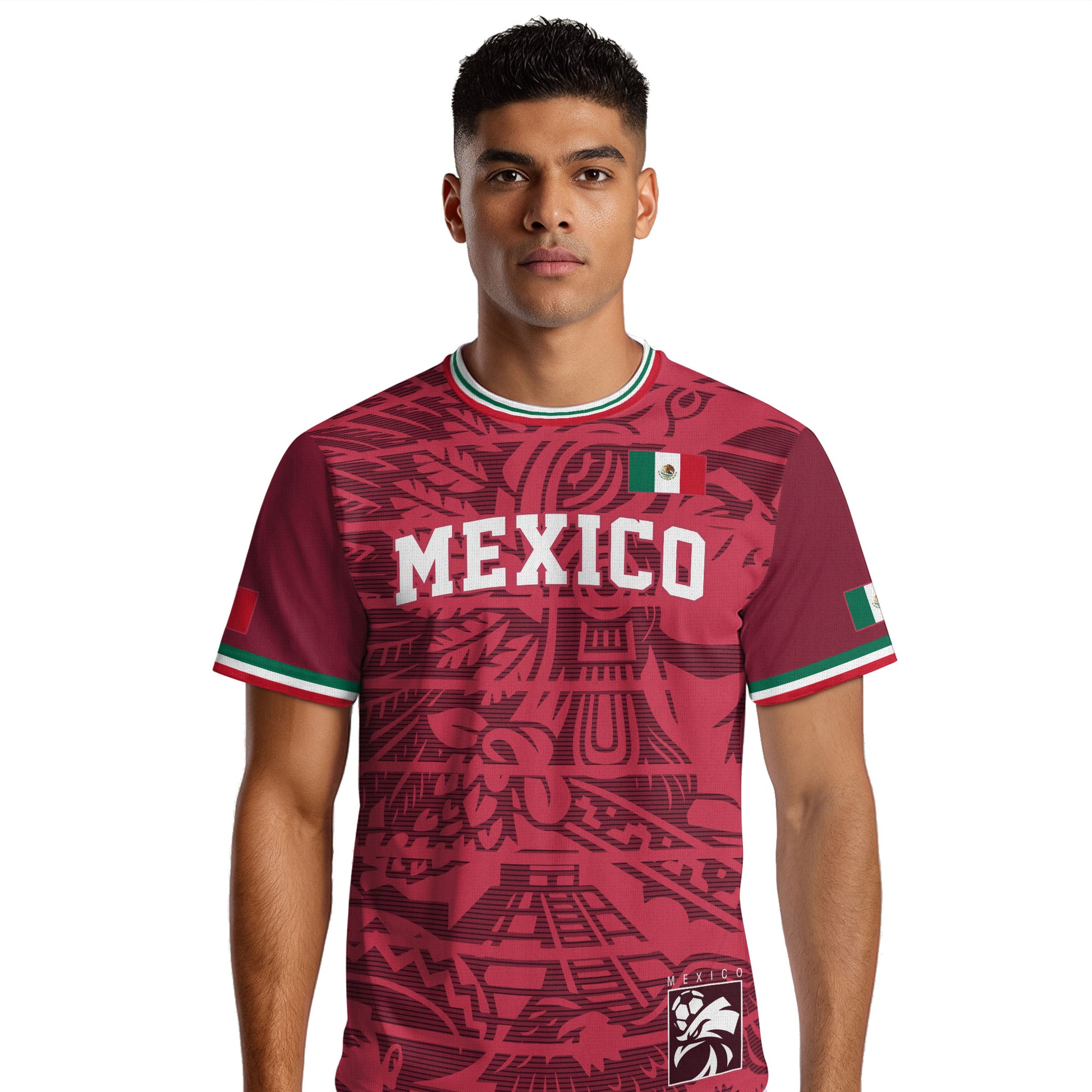 Stand proud for México with this red Aztec-pattern soccer jersey — bold eagle design, tricolor accents, and warrior energy.